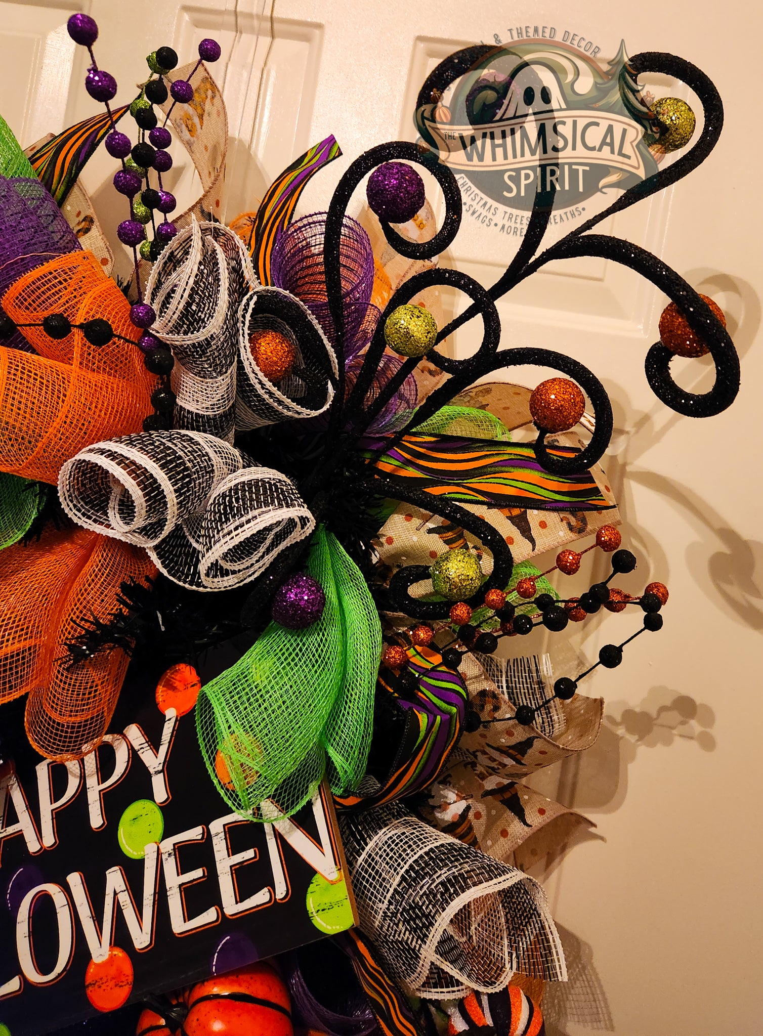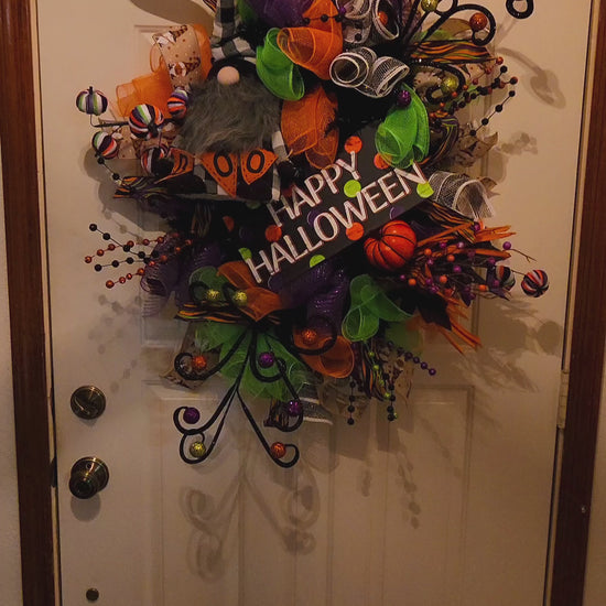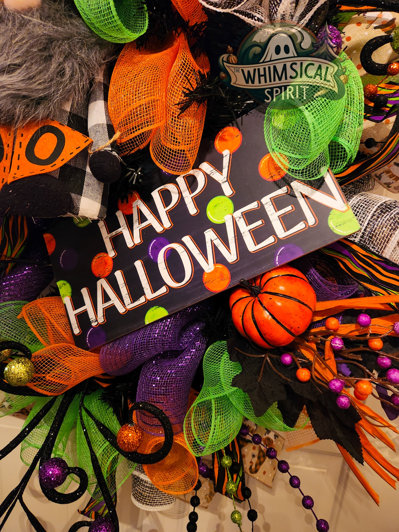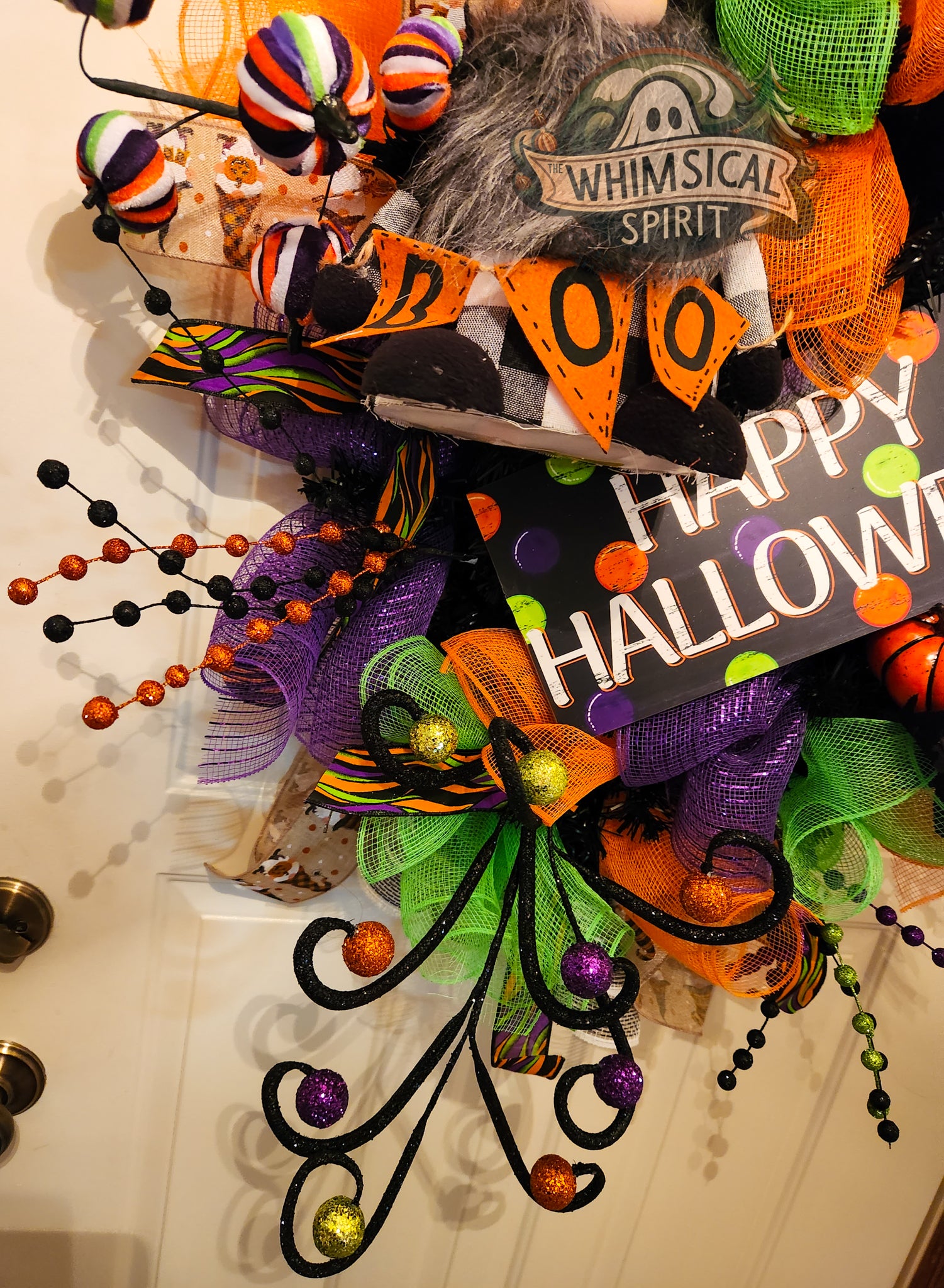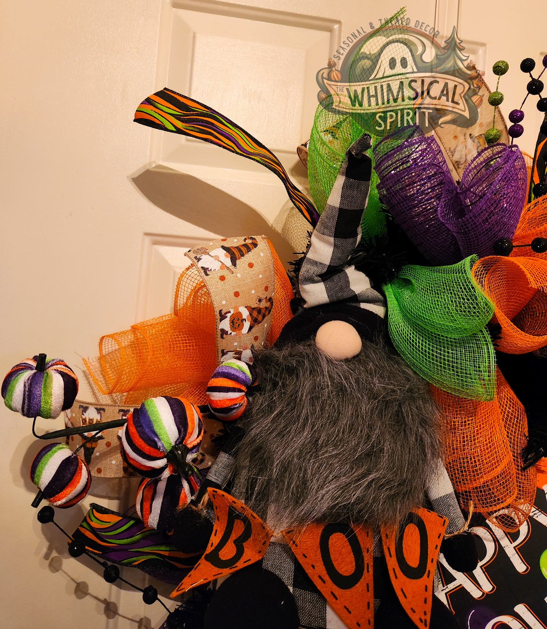 Bring a dash of whimsy and a sprinkle of spook to your doorway with All Hallows Gnome. This festive Halloween wreath bursts with bold pops of purple, orange, green, and black, swirling together in a playful tangle of mesh, ribbons, and glittered accents. At its heart, a charming gnome—dressed for mischief—welcomes guests, surrounded by candy-colored baubles, pumpkins, and swirling curls of enchantment. Equal parts spooky and sweet, this one-of-a-kind wreath is the perfect way to celebrate the magic of All Hallows’ Eve while giving your home a warm, whimsical welcome.