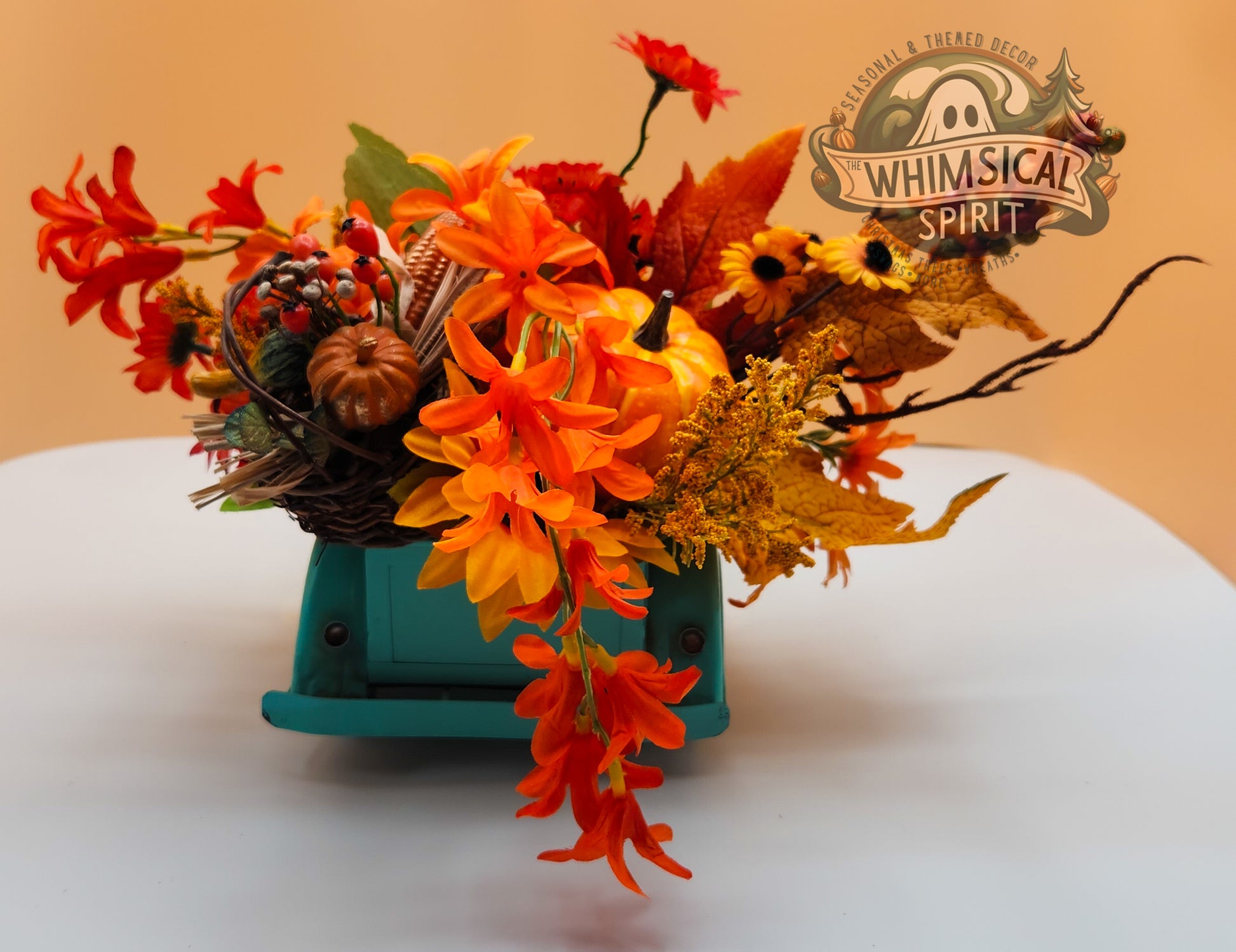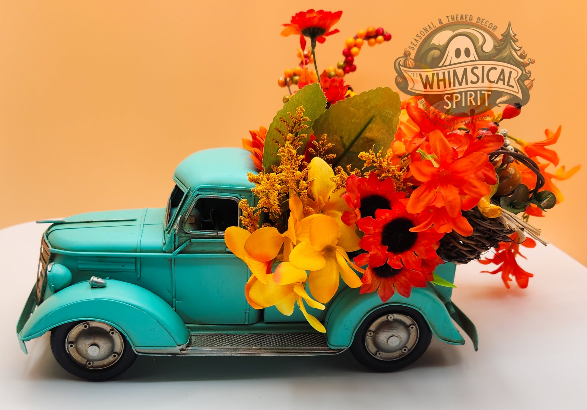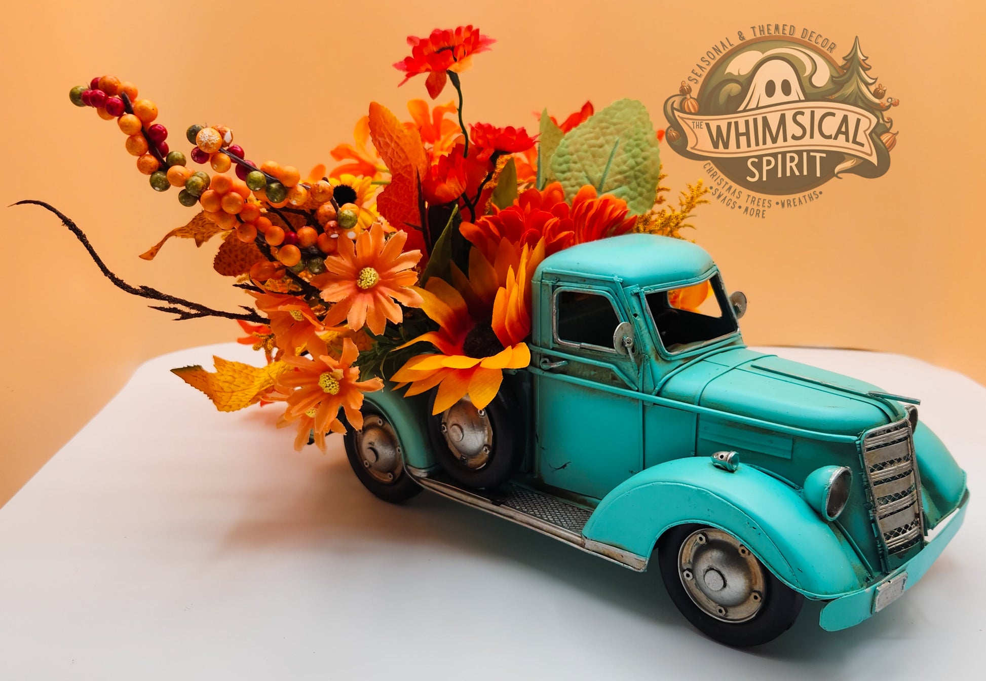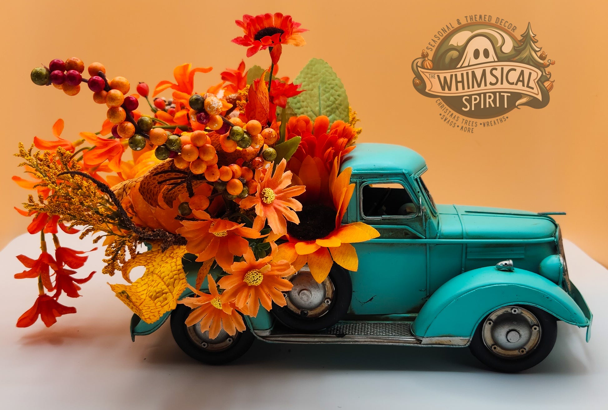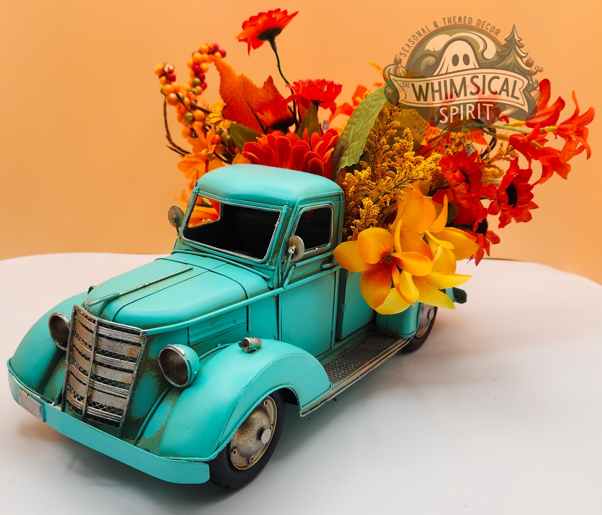 Bring the spirit of the season home with Autumn Adventures! This charming vintage-style teal pickup truck is overflowing with vibrant fall blooms, berries, and foliage in rich harvest tones. Bursting with warmth and rustic charm, it’s the perfect centerpiece to brighten your table, mantle, or entryway. Whether you’re celebrating the season or gifting a touch of autumn cheer, this playful piece delivers all the beauty of fall in one delightful ride.