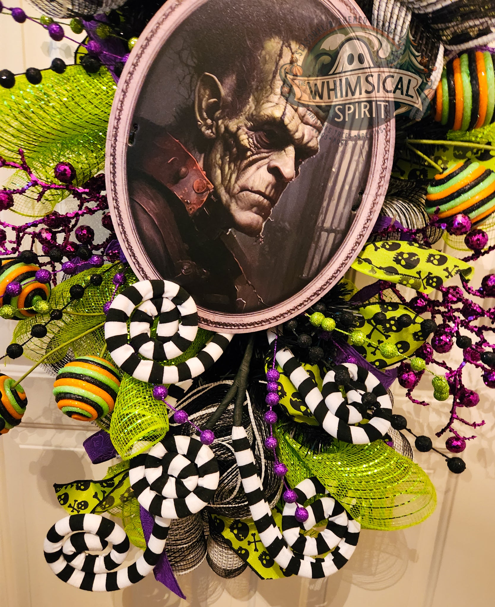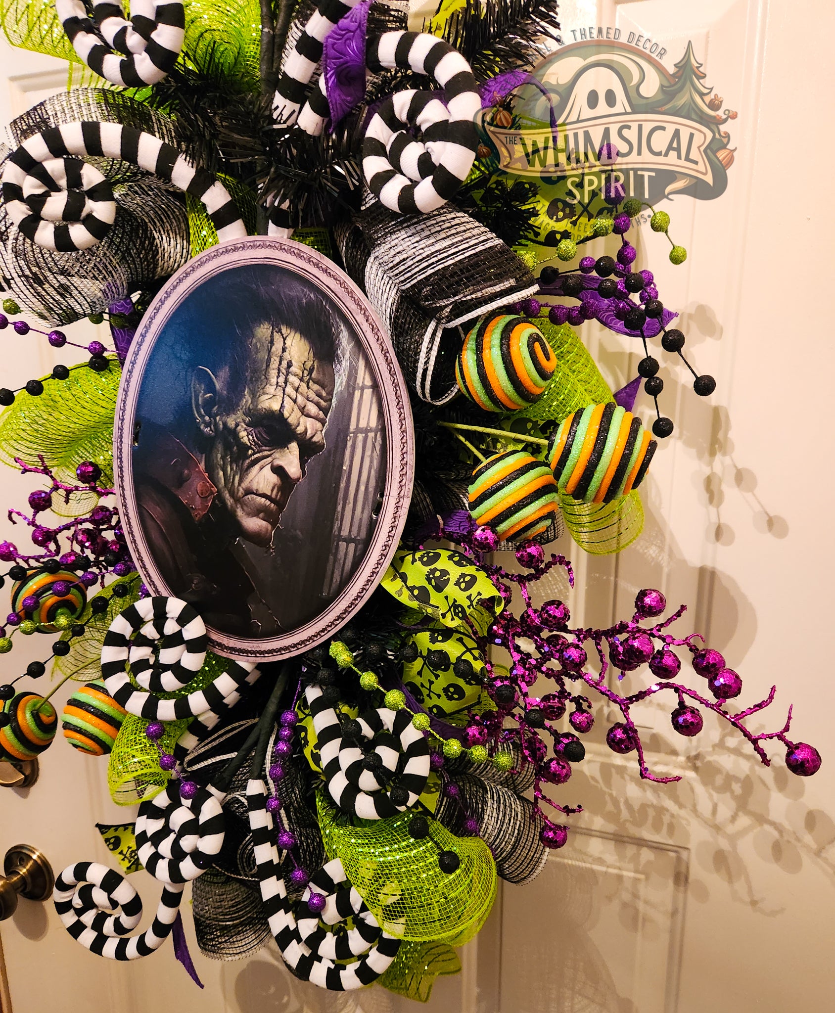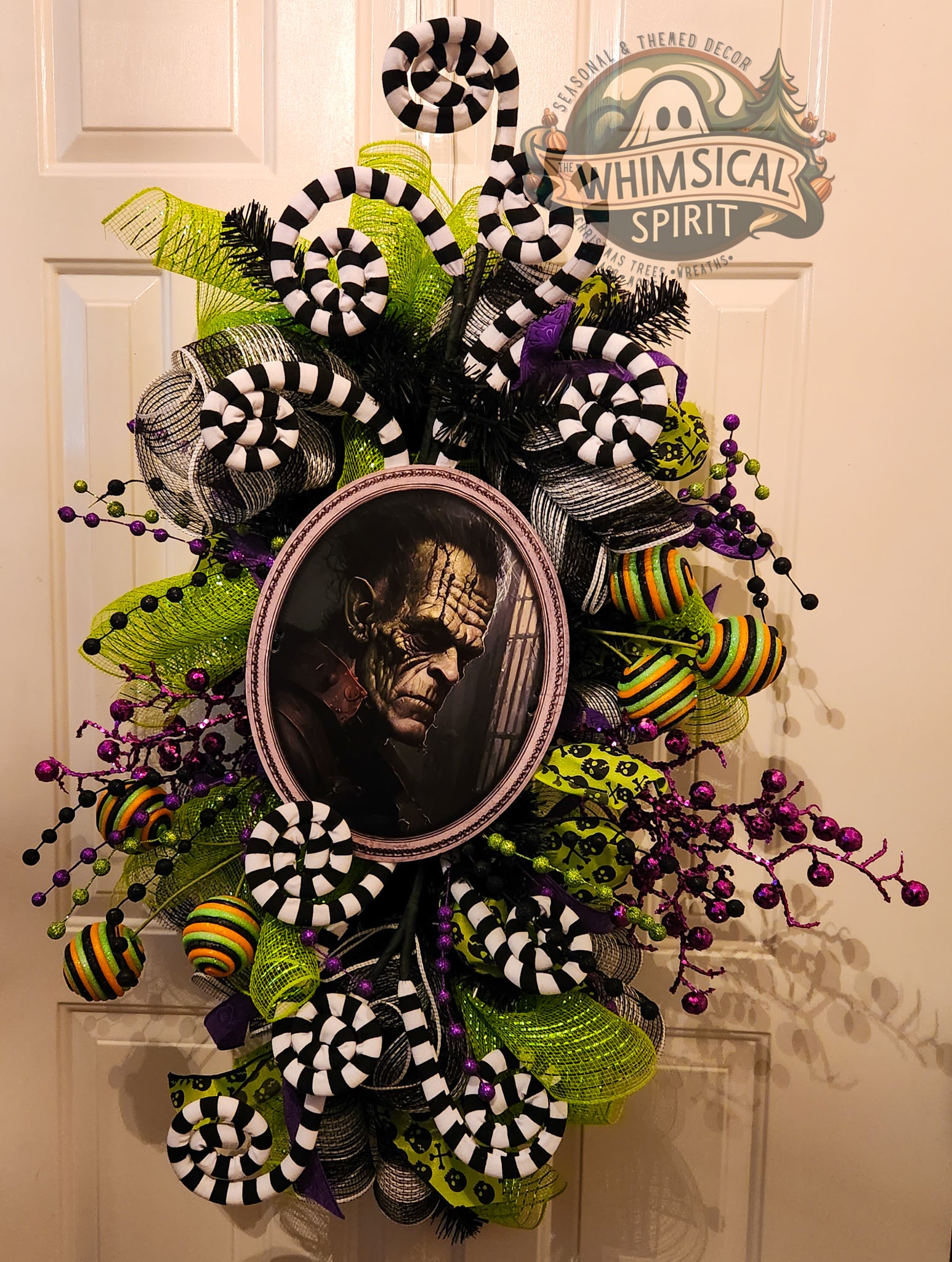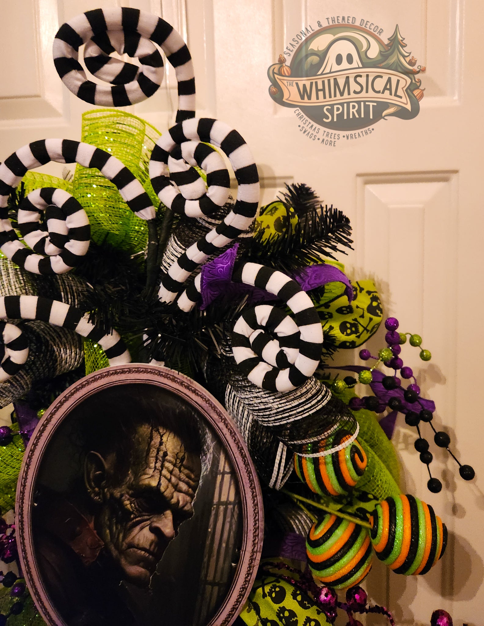 Bolt and Bewitchment crackles with eerie charm, bringing Frankenstein’s legendary monster to life in a swirl of Halloween magic. Centered around a striking portrait of the iconic creature, this swag bursts with bold details—black-and-white striped candies, spiraling lollipops, glittering beads, and pops of electric green mesh entwined with purple accents. Hang it on your door or wall to spark conversation, enchant trick-or-treaters, and electrify your haunted home with spooky sophistication.