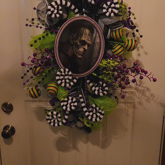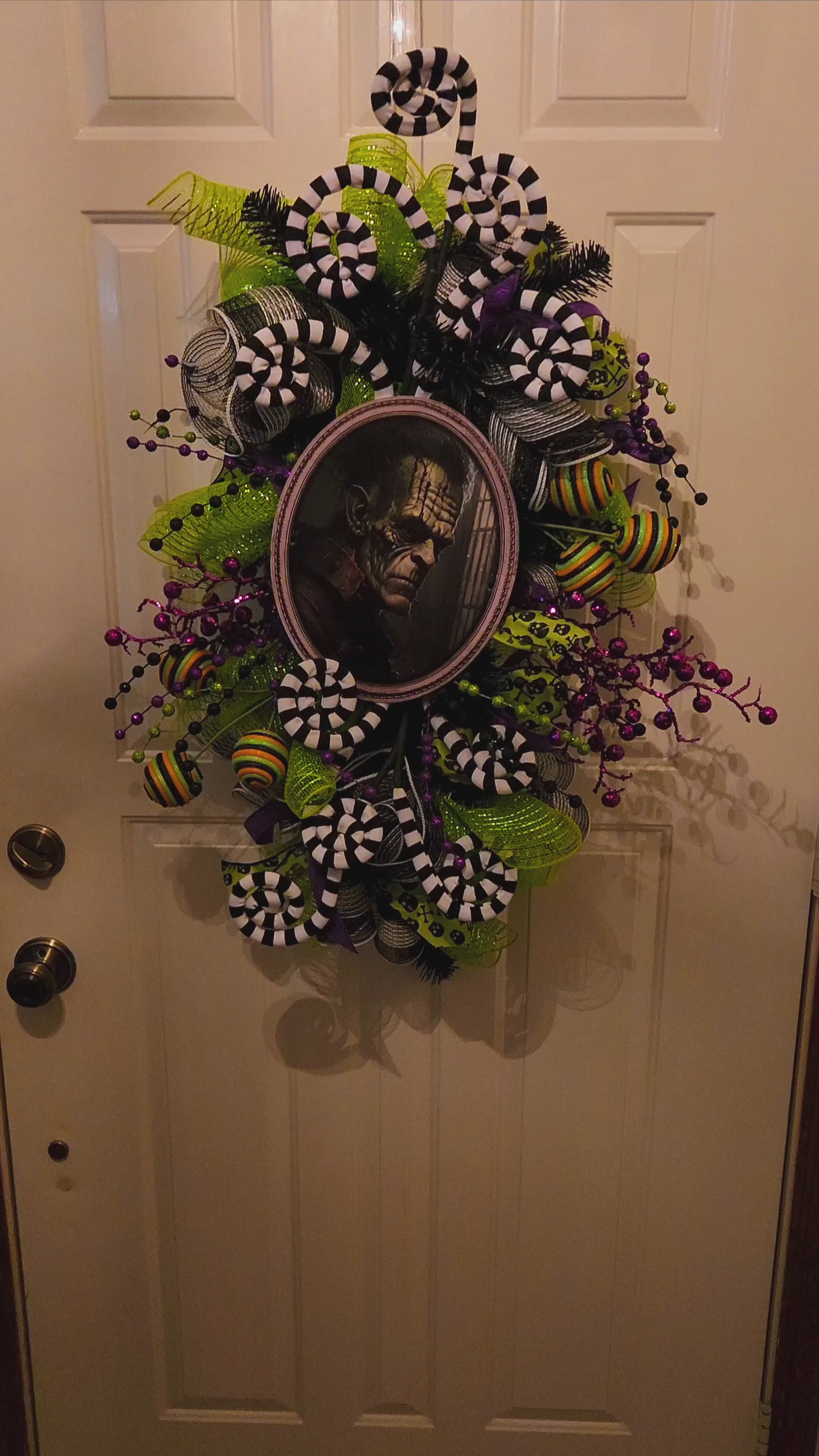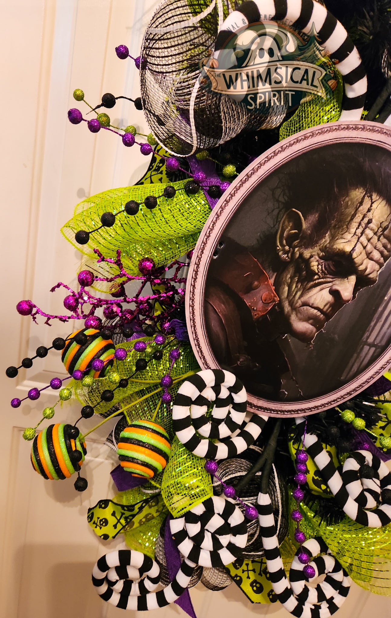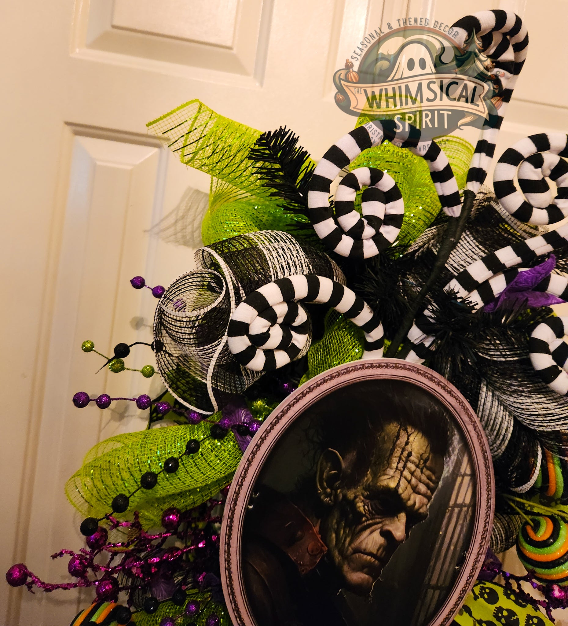 Bolt and Bewitchment crackles with eerie charm, bringing Frankenstein’s legendary monster to life in a swirl of Halloween magic. Centered around a striking portrait of the iconic creature, this swag bursts with bold details—black-and-white striped candies, spiraling lollipops, glittering beads, and pops of electric green mesh entwined with purple accents. Hang it on your door or wall to spark conversation, enchant trick-or-treaters, and electrify your haunted home with spooky sophistication.