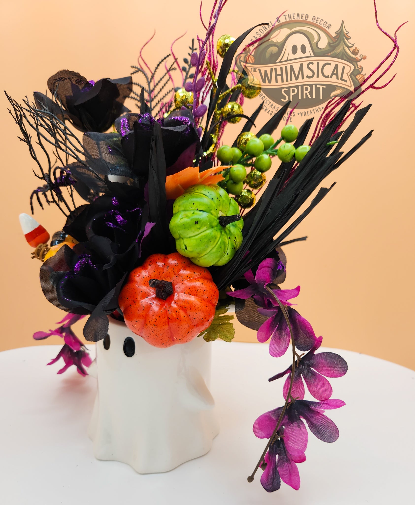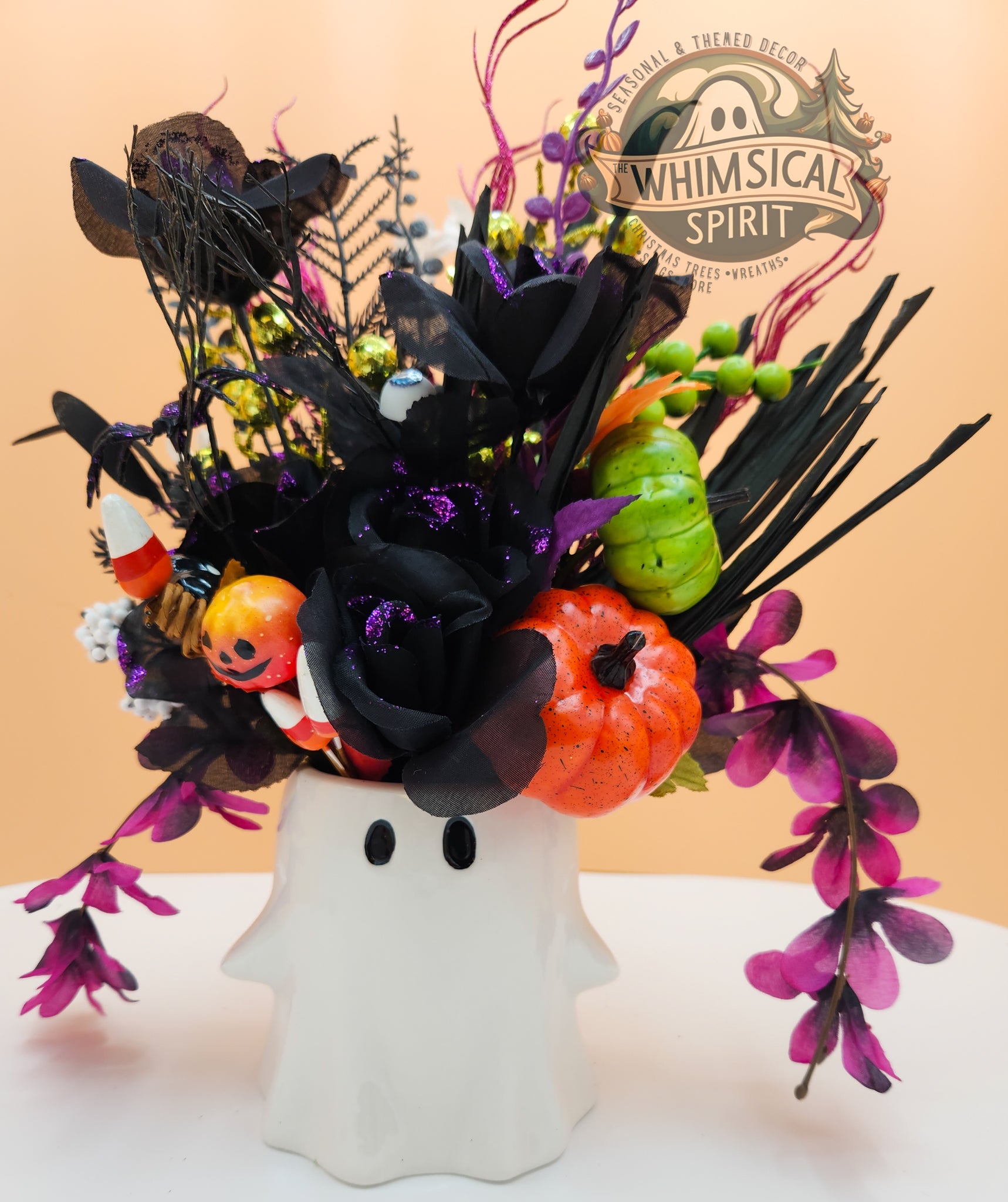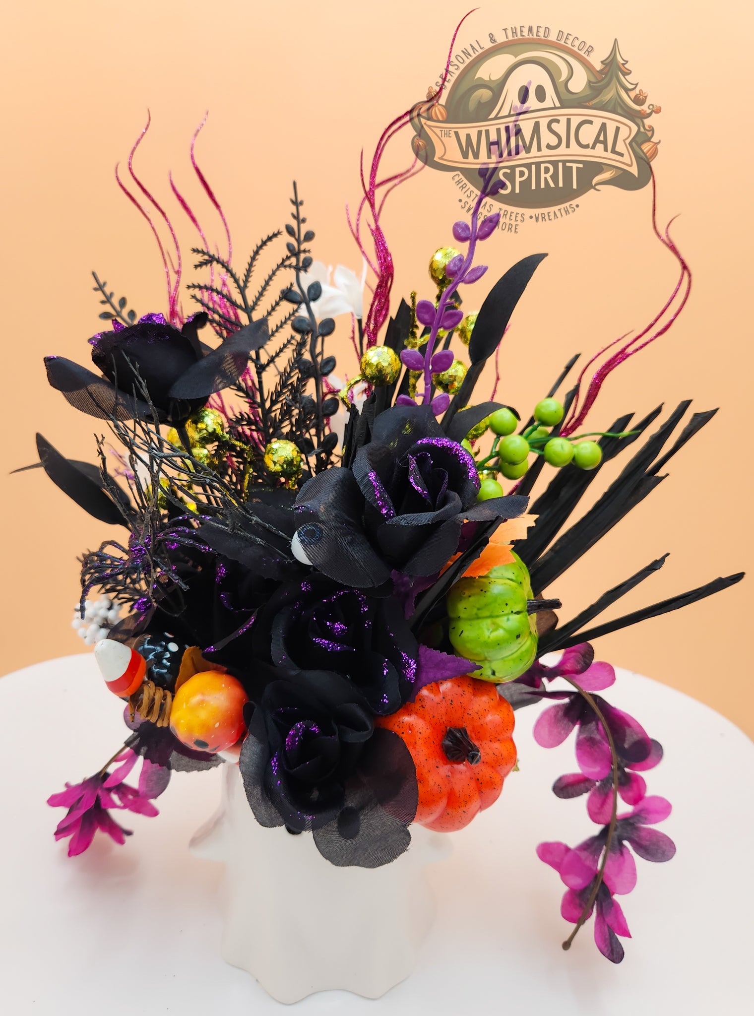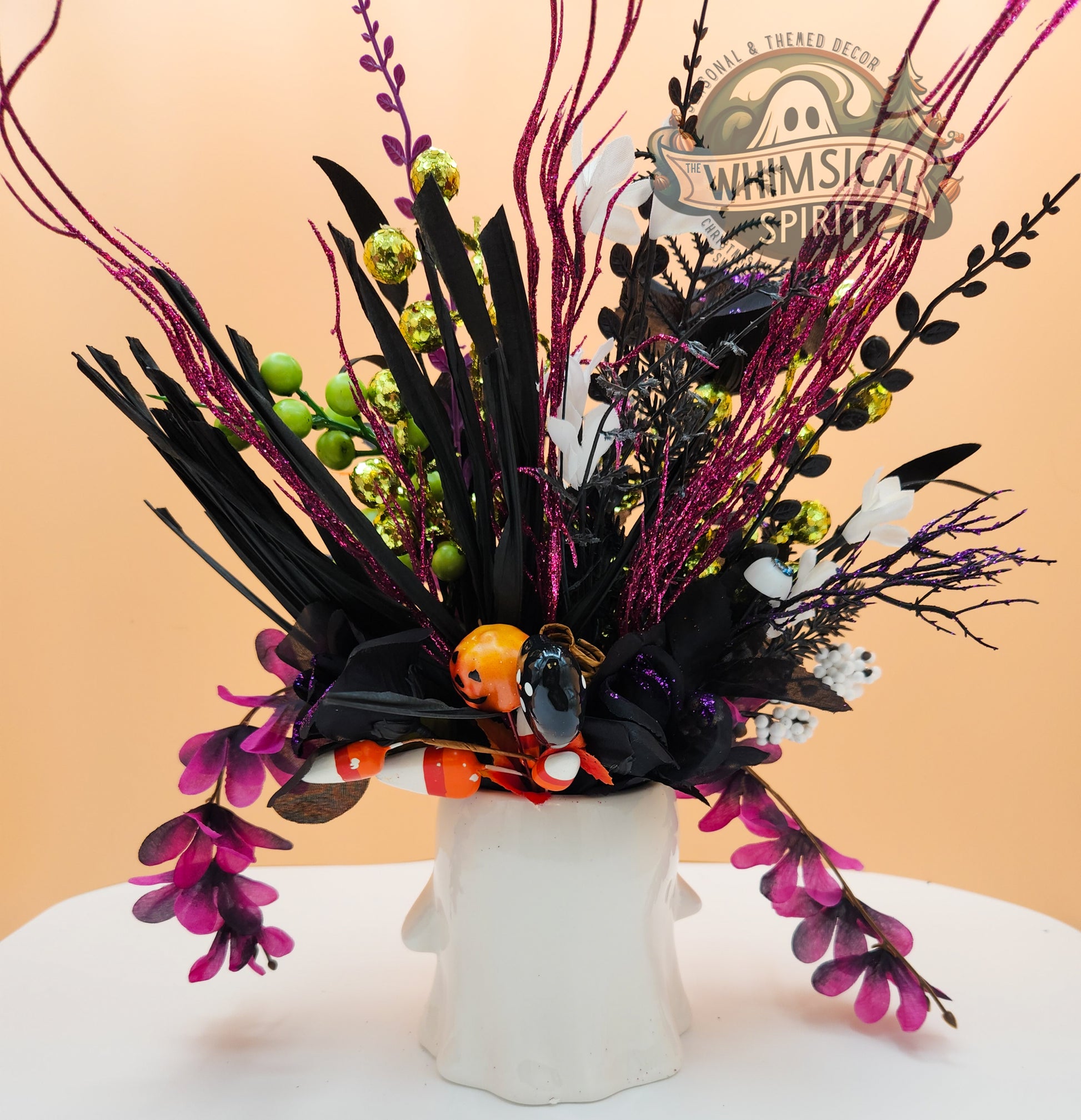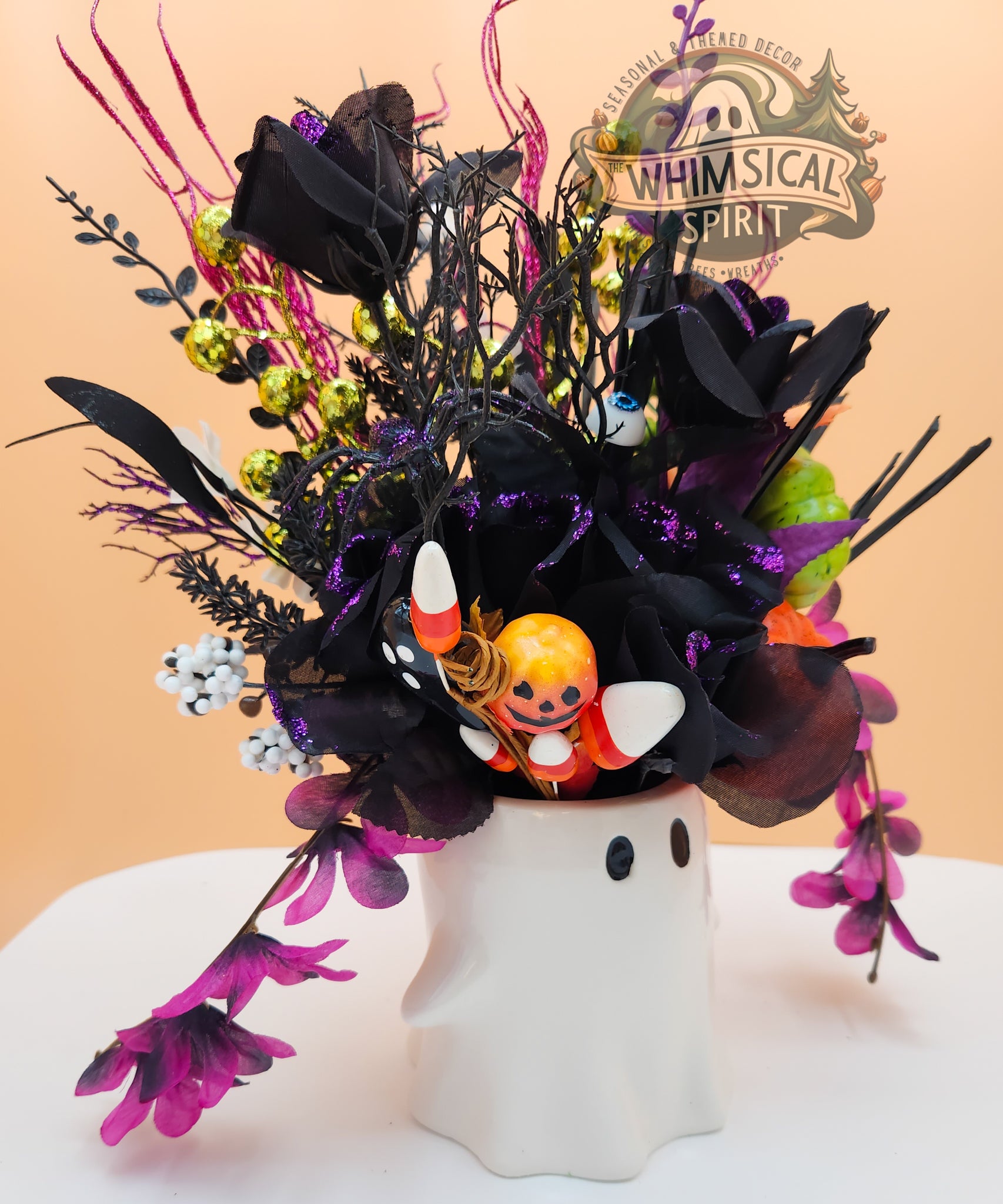 Add a playful pop of Halloween cheer to your home with Boo-tiful Blooms, a festive centerpiece blending spooky fun with floral beauty. Featuring deep black blooms, Halloween hues, and charming accents, this piece brings a cute and cozy vibe to your table, mantel, or entryway all spooky season long. Perfect for those who love celebrating Halloween with a touch of whimsy, Boo-tiful Blooms keeps your space looking delightfully boo-tiful all October.