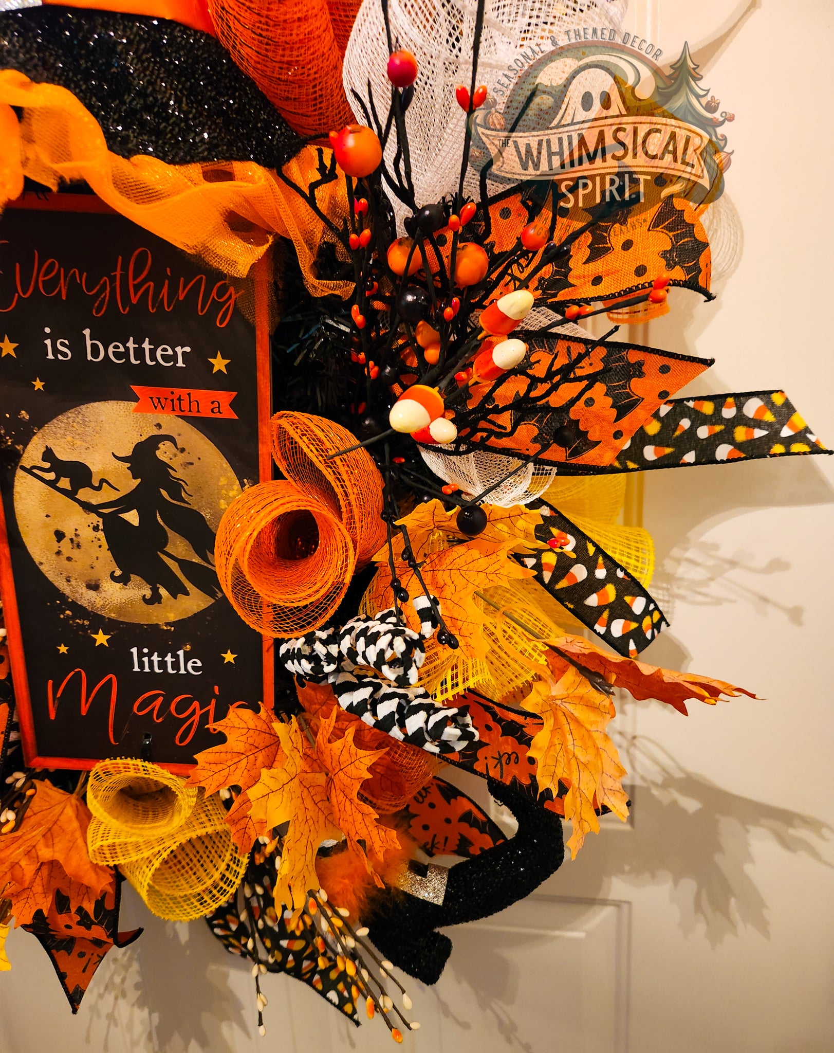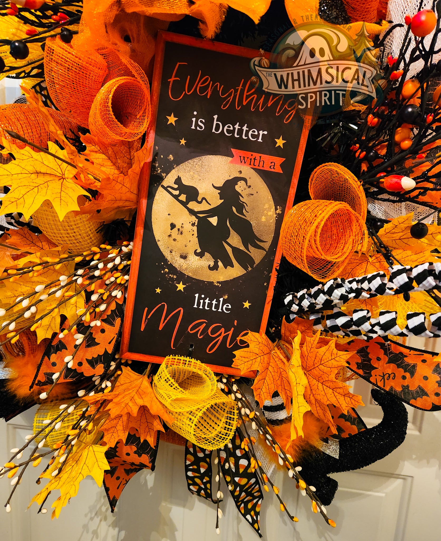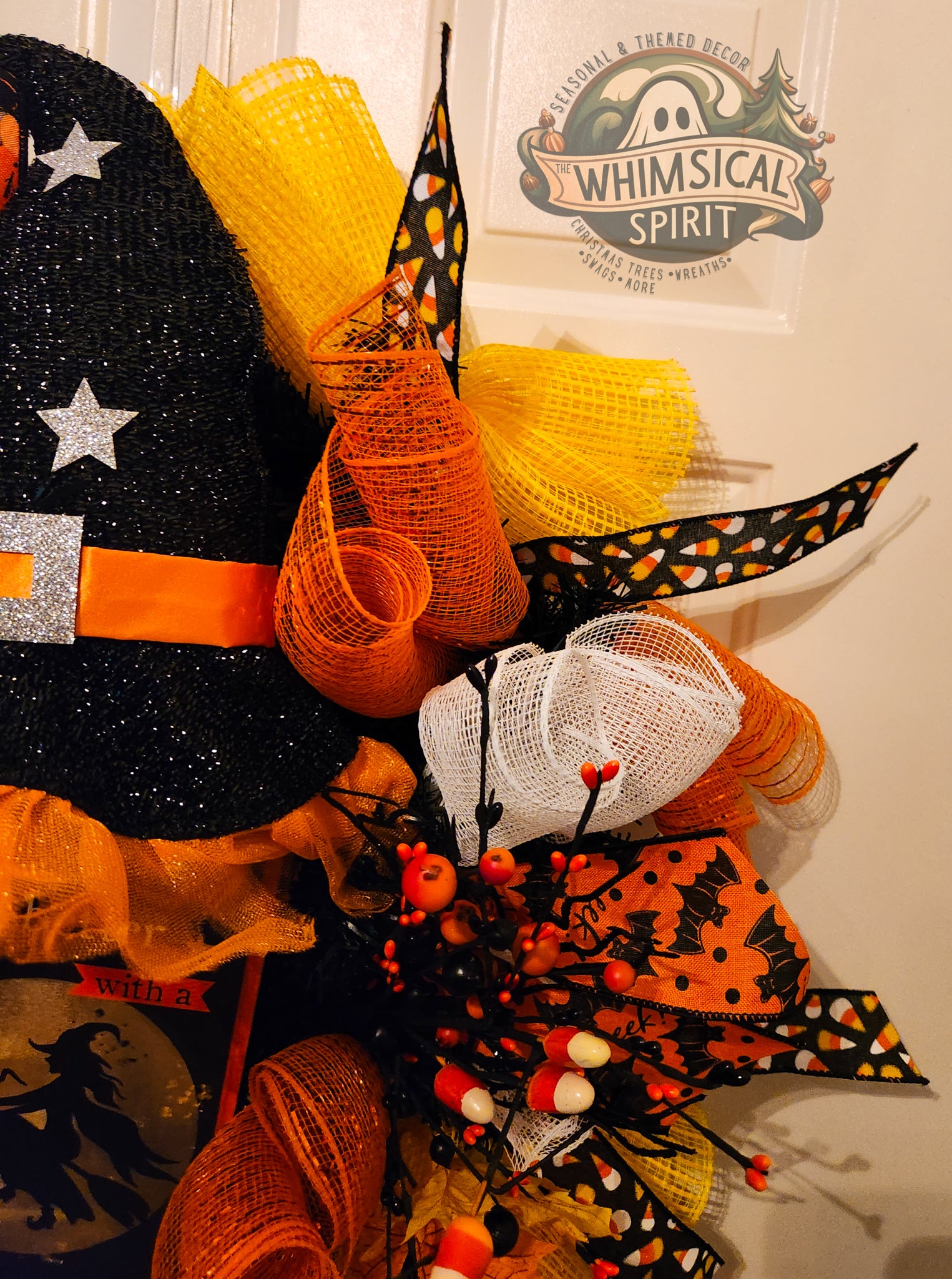 Once upon a moonlit night, a mischievous little witch tried to sneak a spell through your front door… but it seems she got stuck instead! Her hat rests proudly at the top, while her striped legs kick playfully from below, leaving behind a wreath brimming with laughter, candy-colored magic, and a touch of charm. Bring Cackles & Charm to your front door, and let the tale of whimsy and witchcraft greet every guest with a touch of magic and a giggle.