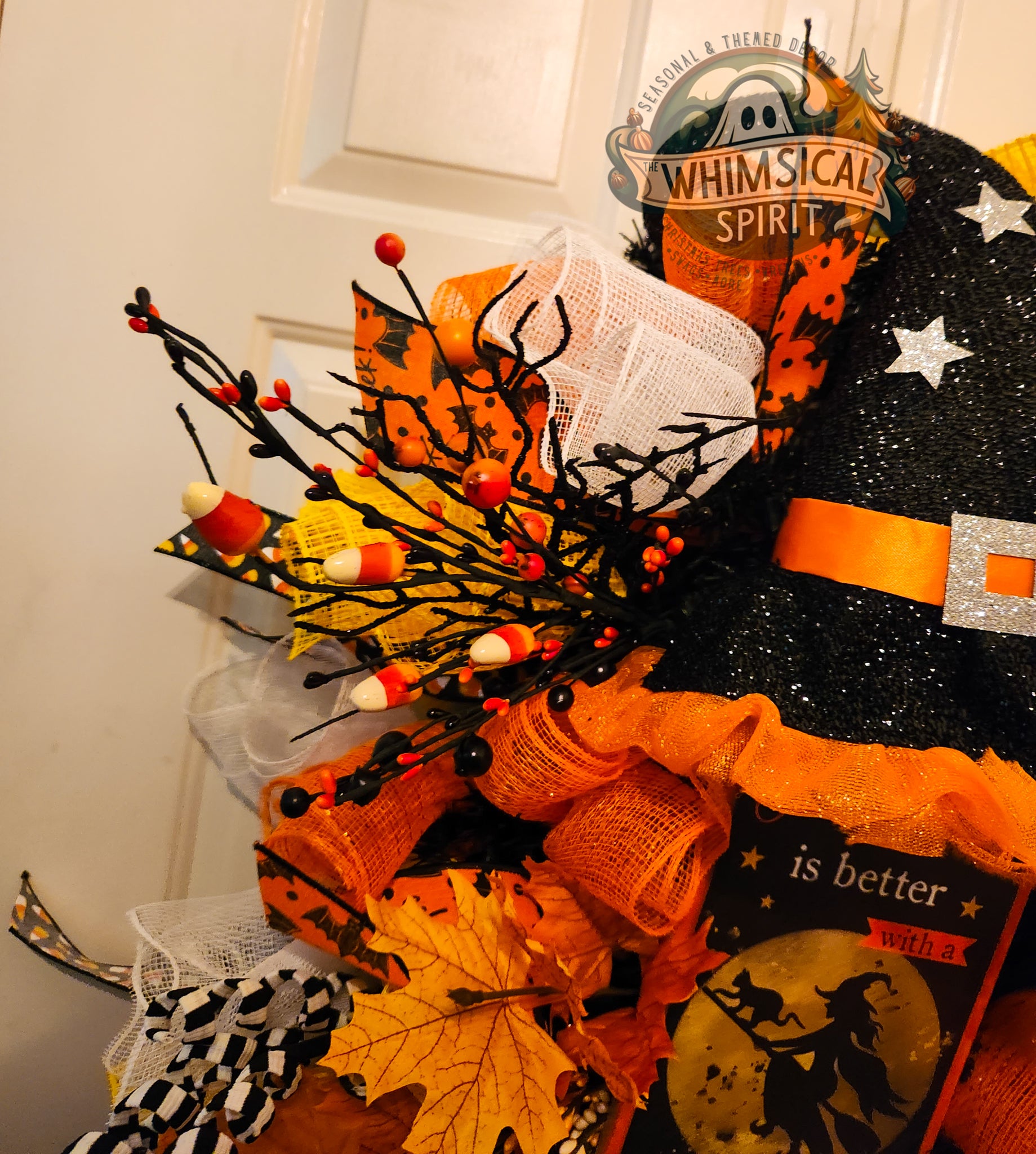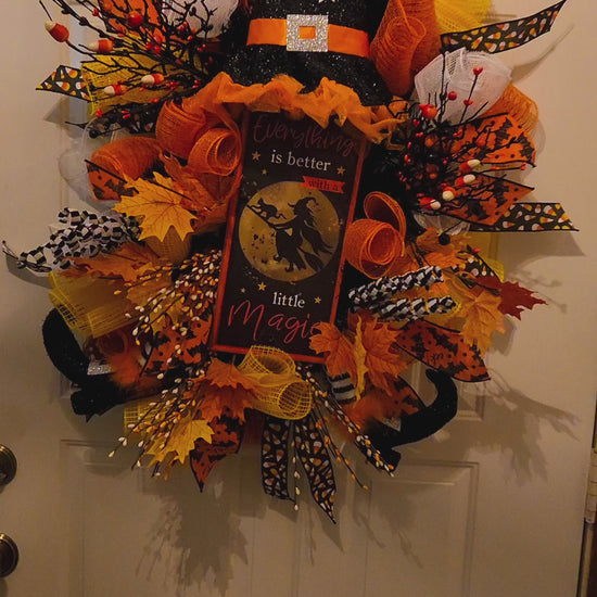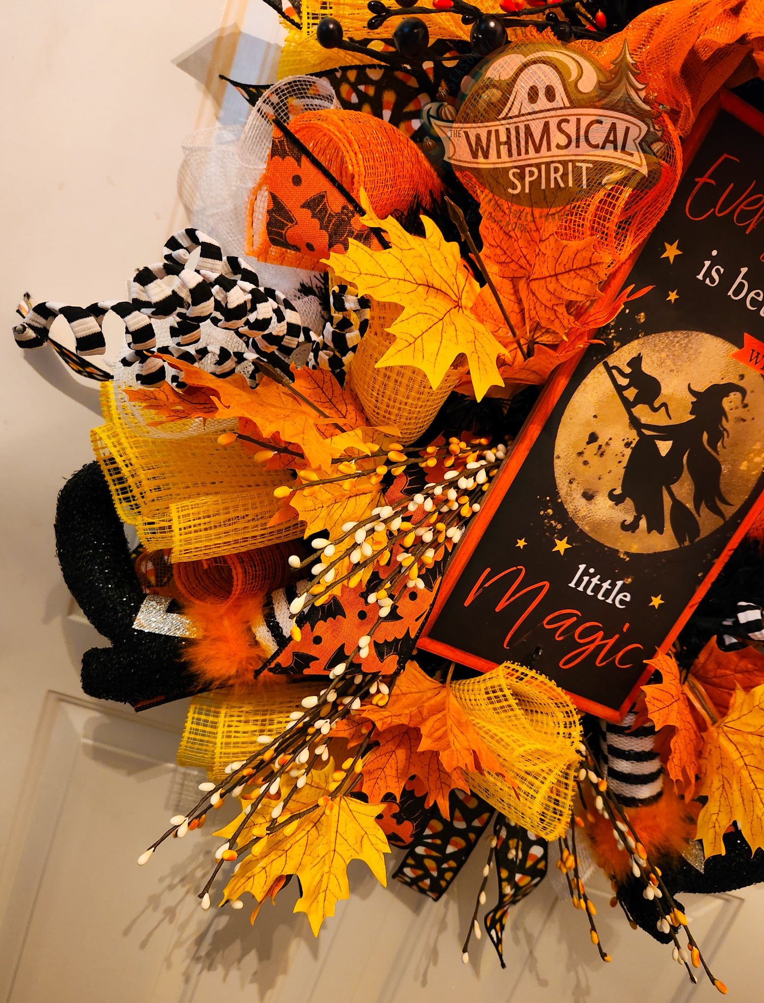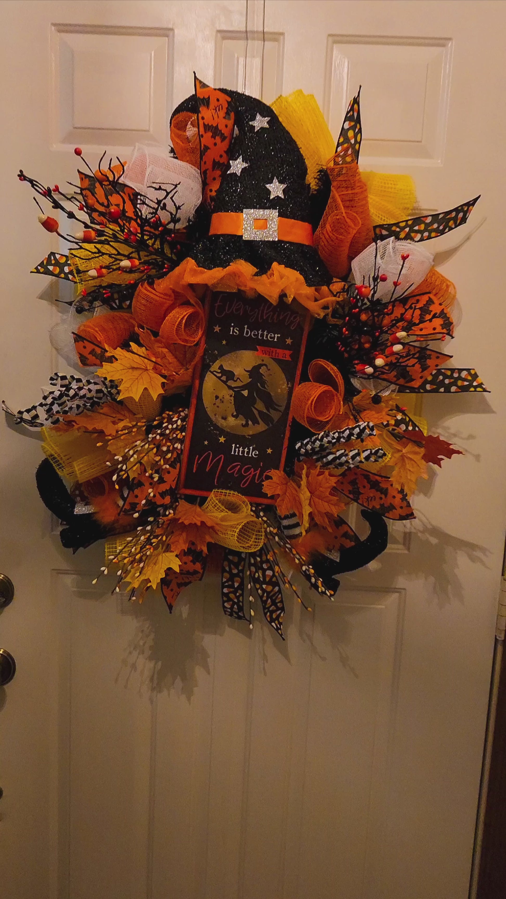 Once upon a moonlit night, a mischievous little witch tried to sneak a spell through your front door… but it seems she got stuck instead! Her hat rests proudly at the top, while her striped legs kick playfully from below, leaving behind a wreath brimming with laughter, candy-colored magic, and a touch of charm. Bring Cackles & Charm to your front door, and let the tale of whimsy and witchcraft greet every guest with a touch of magic and a giggle.