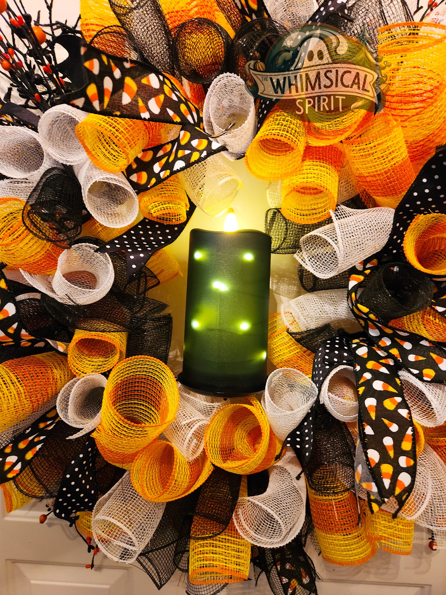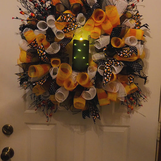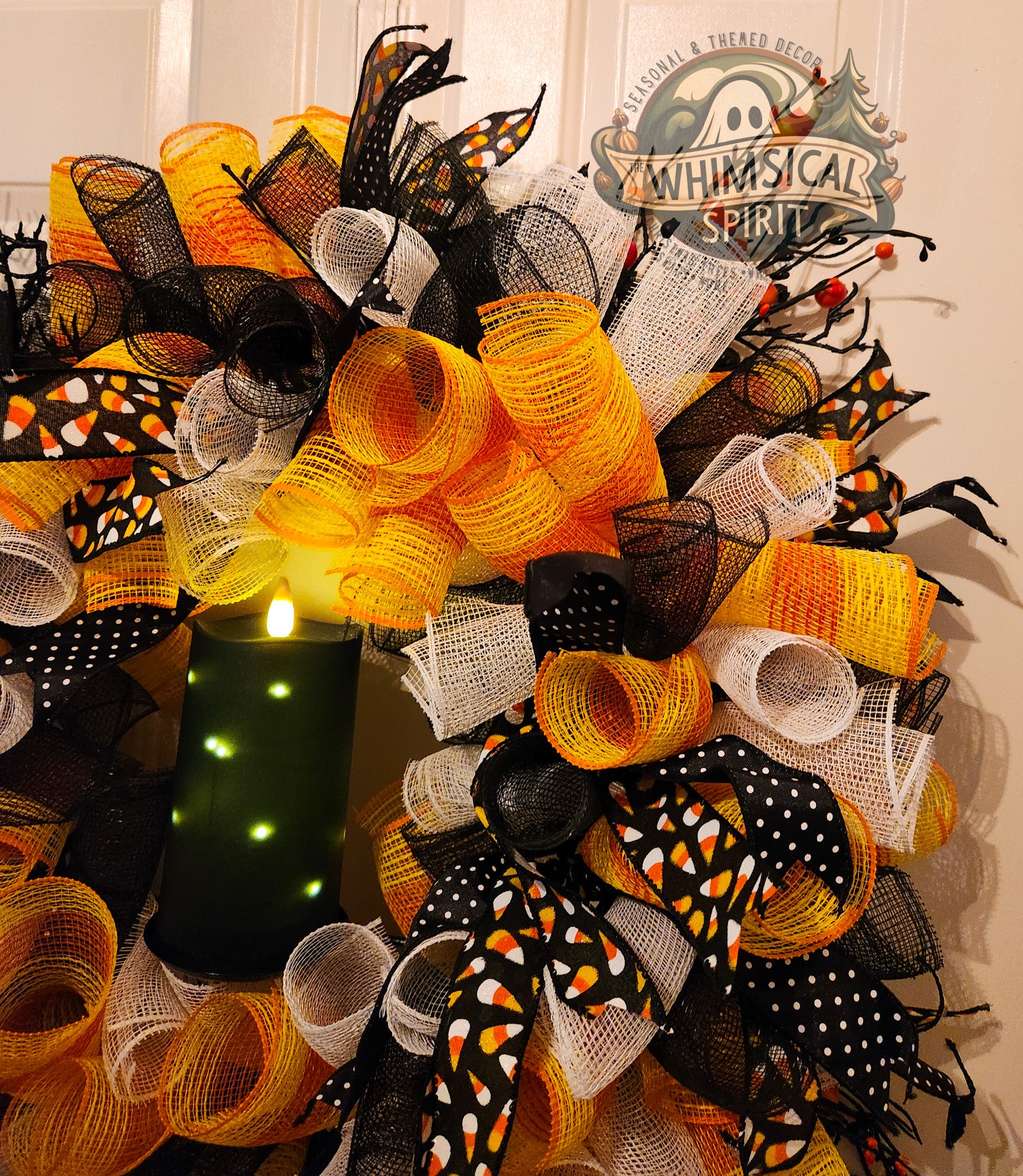 Candy Corn Cackles is created on a 16" wreath frame. Candle is included with wreath purchase.