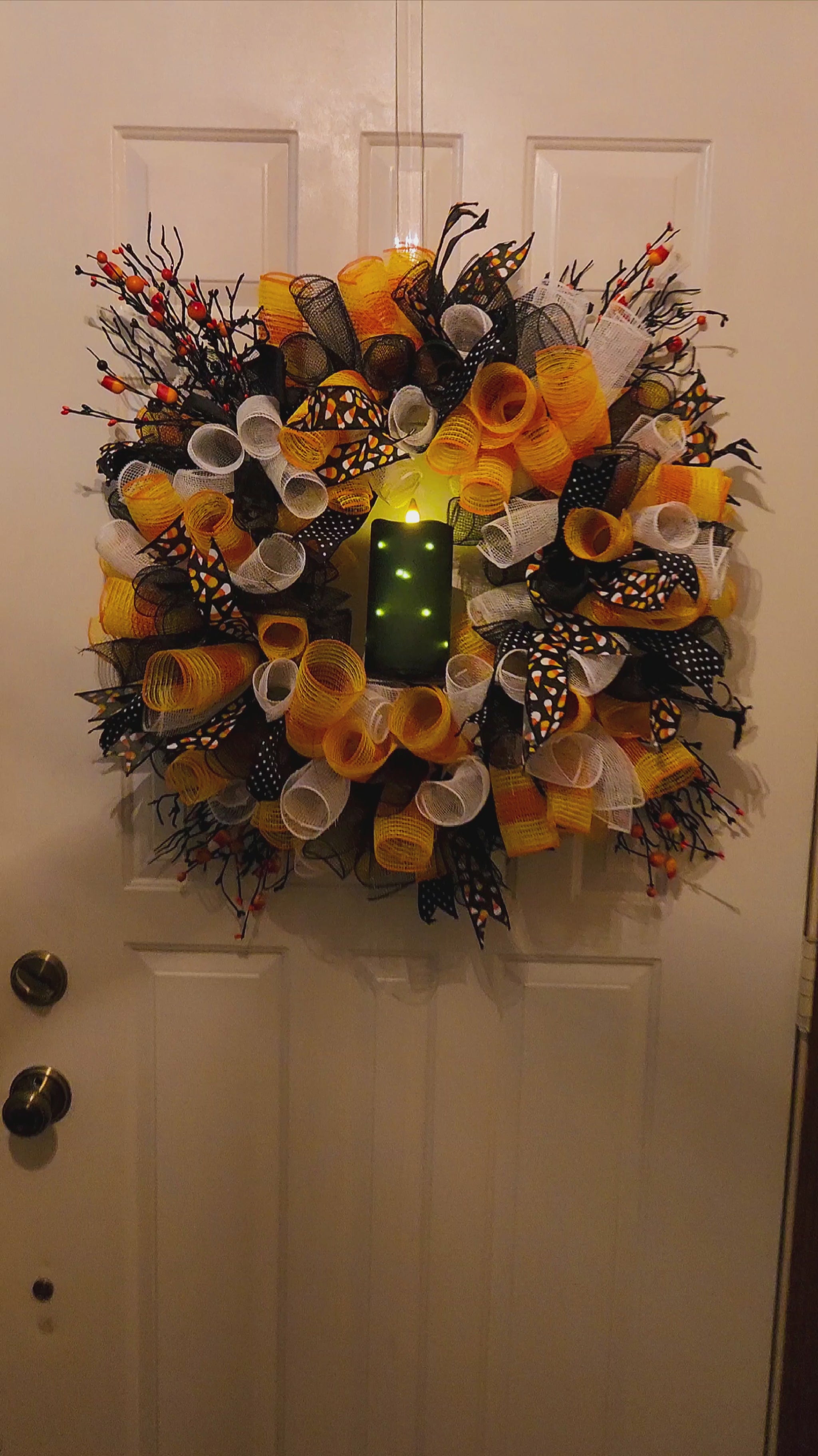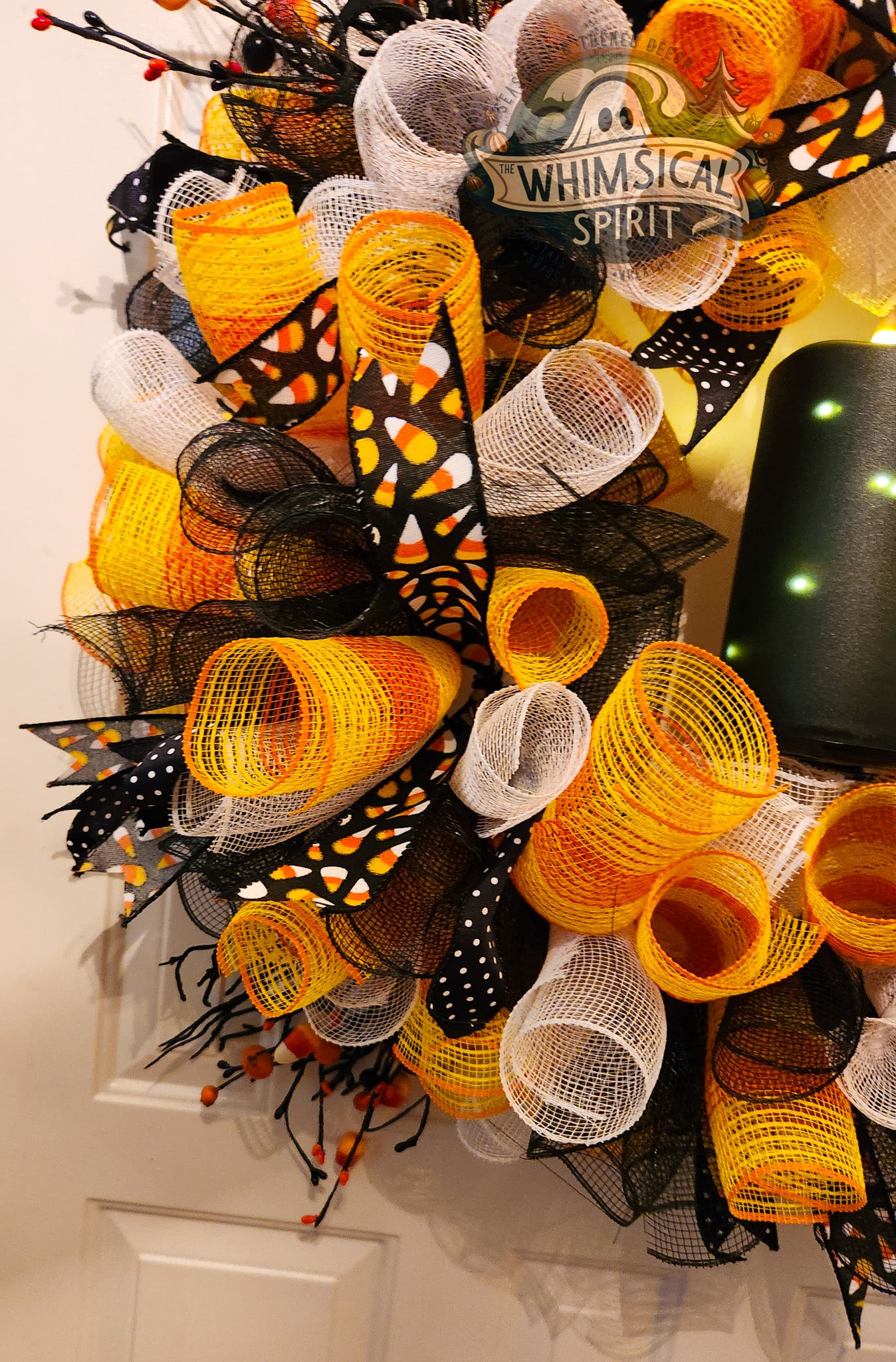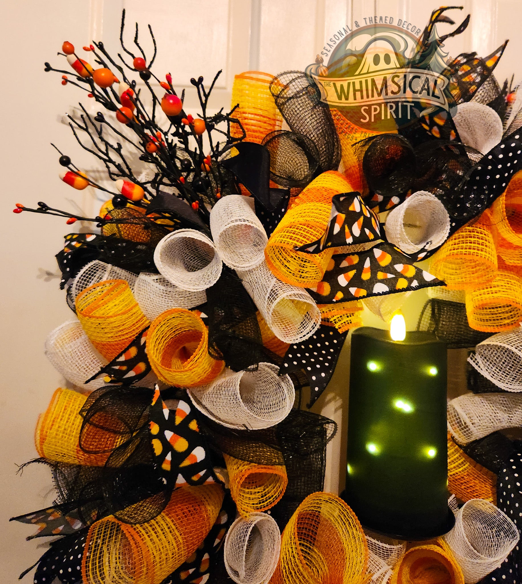 Candy Corn Cackles is created on a 16" wreath frame. Candle is included with wreath purchase.