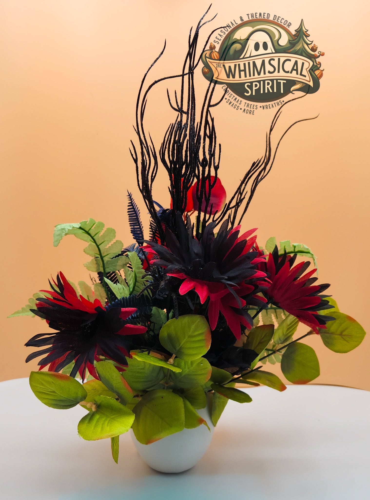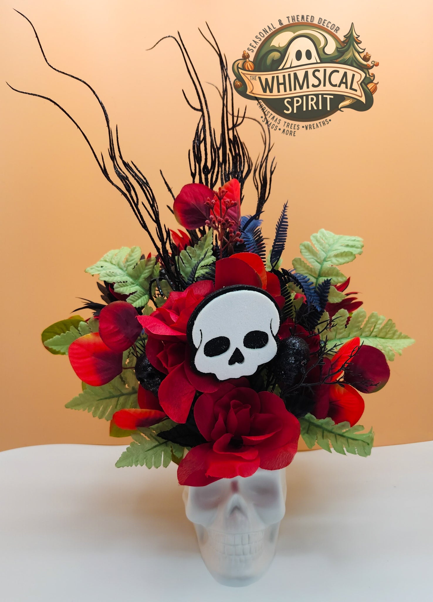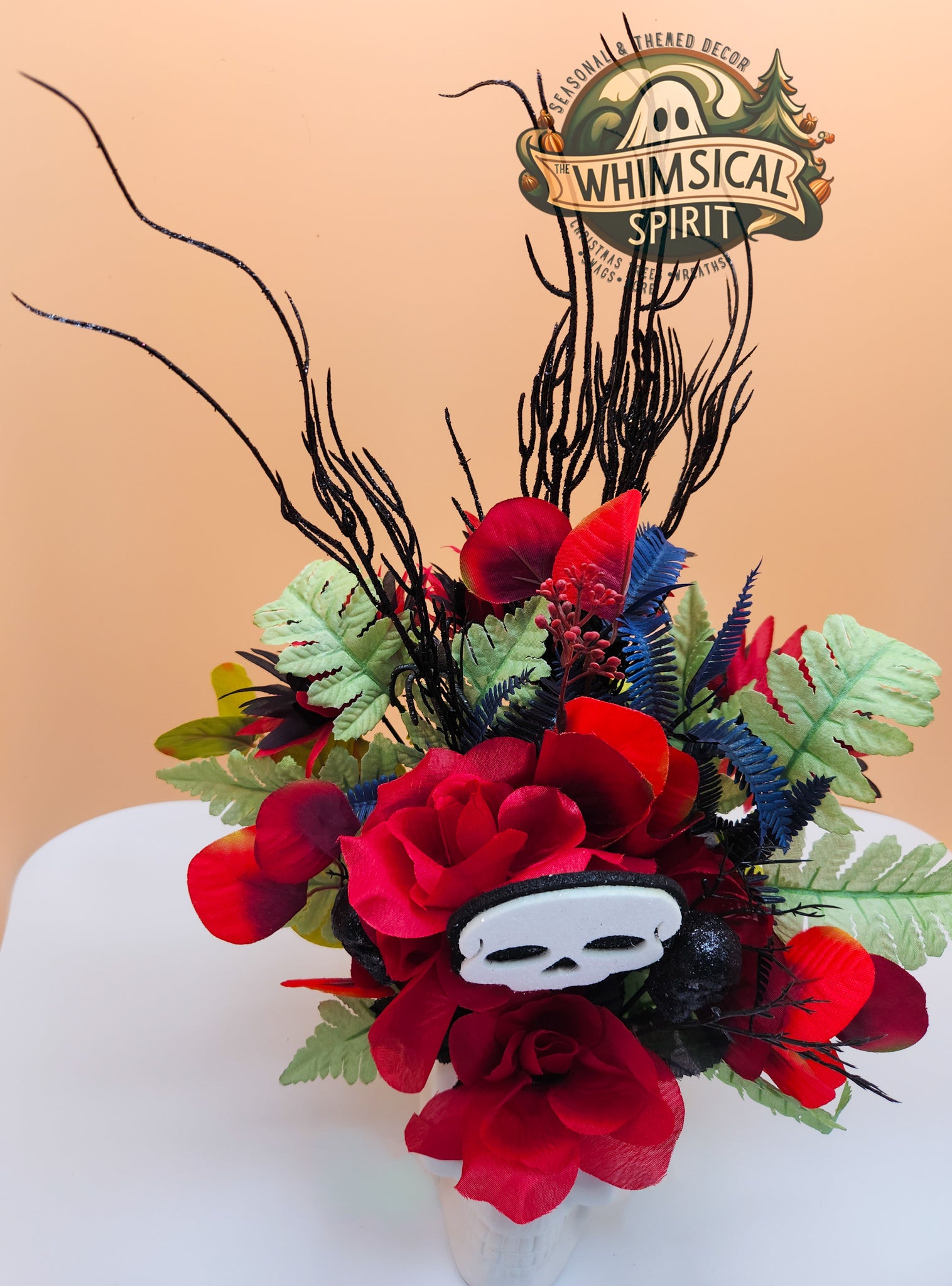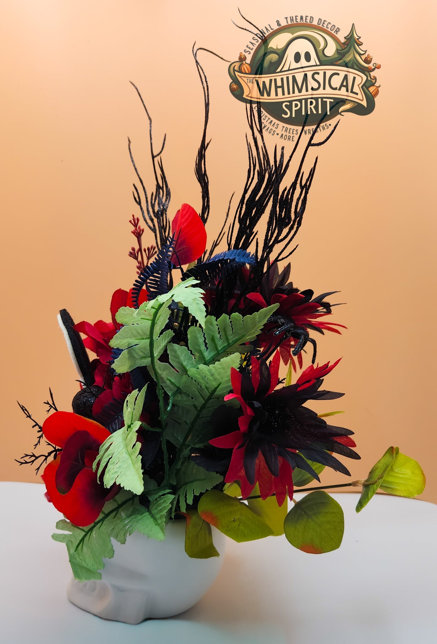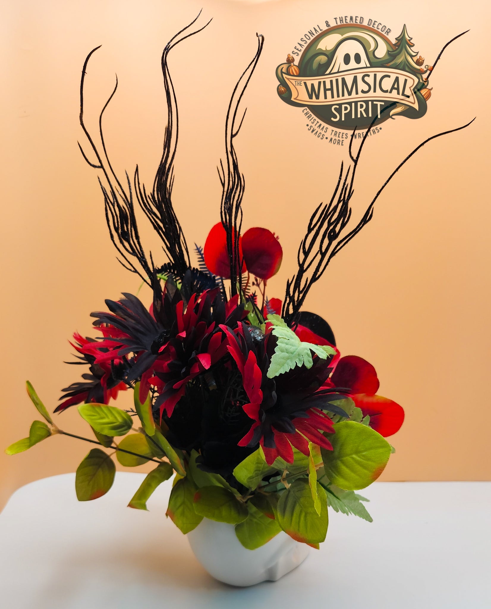Dare to decorate with the darkly elegant Crimson Curse. This haunting centerpiece features a skull vessel brimming with deep crimson blooms, lush greenery, and shadowy accents, topped with a bold skull detail for extra spine-chilling flair. Perfect for Halloween parties, gothic décor, or anyone who loves a touch of eerie romance, this piece blends beauty and bone-chilling style into one unforgettable display.