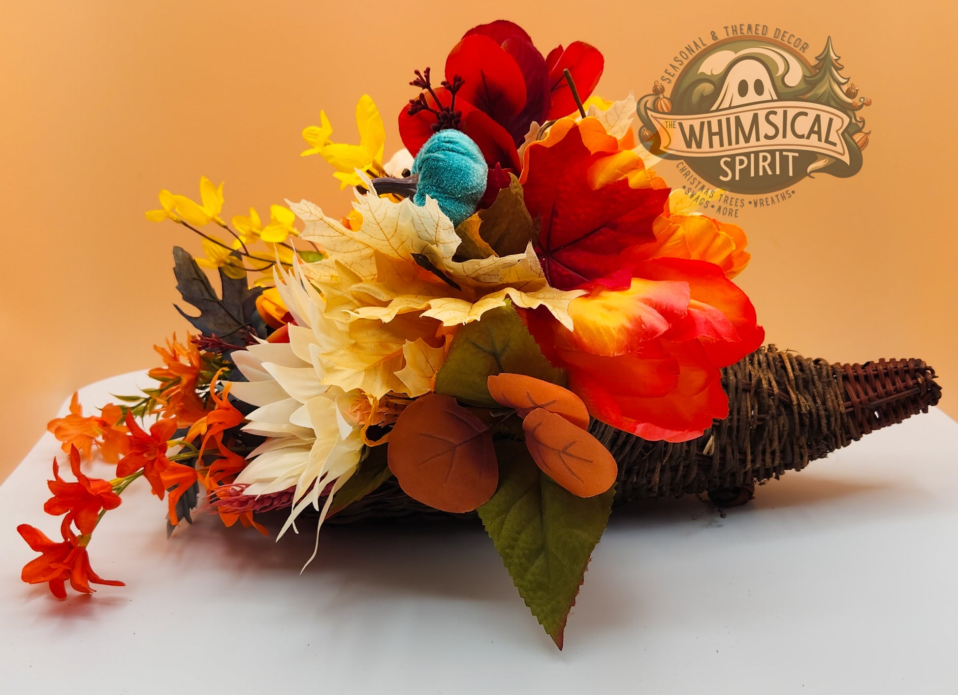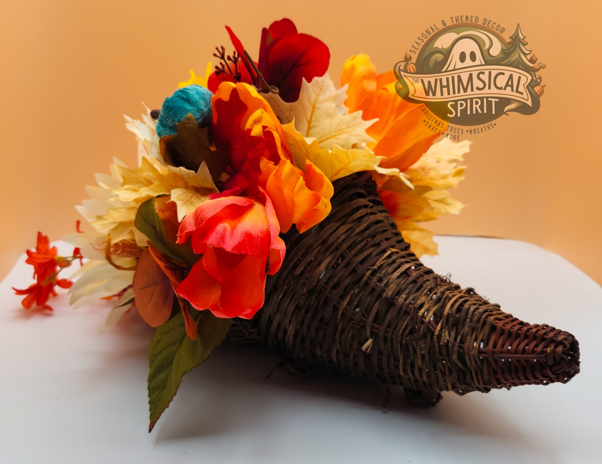 Celebrate the season’s splendor with Crown of Pumpkins, an elegant cornucopia overflowing with the beauty of autumn. Warm golden tones, vibrant orange blossoms, and lush seasonal foliage are accented by petite pumpkins, creating a regal display that captures the heart of harvest time. Nestled in a traditional horn of plenty, this centerpiece embodies both abundance and grace, making it the perfect finishing touch for your Thanksgiving table, entryway, or festive gathering.