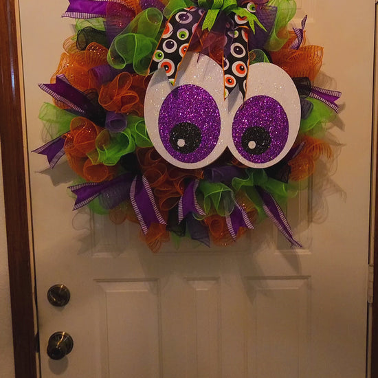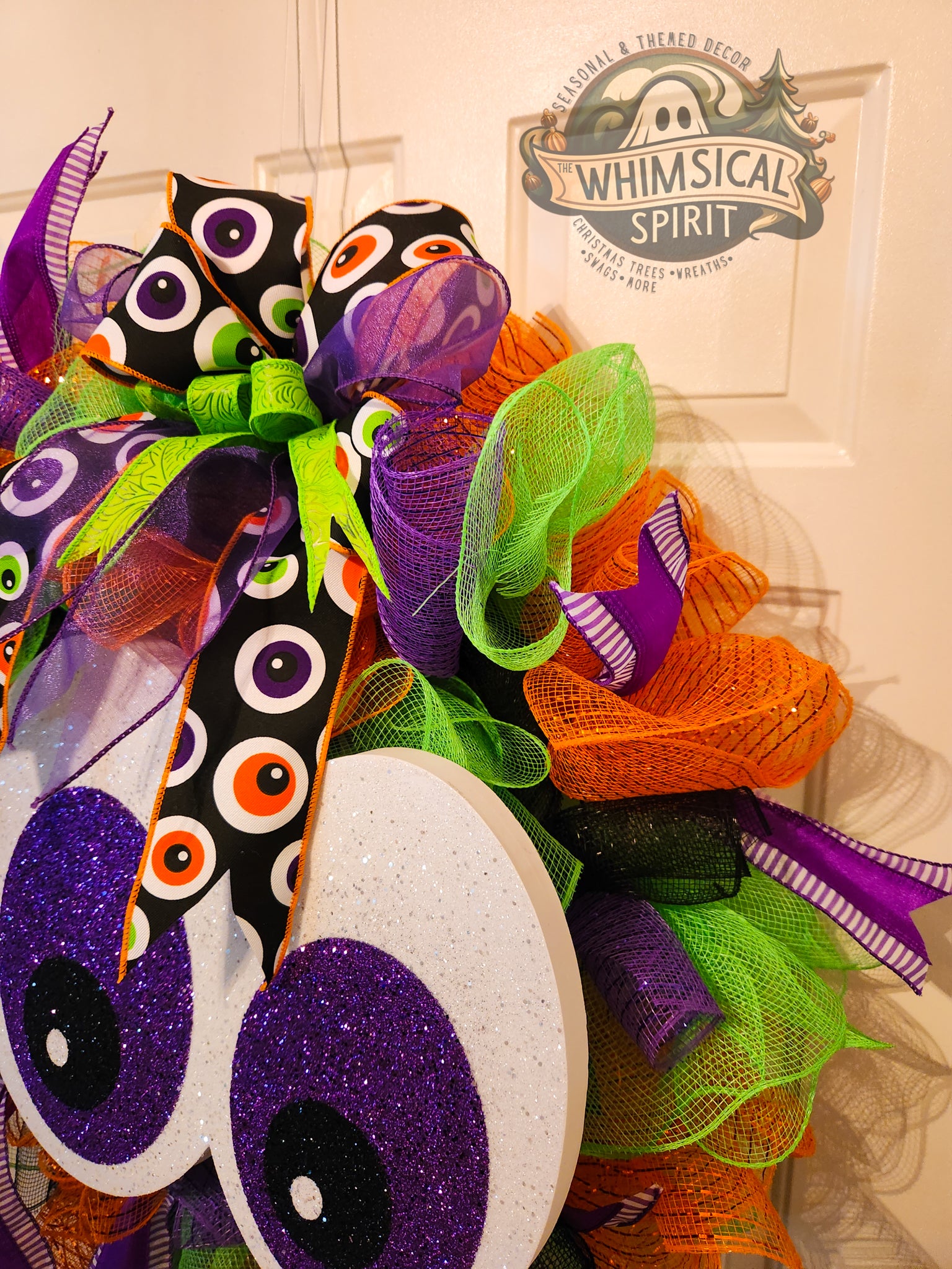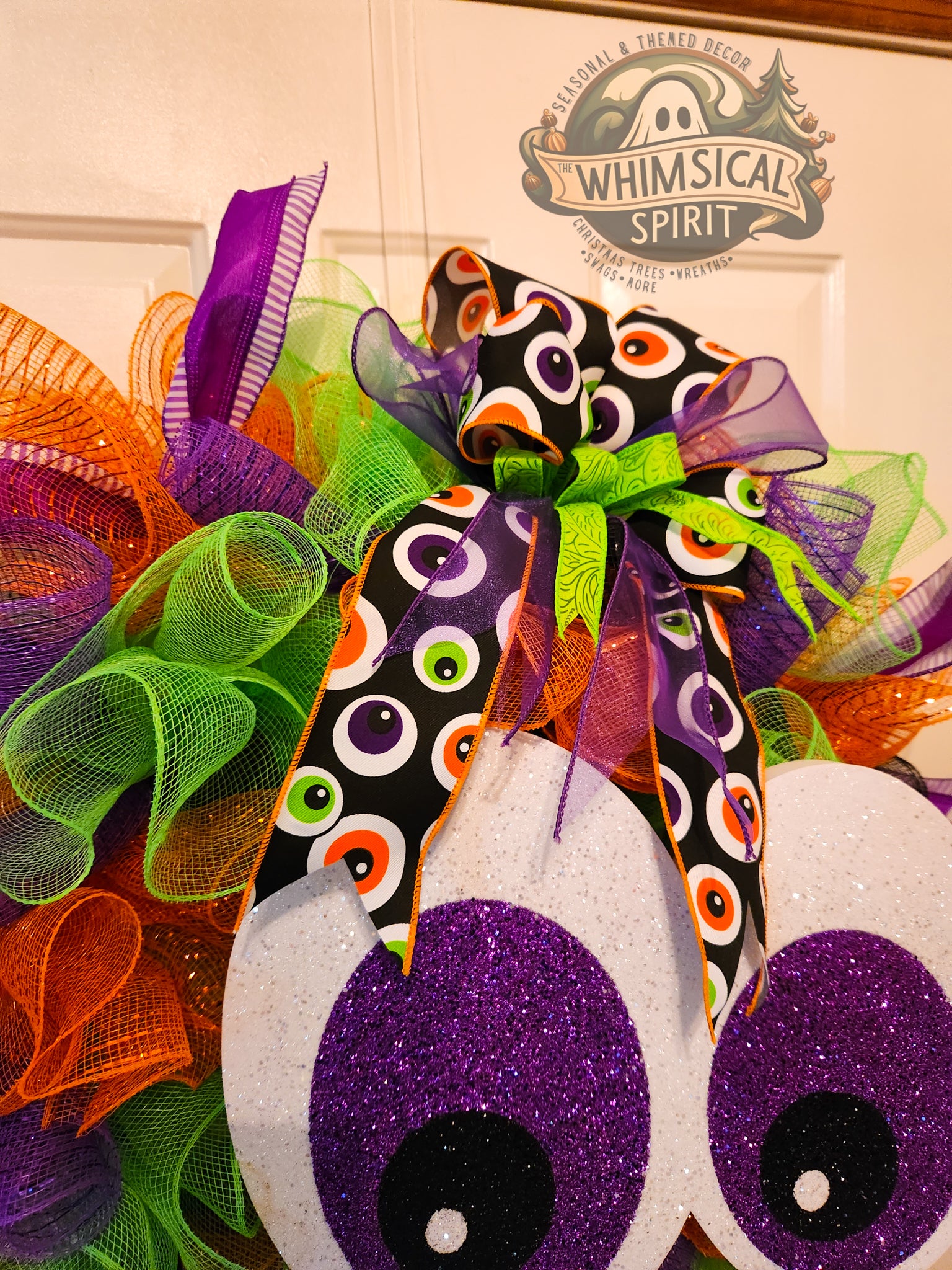 Eye See You is a frightfully fun wreath that’s sure to keep an eye on your Halloween decor—literally! Bursting with bold orange, black, and white accents, it features bold patterns, striking mesh, and a playful, yet watchful set of eyeballs peeking through a mix of festive Halloween colors. This whimsical piece is perfect for welcoming trick-or-treaters with a grin and a boo!