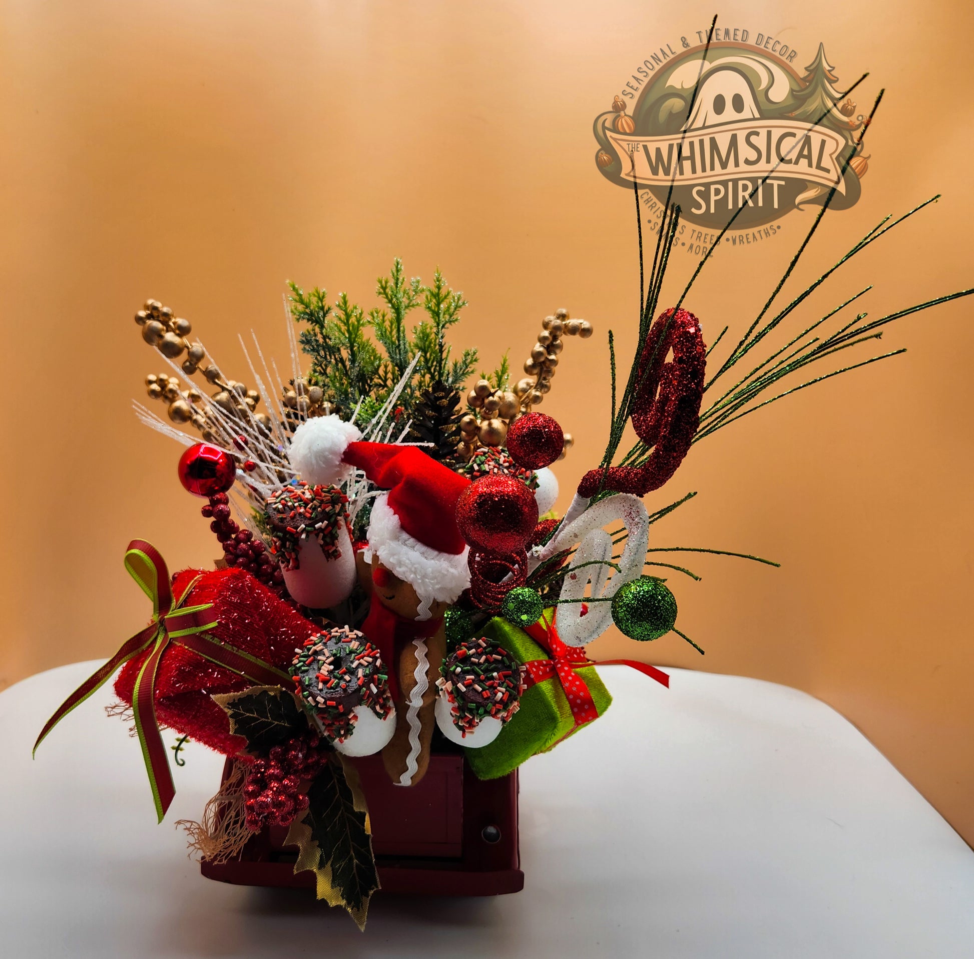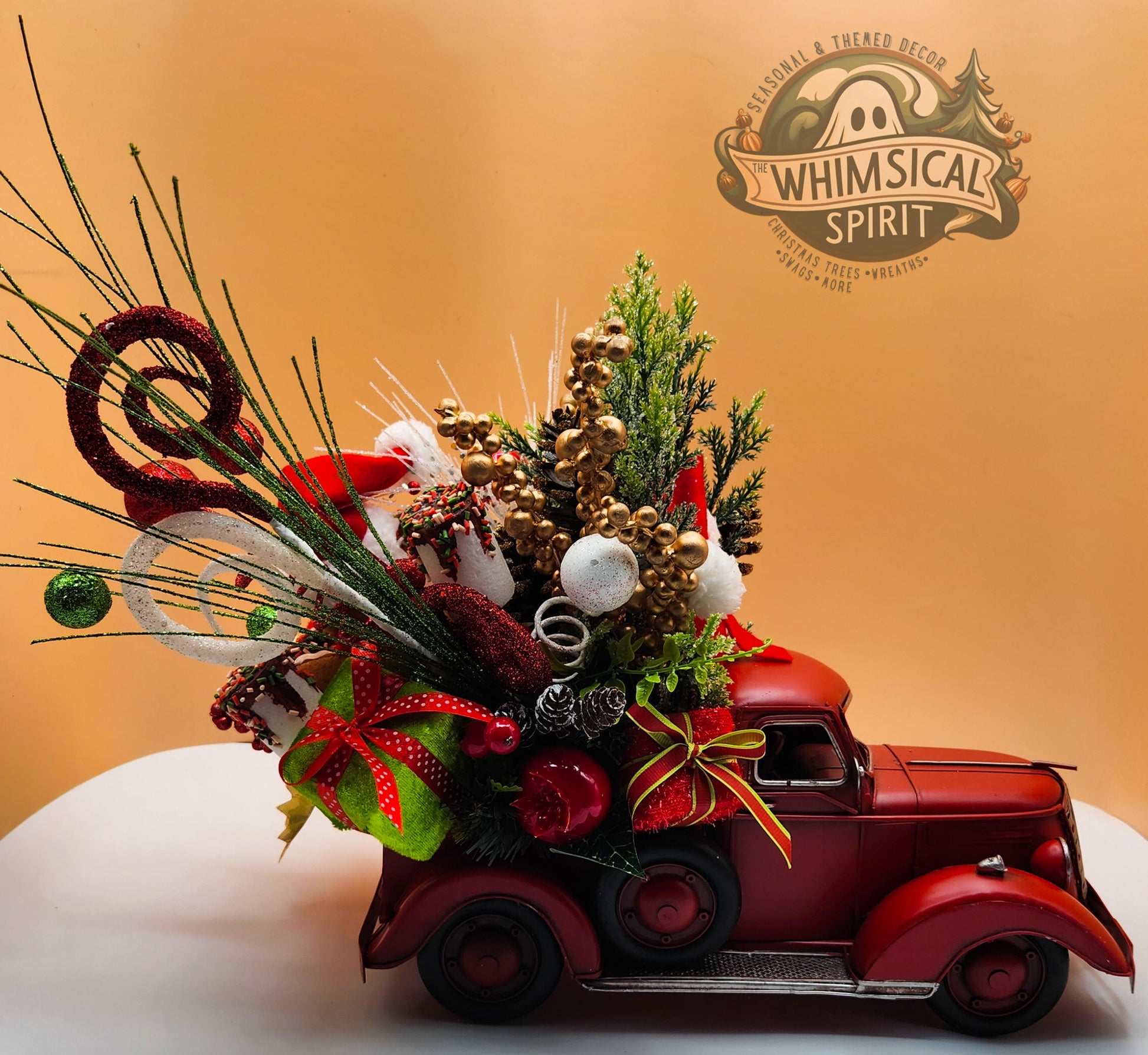 All loaded up with holiday cheer, Festive Freight brings a merry touch of nostalgia to the season. This vintage red truck overflows with frosted evergreens, golden pinecones, bright berries, and playful Santa hats - a cheerful delivery straight from the North Pole.