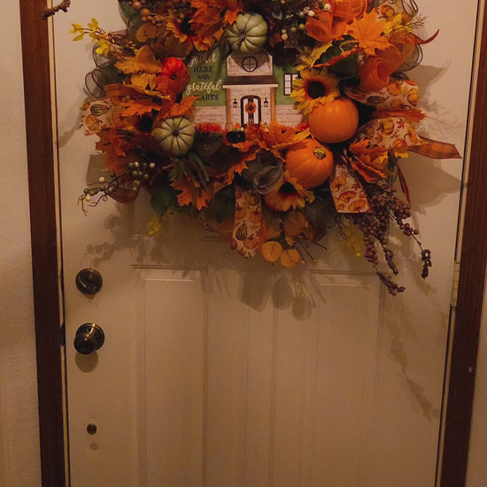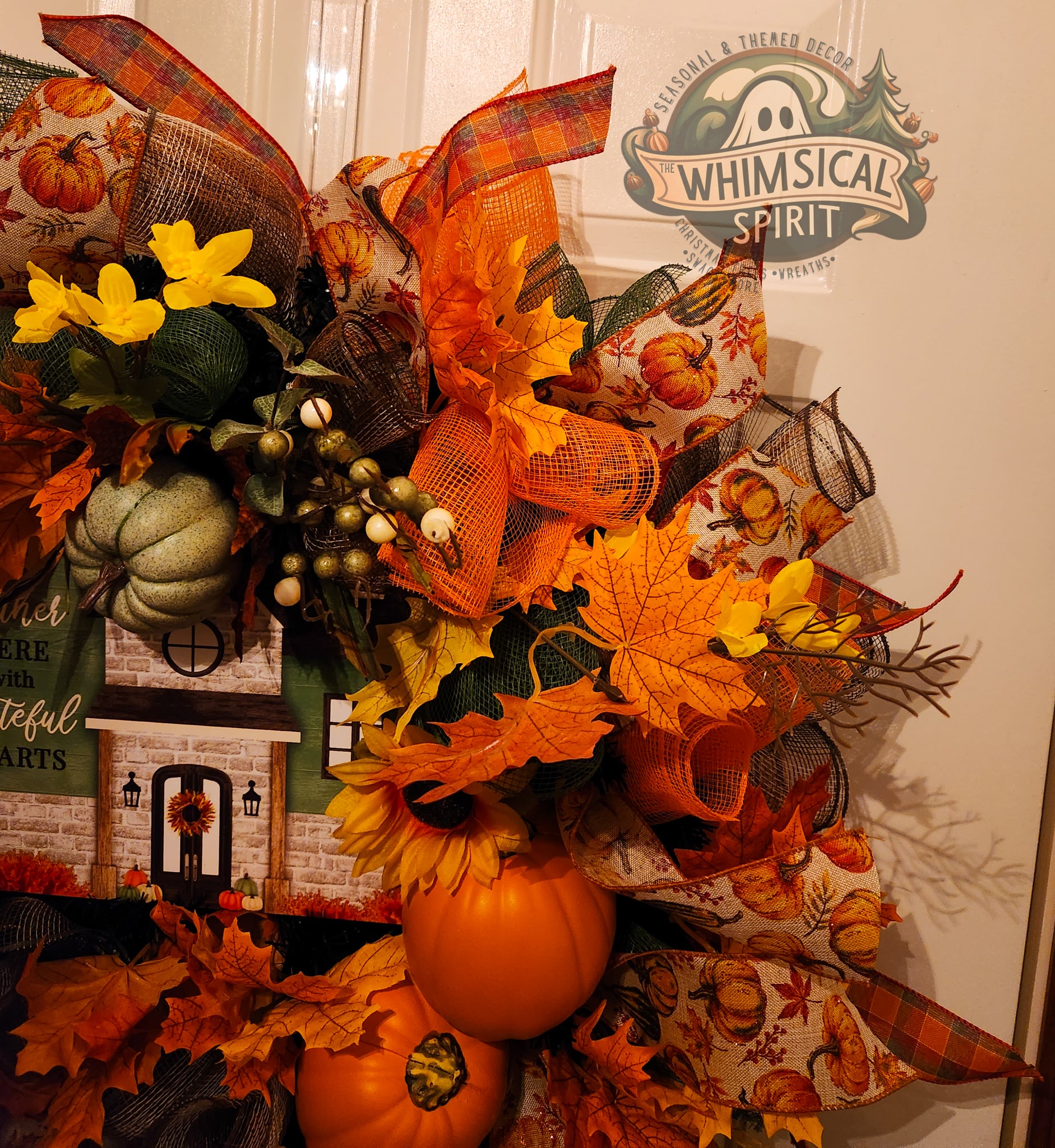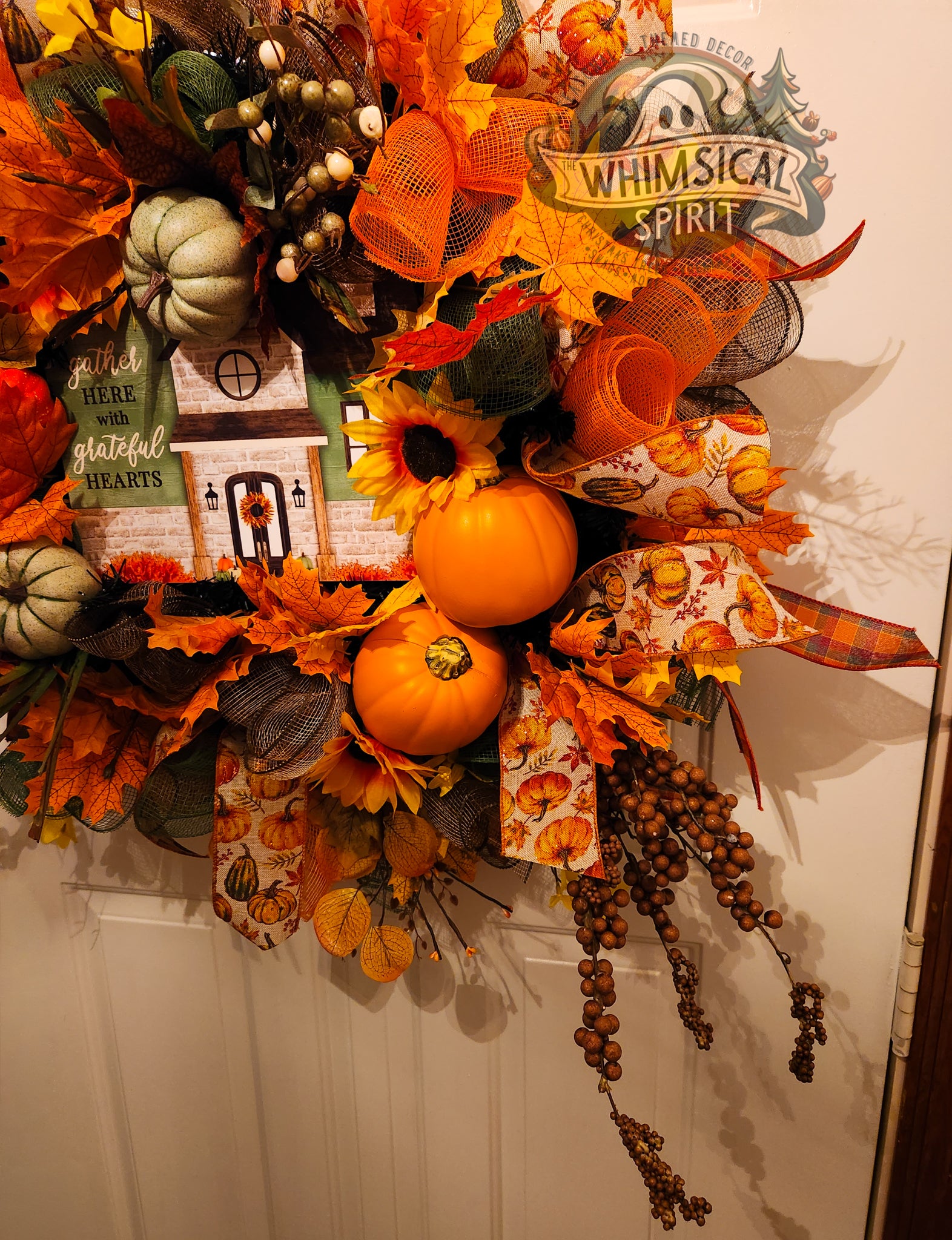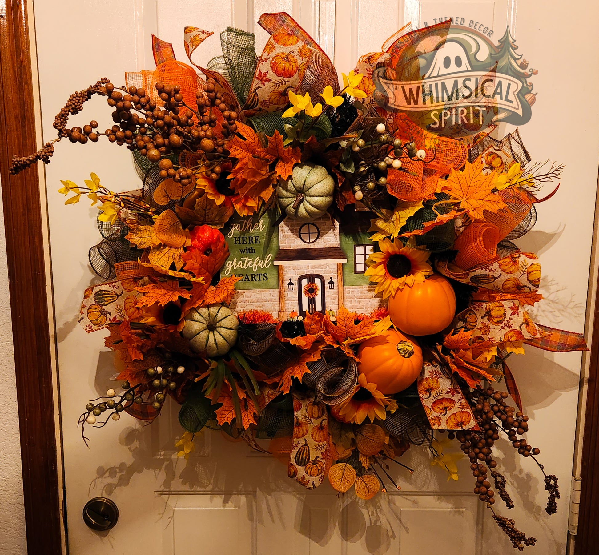 Celebrate the beauty of fall with this lush, handcrafted wreath, brimming with autumn’s finest details. Bursting with pumpkins, sunflowers, golden leaves, and textured ribbons, it’s a vibrant reminder of the season’s warmth and abundance. At its heart, a welcoming farmhouse invites friends and family, making it the perfect accent for your front door, entryway, or holiday gatherings. Designed to capture the spirit of fall and Thanksgiving, this one-of-a-kind wreath brings both charm and gratitude to your home all season long.