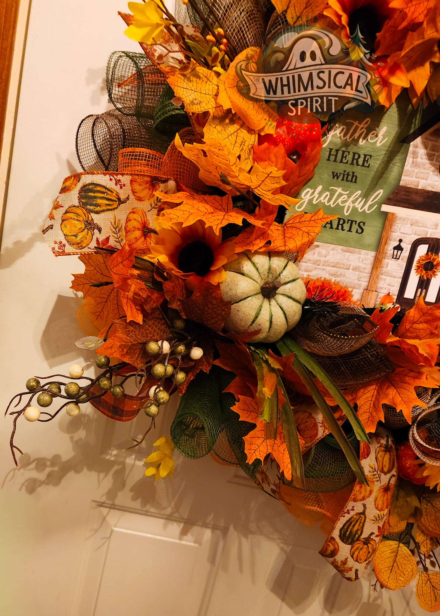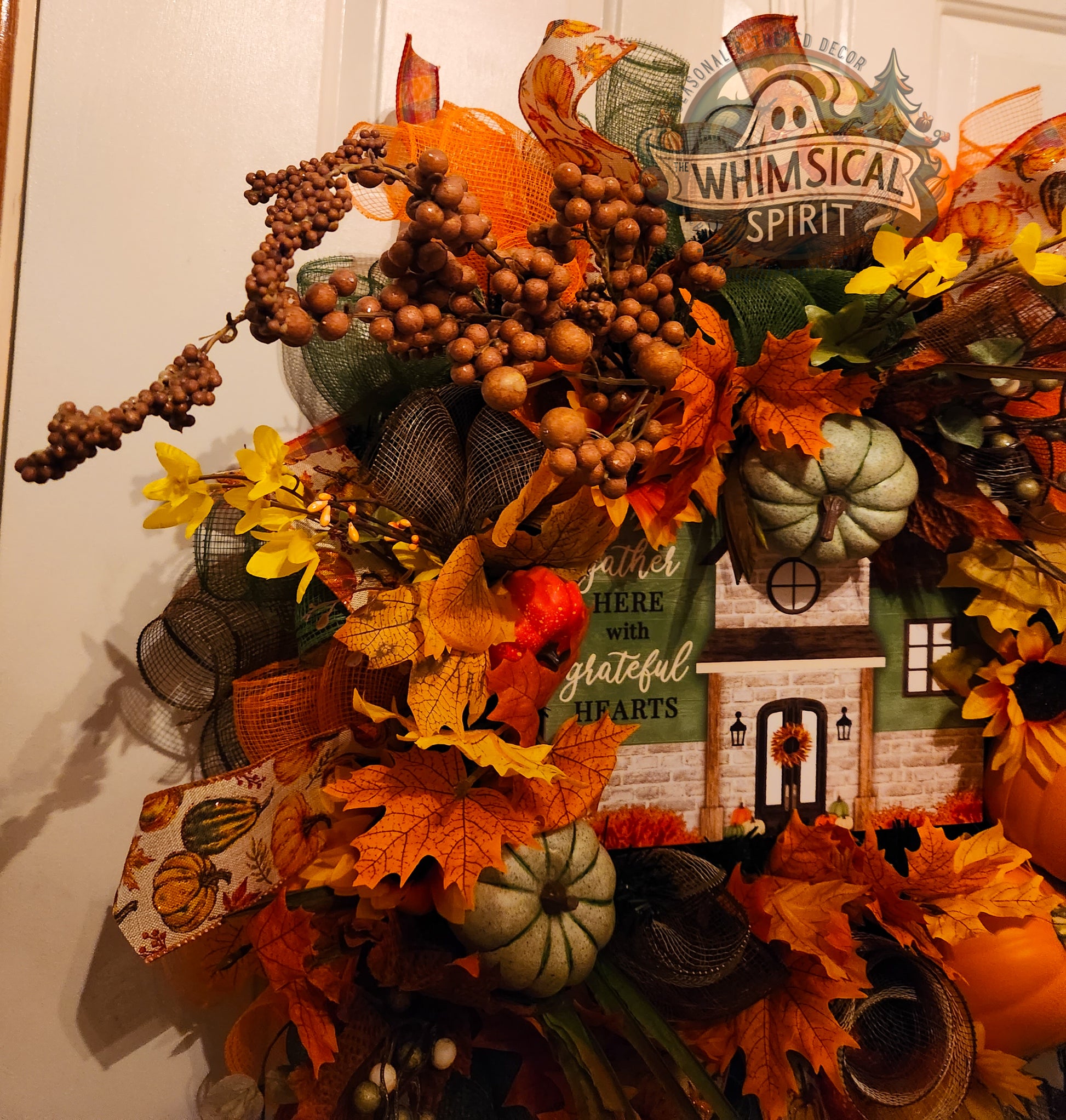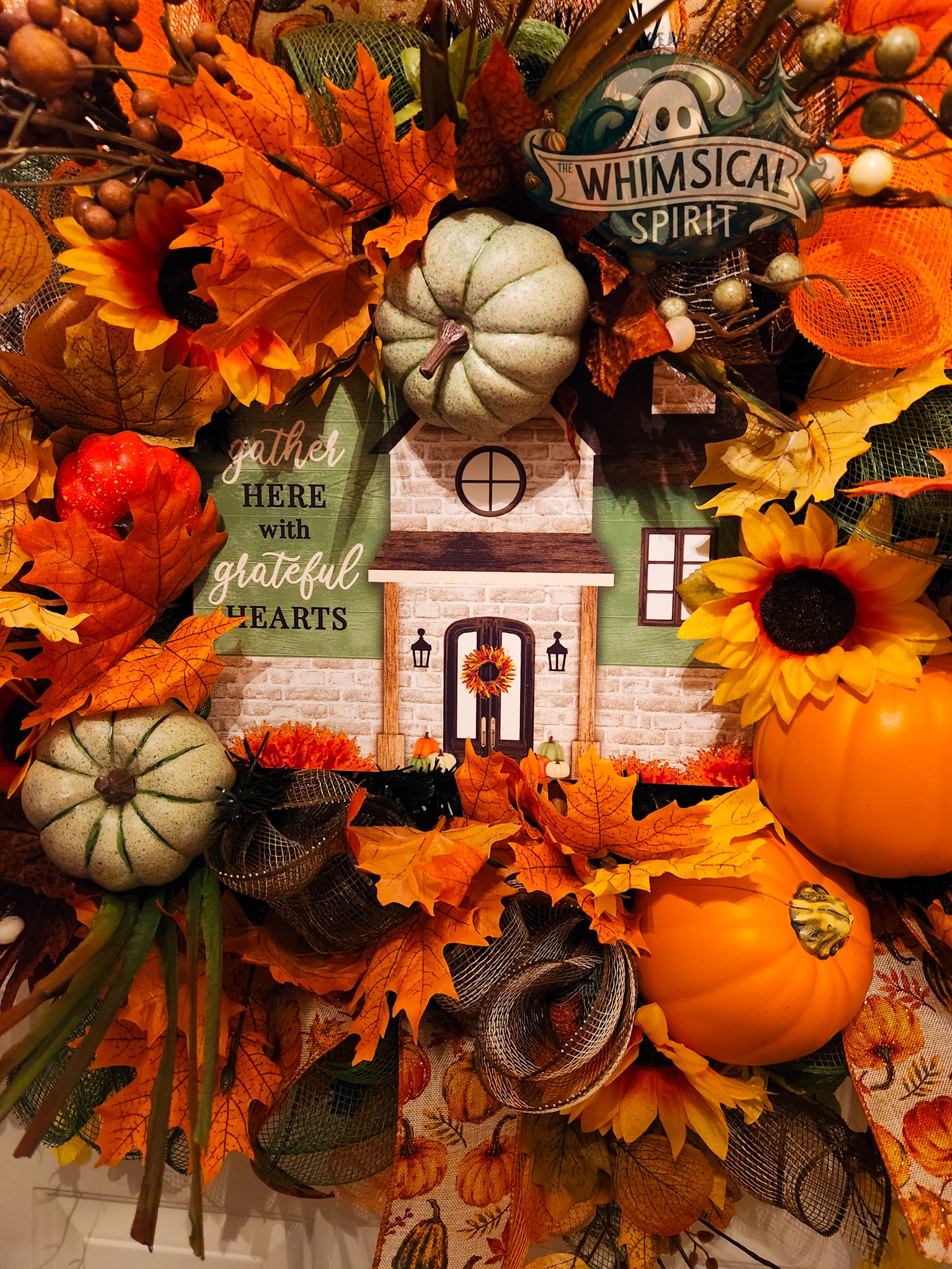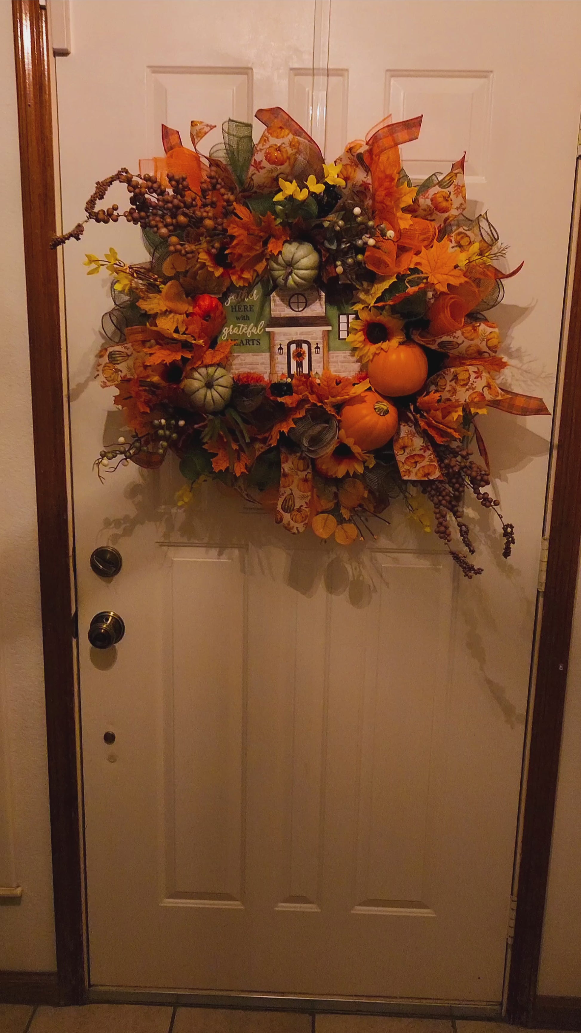 Celebrate the beauty of fall with this lush, handcrafted wreath, brimming with autumn’s finest details. Bursting with pumpkins, sunflowers, golden leaves, and textured ribbons, it’s a vibrant reminder of the season’s warmth and abundance. At its heart, a welcoming farmhouse invites friends and family, making it the perfect accent for your front door, entryway, or holiday gatherings. Designed to capture the spirit of fall and Thanksgiving, this one-of-a-kind wreath brings both charm and gratitude to your home all season long.