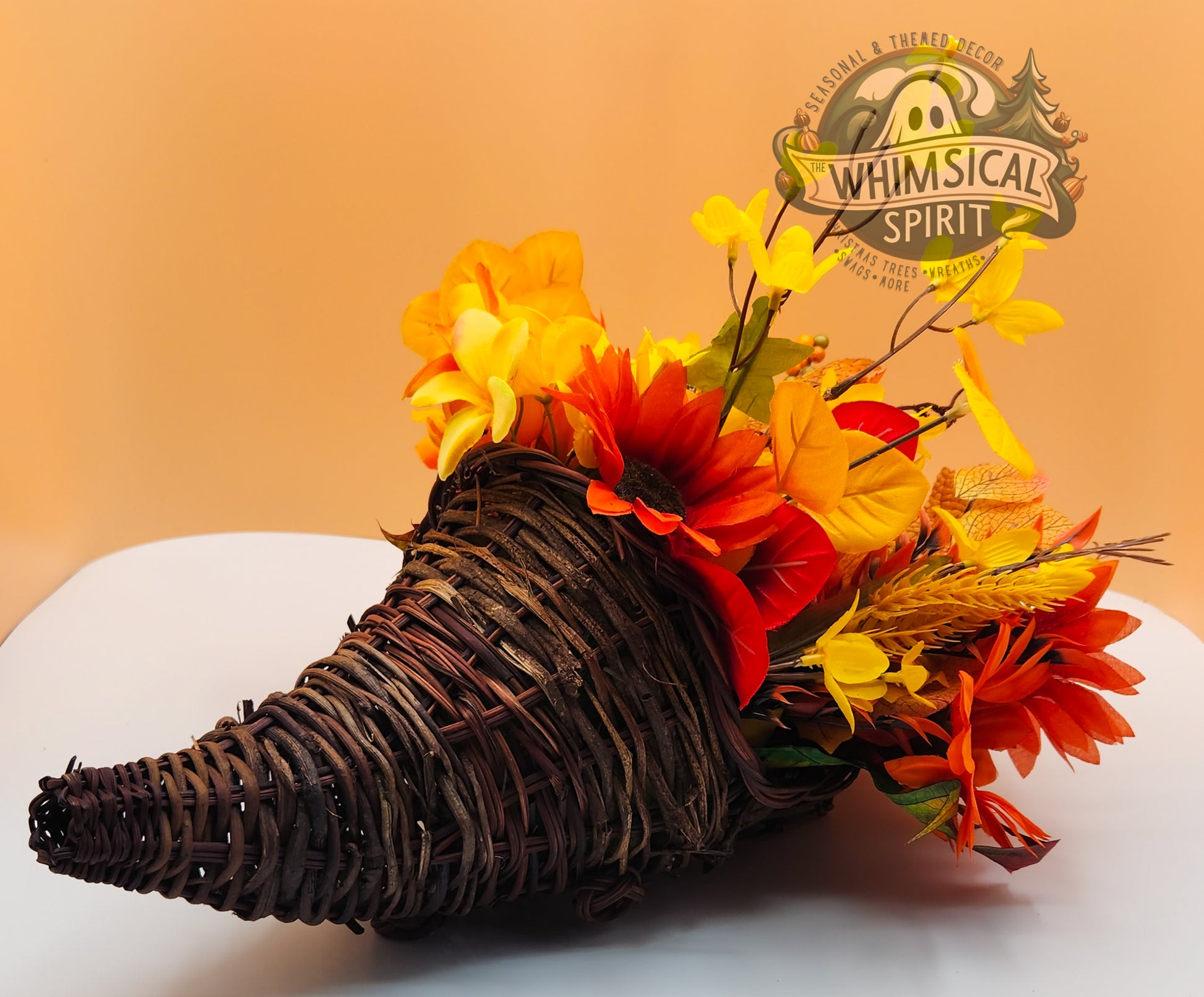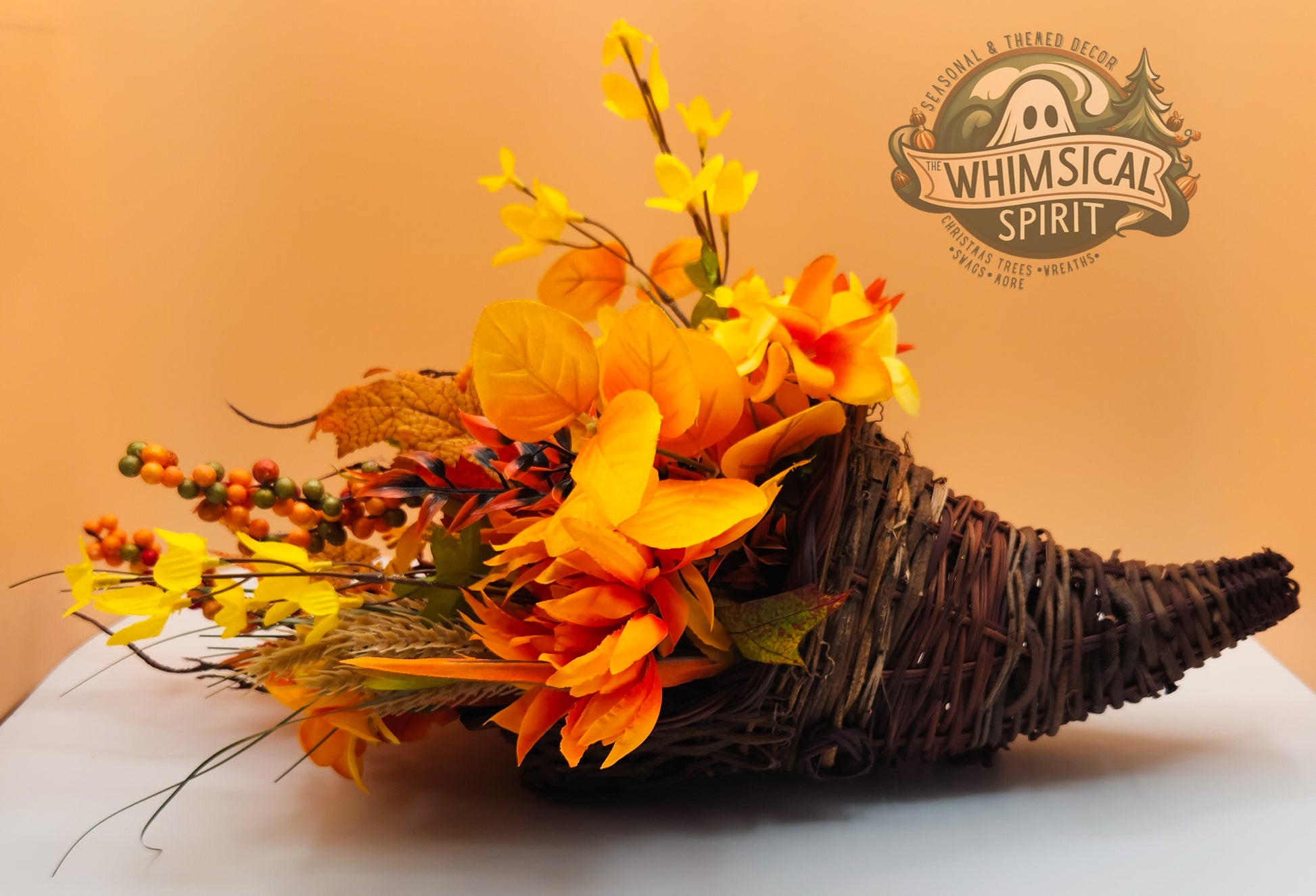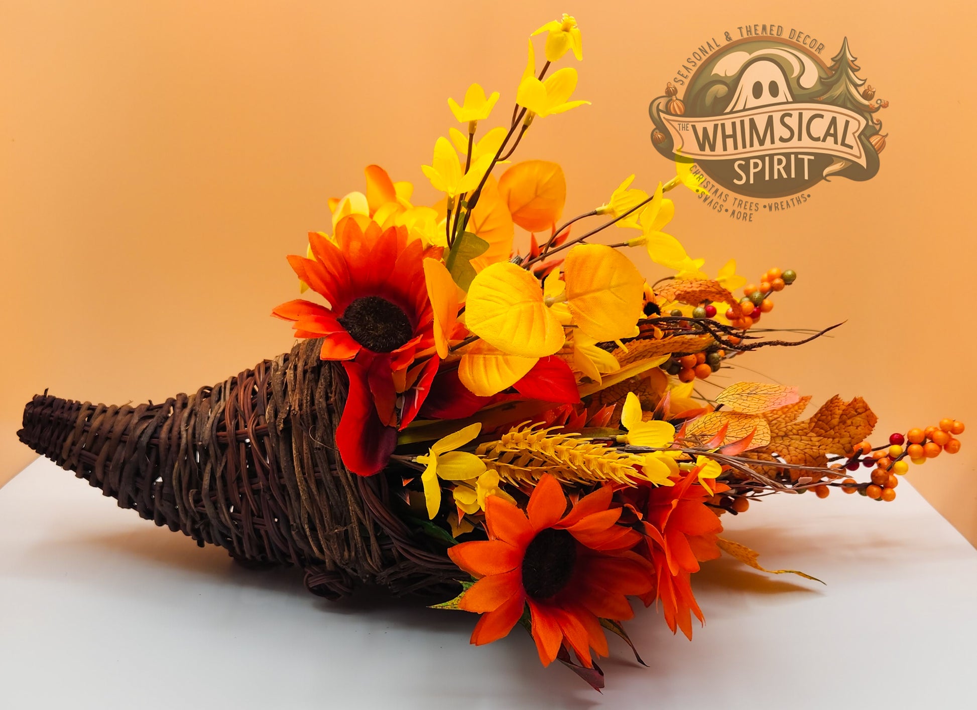 Celebrate the warmth of the season with Golden Gathering. This radiant cornucopia centerpiece overflows with golden sunflowers, bright autumn blooms, and rich seasonal foliage, capturing the essence of a plentiful harvest. Perfect for gracing your Thanksgiving table, mantle, or entryway, it brings both elegance and festive charm to your home. A timeless symbol of abundance, this piece is sure to make every gathering feel extra special.