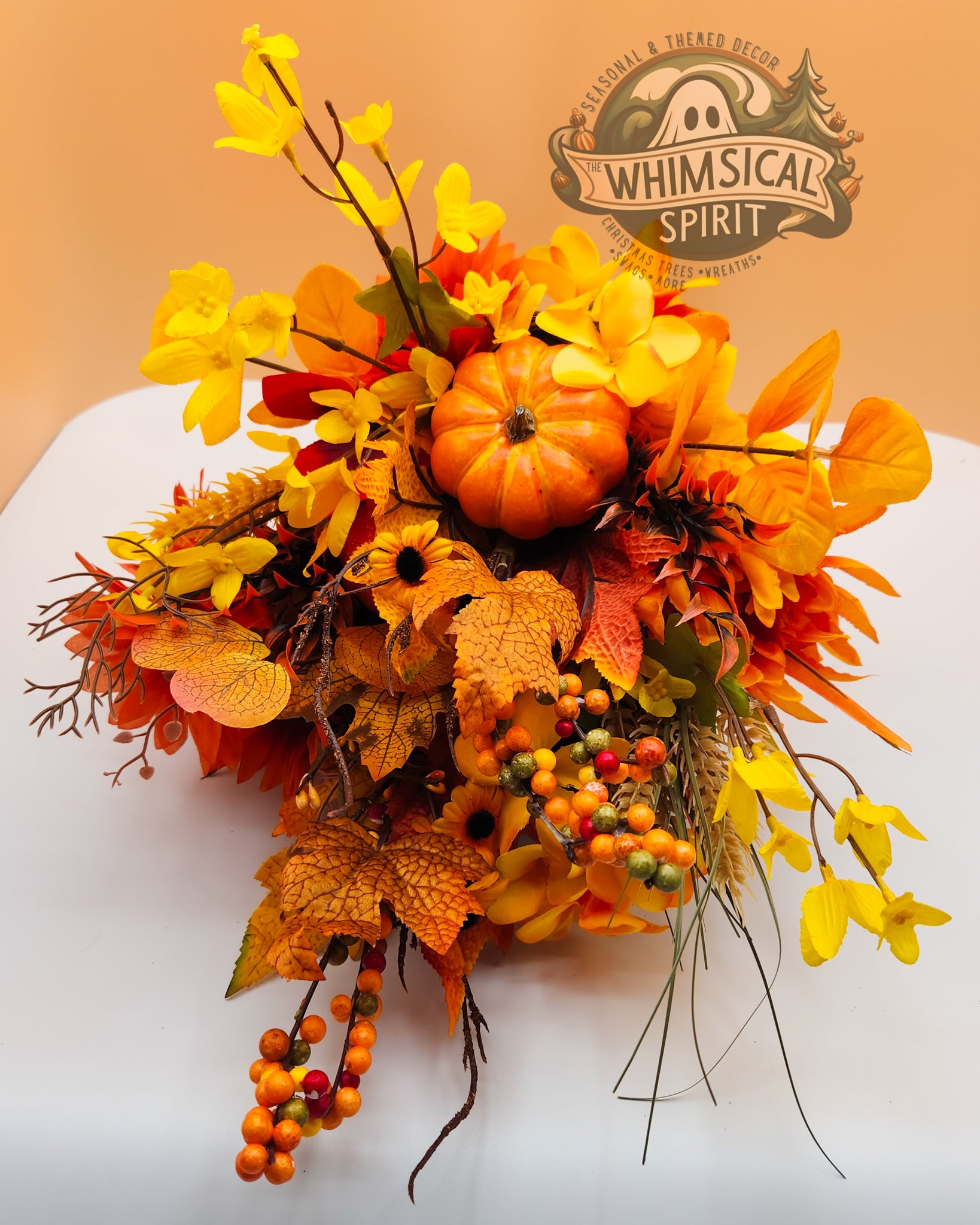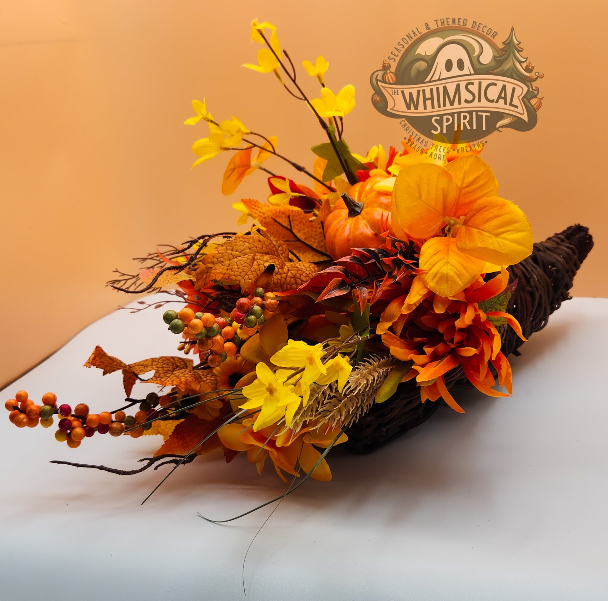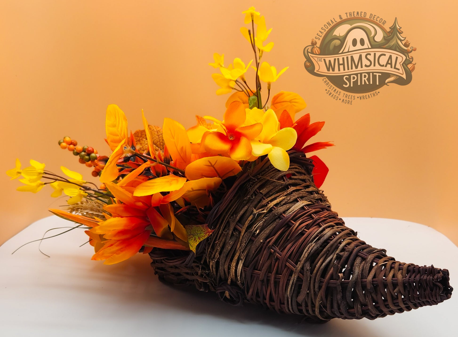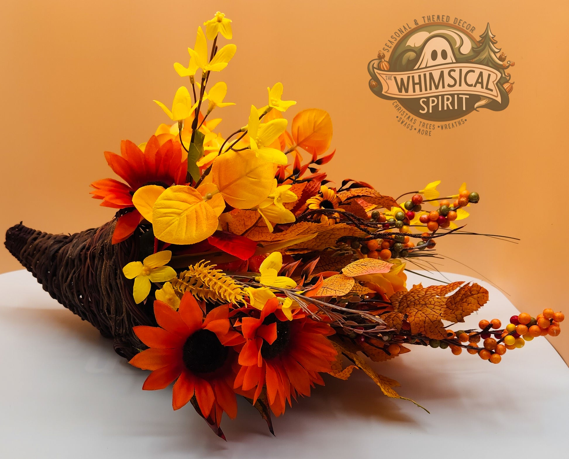Celebrate the warmth of the season with Golden Gathering. This radiant cornucopia centerpiece overflows with golden sunflowers, bright autumn blooms, and rich seasonal foliage, capturing the essence of a plentiful harvest. Perfect for gracing your Thanksgiving table, mantle, or entryway, it brings both elegance and festive charm to your home. A timeless symbol of abundance, this piece is sure to make every gathering feel extra special.