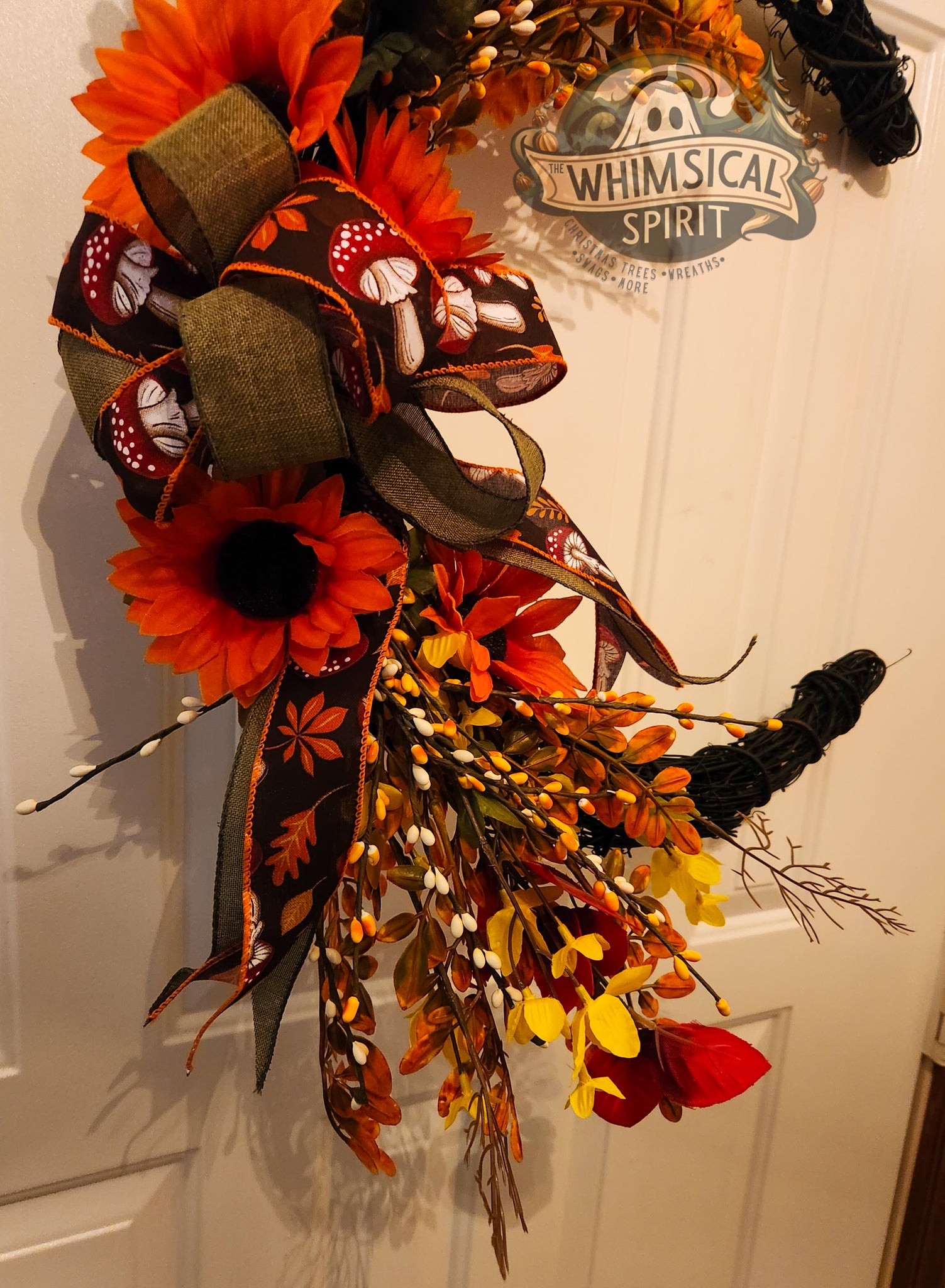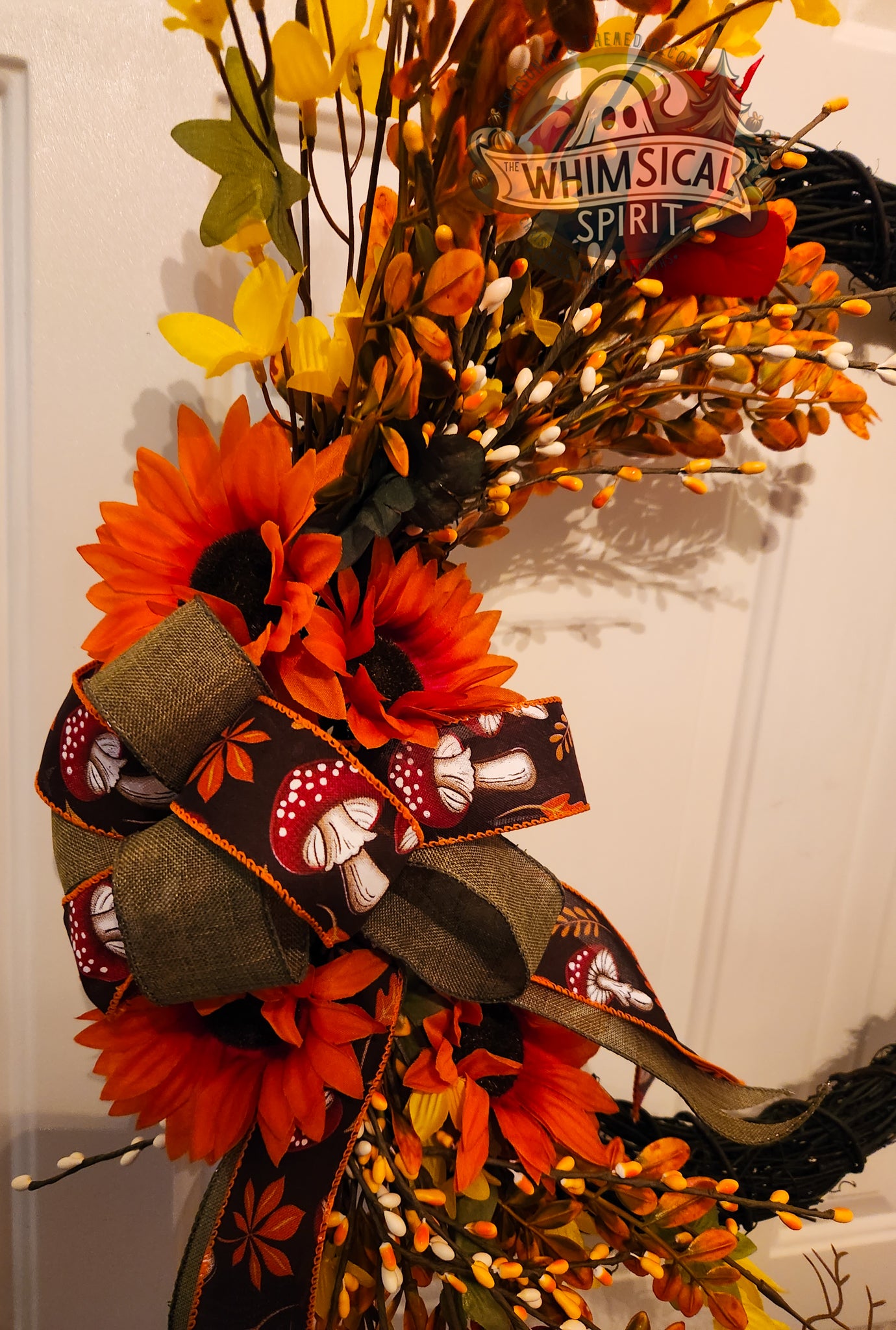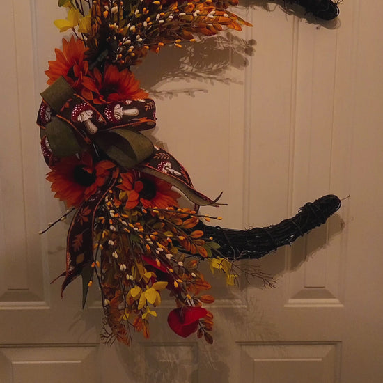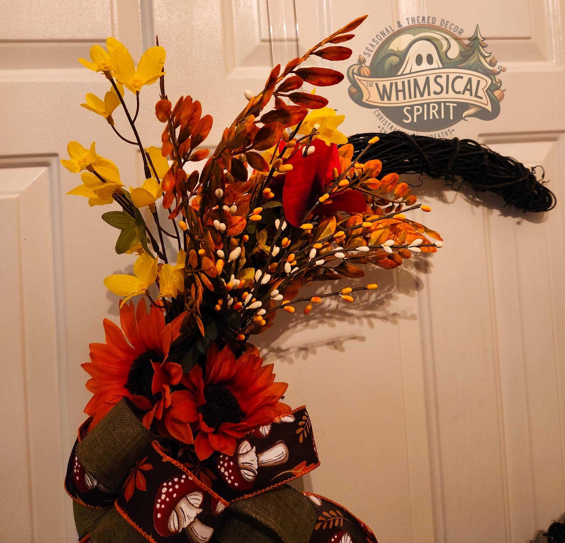 Harvest Crescent is a stunning nod to the changing seasons, blending rustic charm with celestial elegance. Designed in a unique crescent shape, this wreath features vibrant autumn florals, golden foliage, and pops of yellow and crimson—capturing the rich colors of fall’s bounty. A statement bow ties it all together, making it a perfect piece to welcome guests with cozy, harvest-season style.