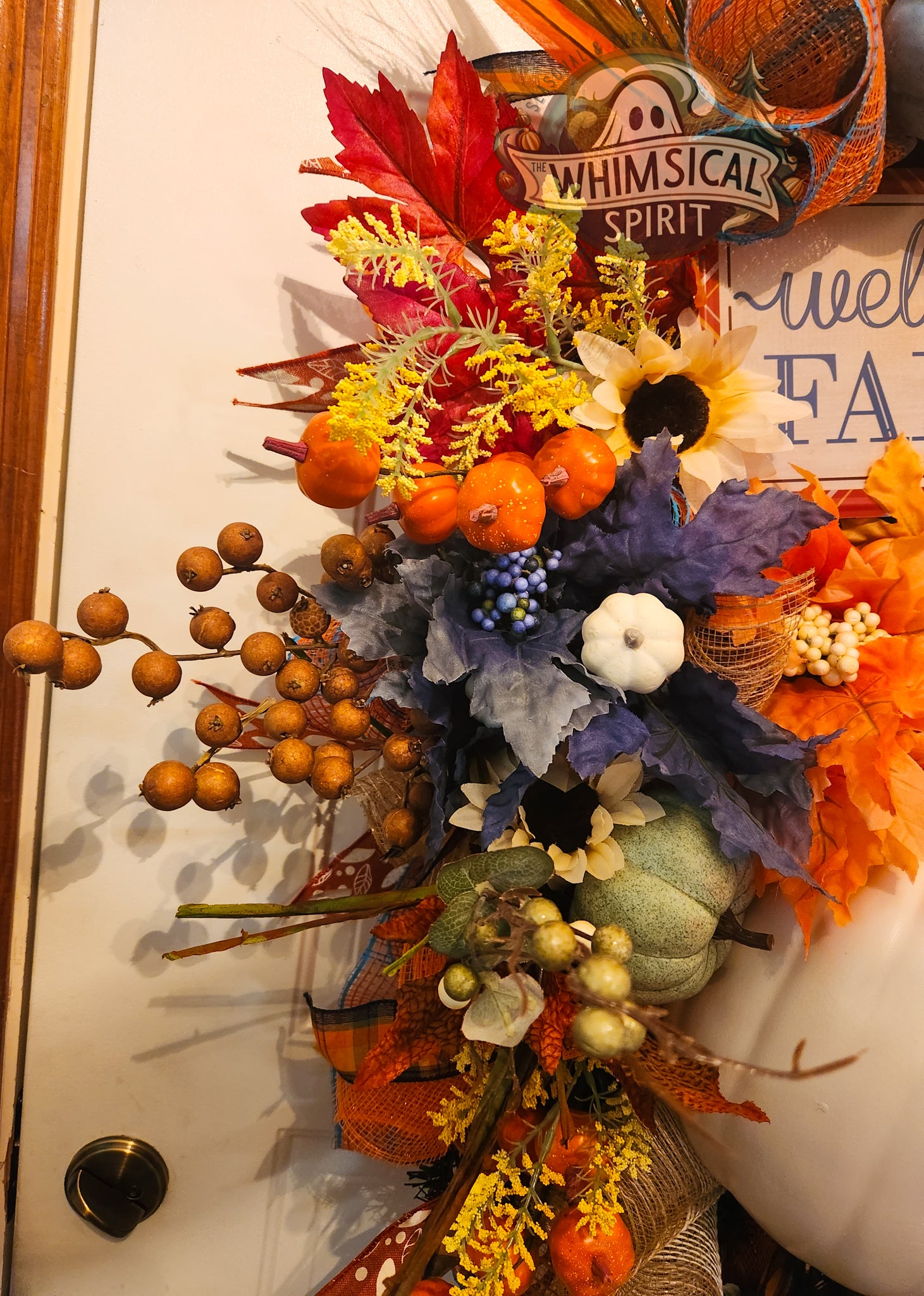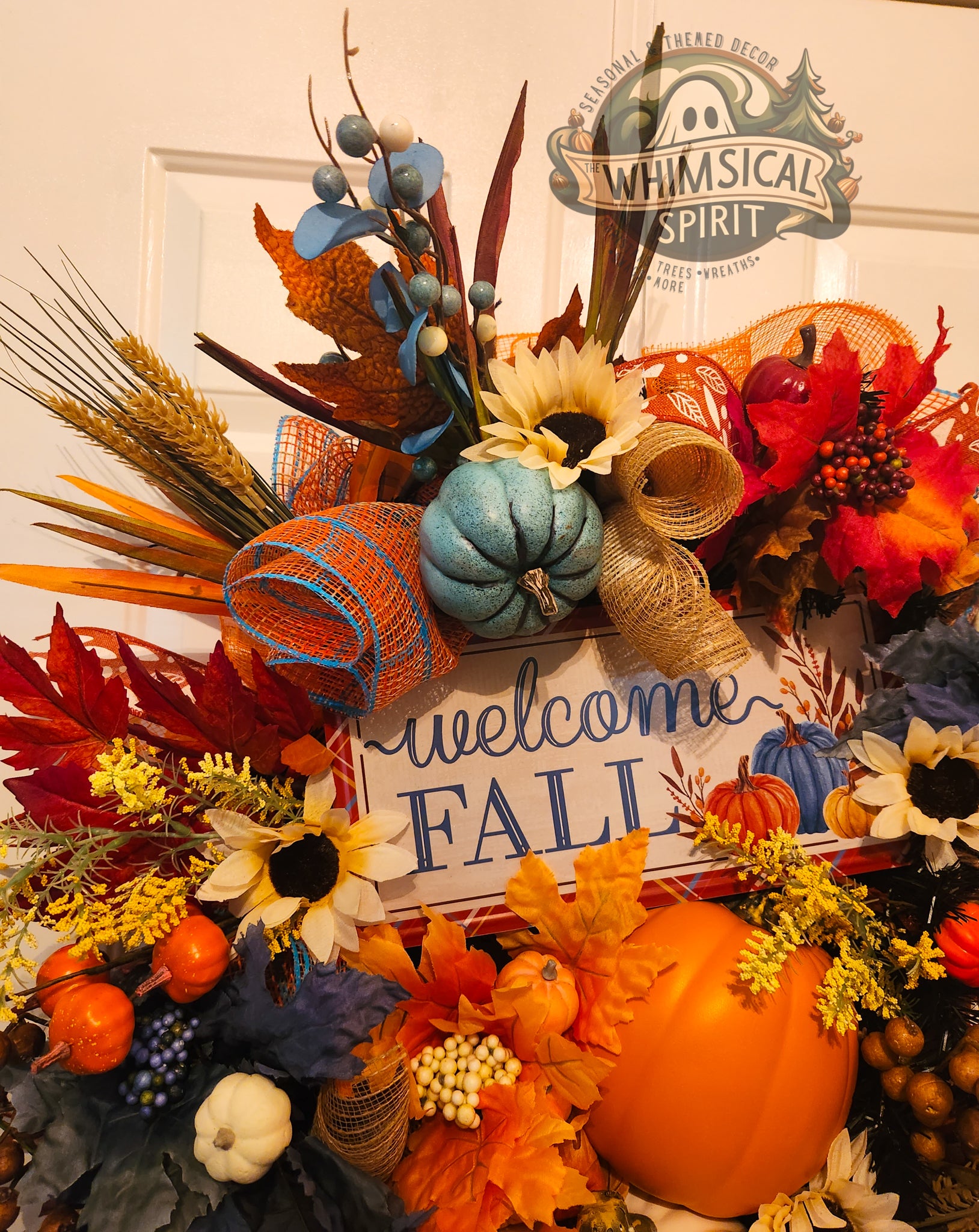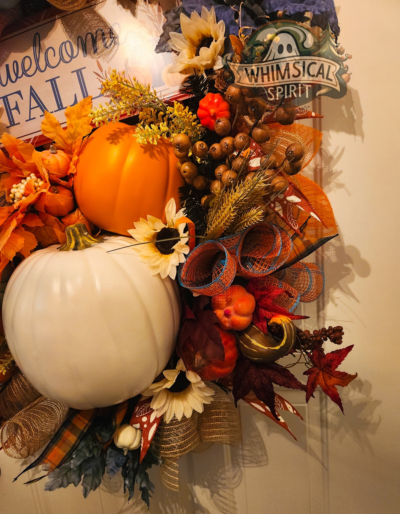 Welcome fall in full color with Rustic Glow, a handcrafted wreath bursting with seasonal charm. This one-of-a-kind piece features a delightful mix of lifelike pumpkins, sunflowers, fall foliage, berries, and rustic ribbons in warm oranges, creams, deep blues, and golden yellows. Perfect for front doors, entryways, or above a mantel, this wreath adds a touch of whimsy and warmth to your seasonal décor. Whether you’re decorating for fall festivals, Thanksgiving, or simply celebrating sweater weather, this wreath is a stunning statement piece for any autumn lover.