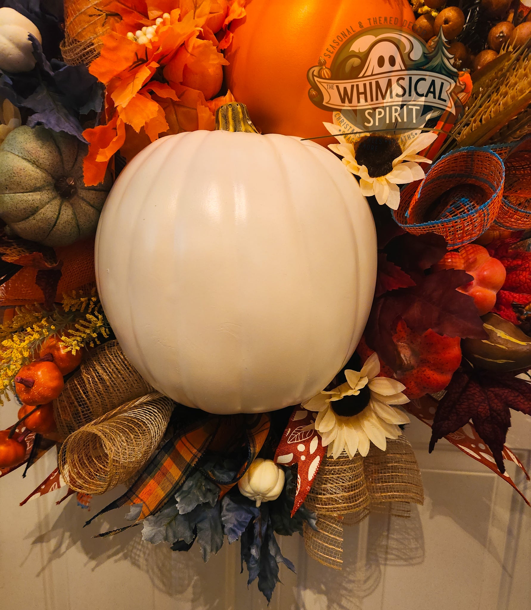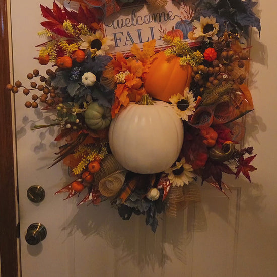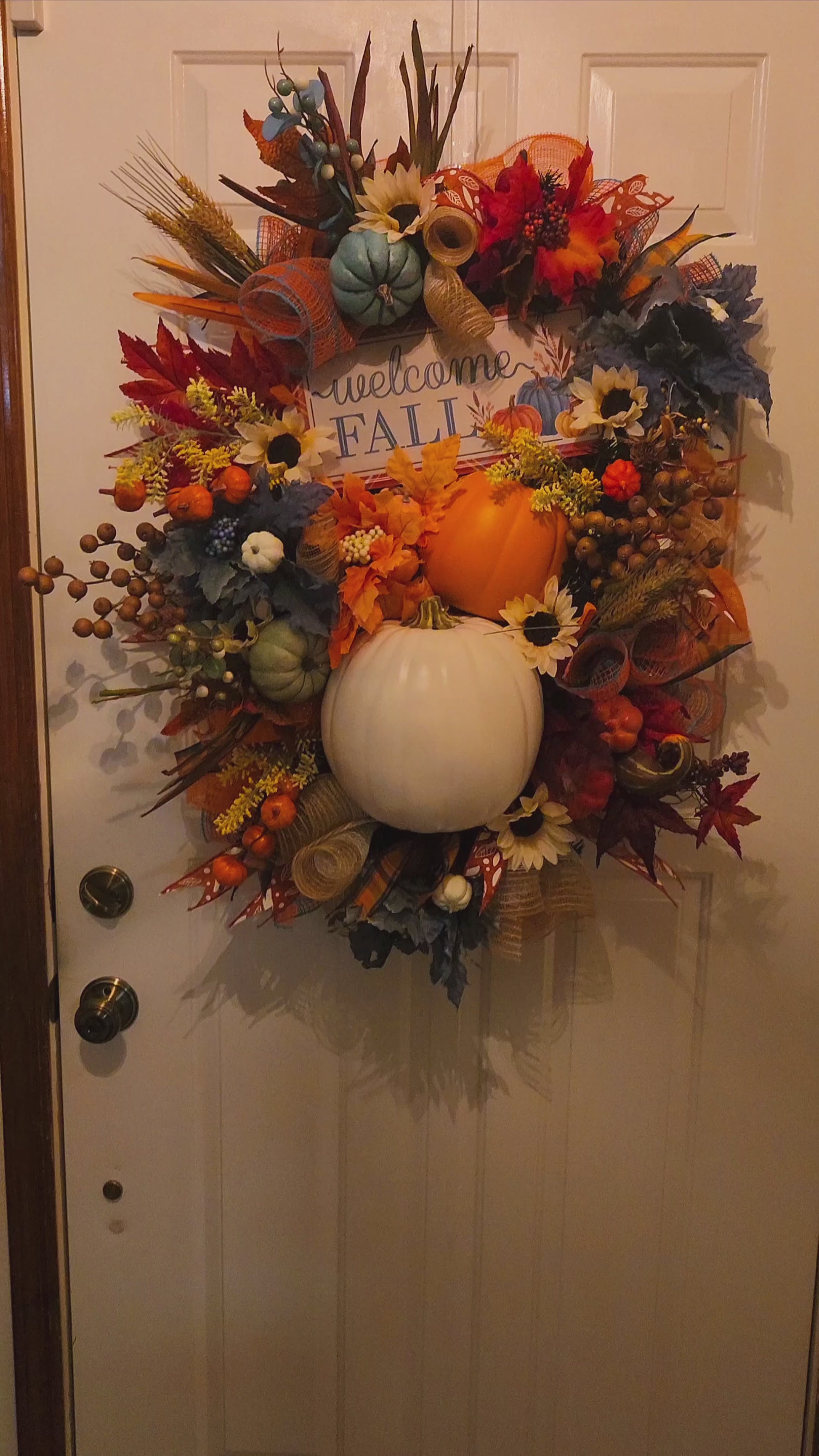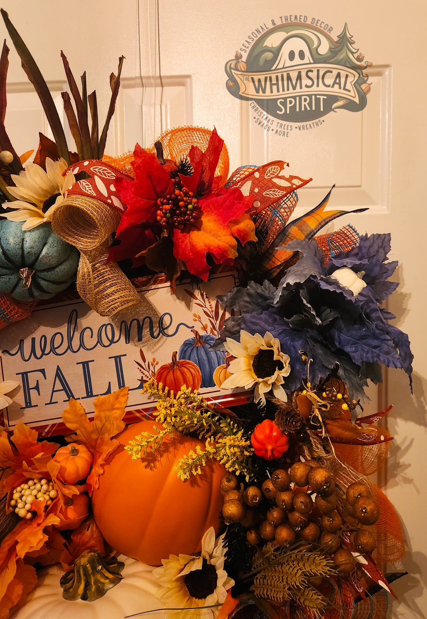 Welcome fall in full color with Rustic Glow, a handcrafted wreath bursting with seasonal charm. This one-of-a-kind piece features a delightful mix of lifelike pumpkins, sunflowers, fall foliage, berries, and rustic ribbons in warm oranges, creams, deep blues, and golden yellows. Perfect for front doors, entryways, or above a mantel, this wreath adds a touch of whimsy and warmth to your seasonal décor. Whether you’re decorating for fall festivals, Thanksgiving, or simply celebrating sweater weather, this wreath is a stunning statement piece for any autumn lover.