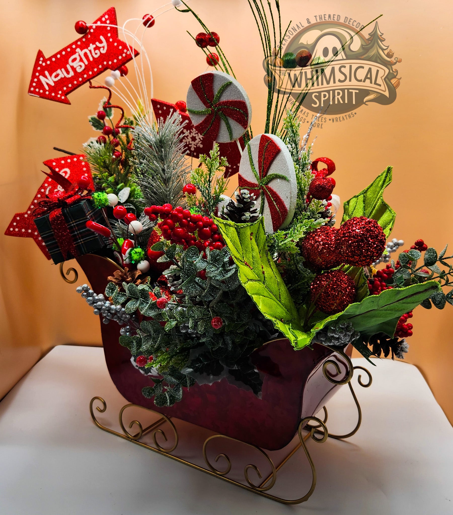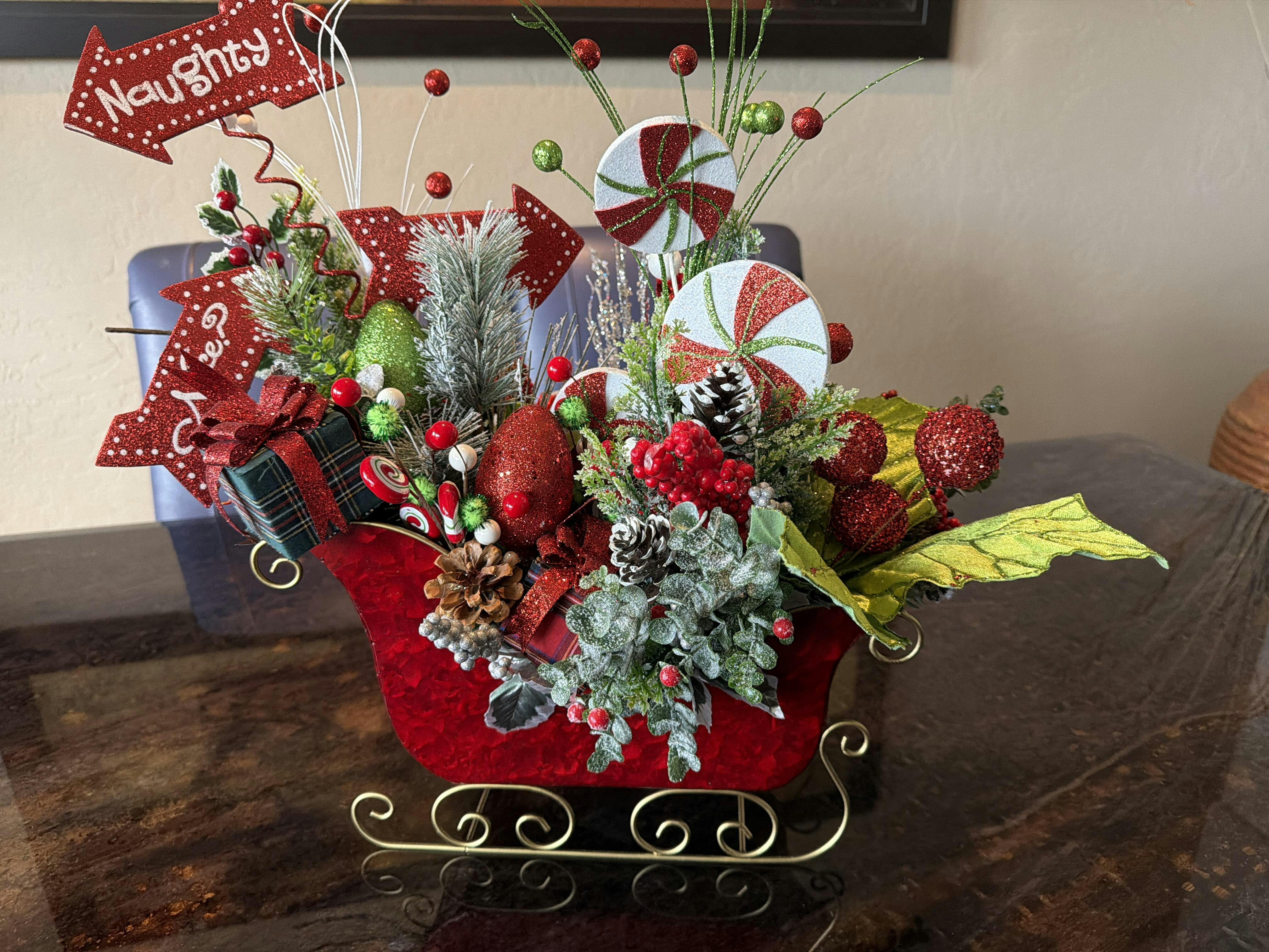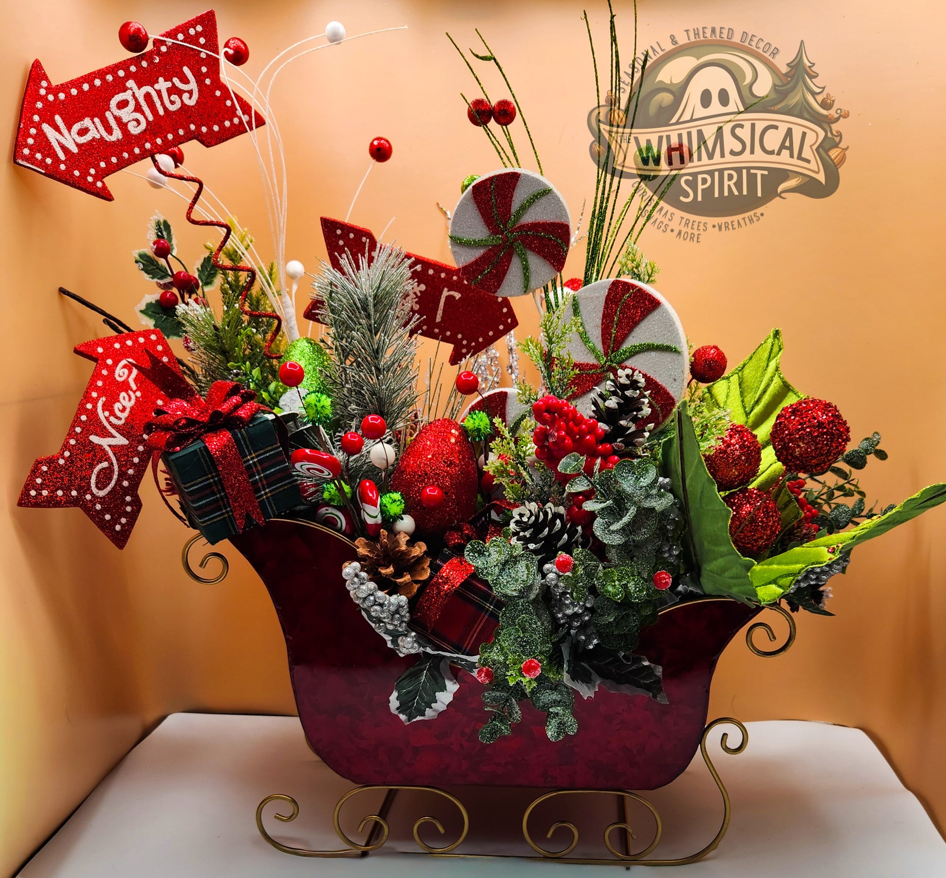 Bright pops of red, cheerful berries, and festive ribbon dance together in a swirl of “Naughty or Nice” delight, creating a centerpiece that’s equal parts whimsical and wonderful. Perfect for a dining table, entryway, or sideboard, Santa’s Sweet Escape adds a dash of sugar, spice, and pure Christmas cheer to any space.