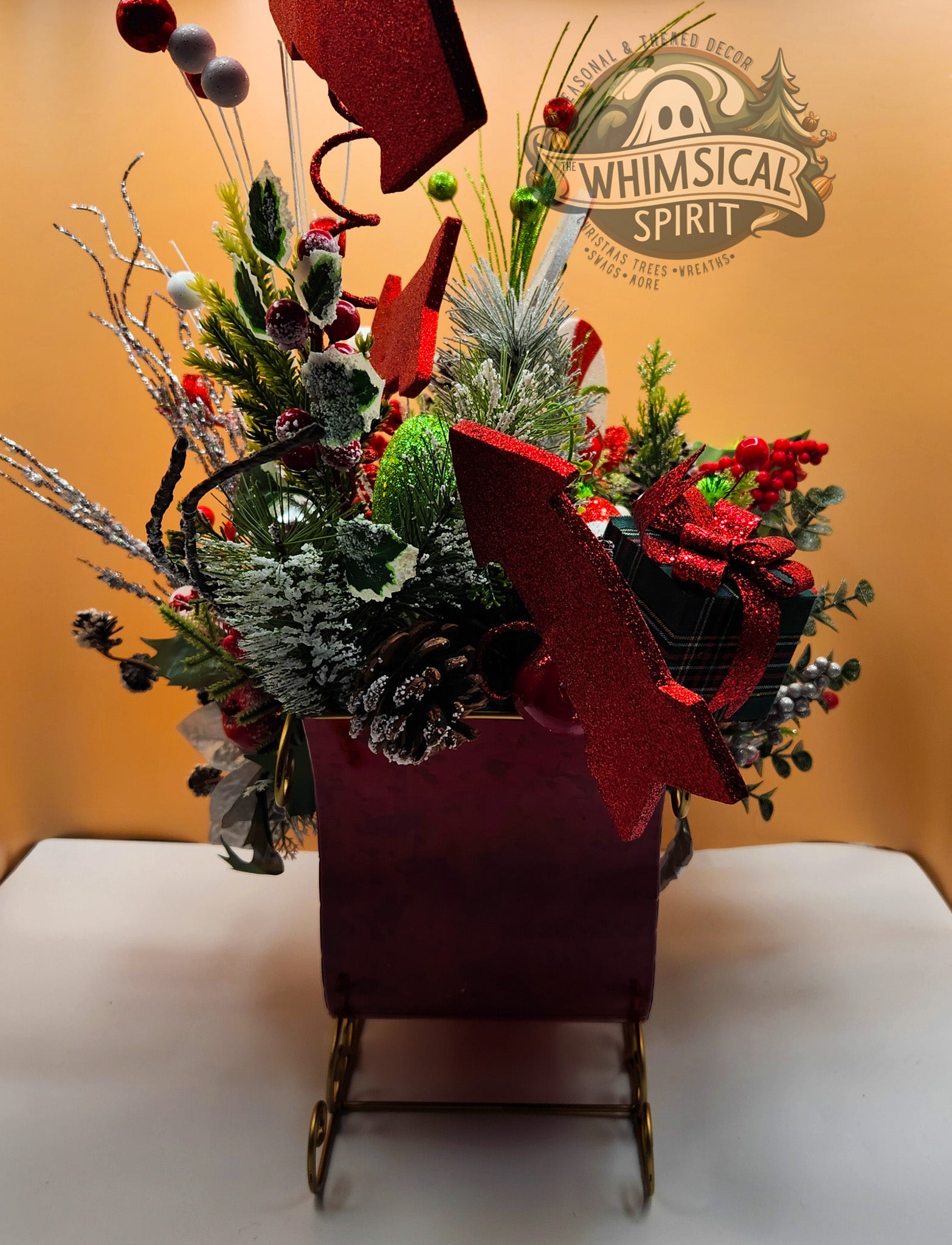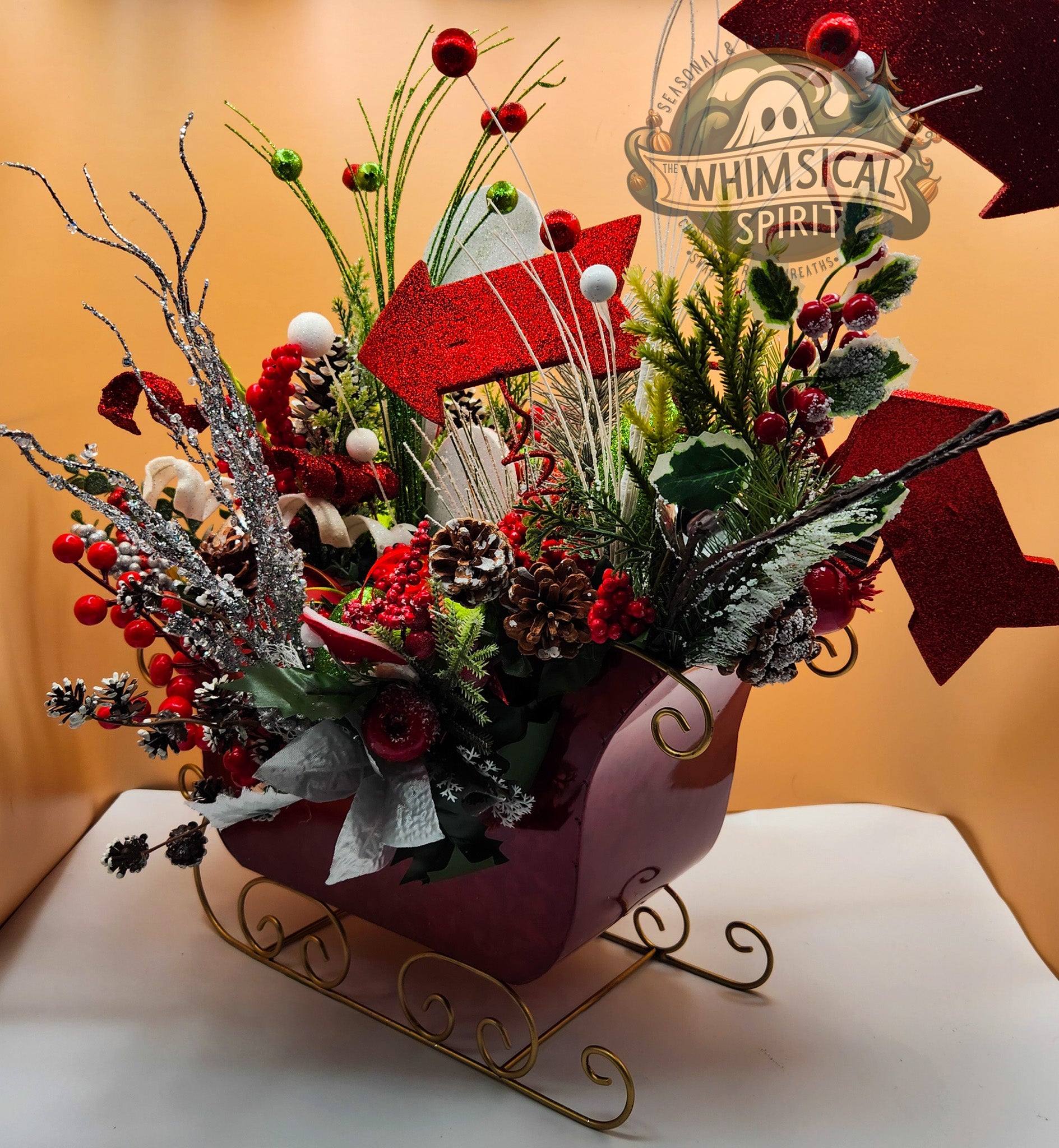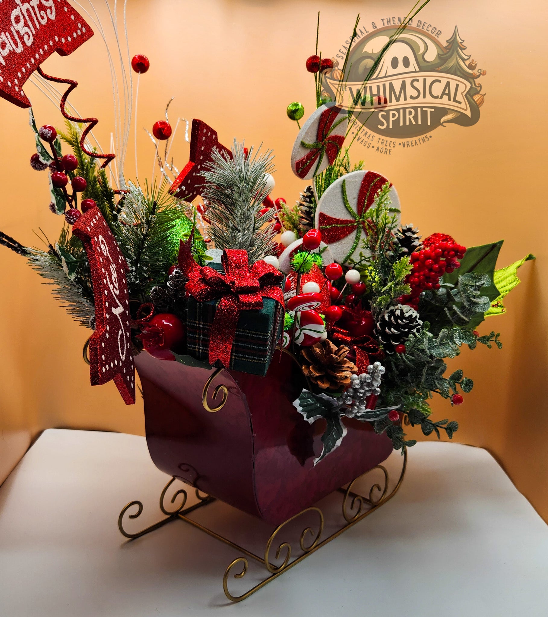 Bright pops of red, cheerful berries, and festive ribbon dance together in a swirl of “Naughty or Nice” delight, creating a centerpiece that’s equal parts whimsical and wonderful. Perfect for a dining table, entryway, or sideboard, Santa’s Sweet Escape adds a dash of sugar, spice, and pure Christmas cheer to any space.