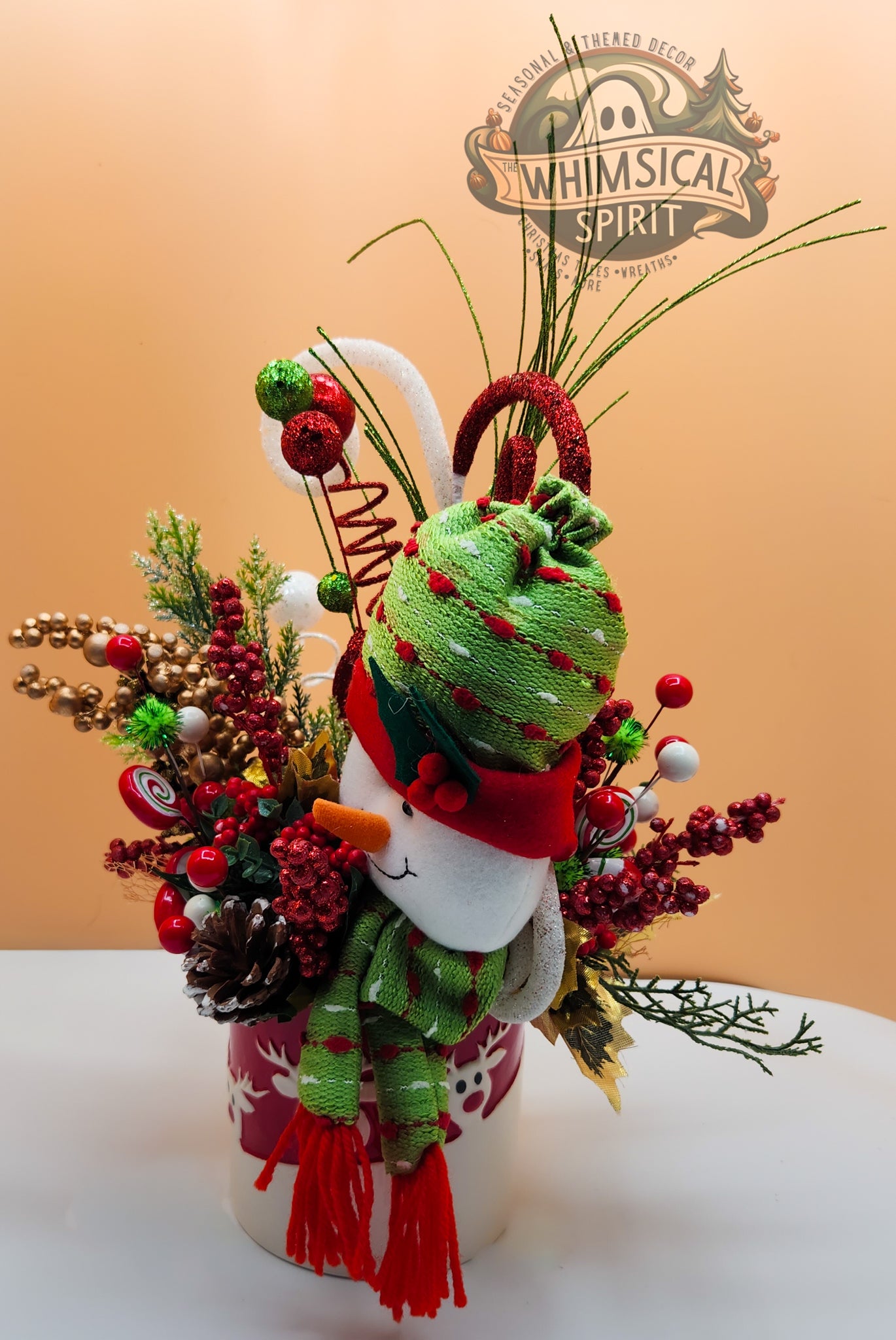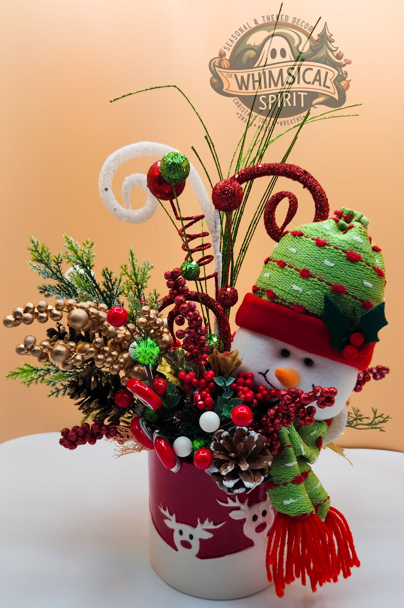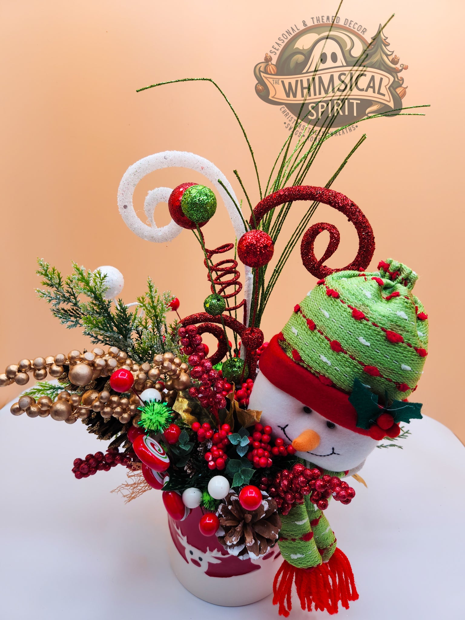 Celebrate the magic of winter’s wonder with Snowday Sparkle - a cheerful centerpiece bursting with playful charm and frosted delight. This jolly design features a smiling snowman bundled in his cozy green hat and scarf, surrounded by shimmering pine, bright berries, candy accents, and glittered curls that dance with whimsy.