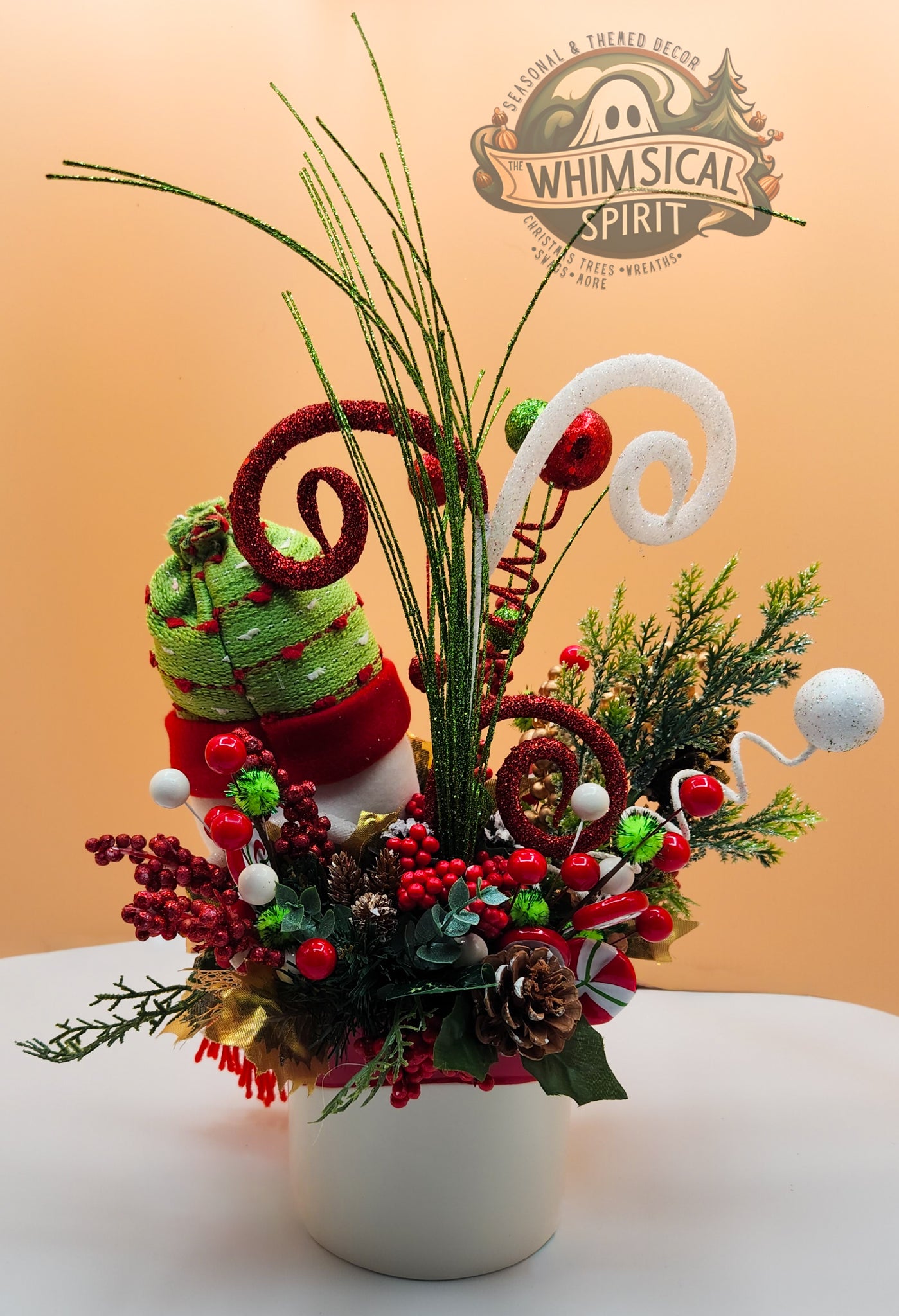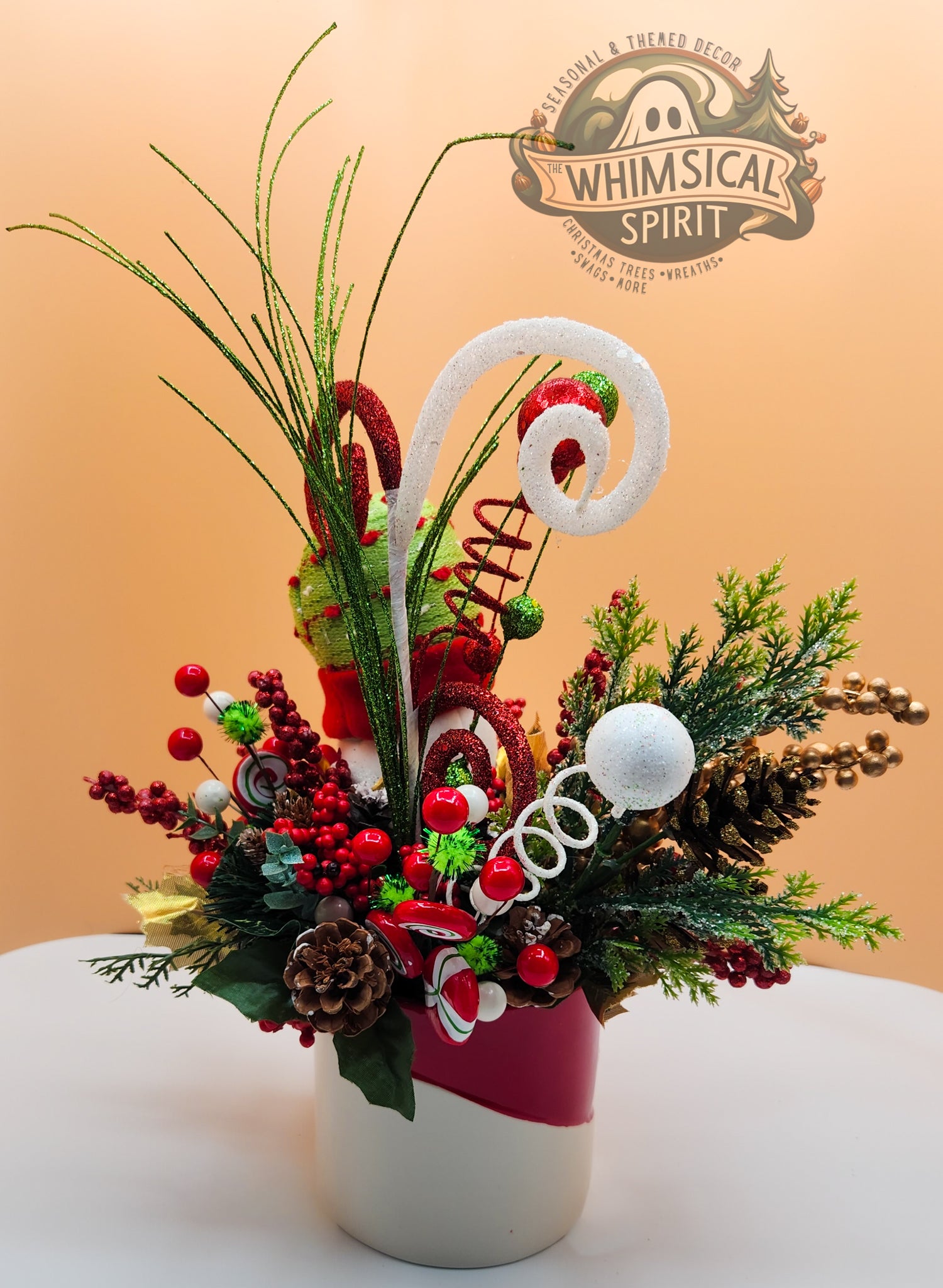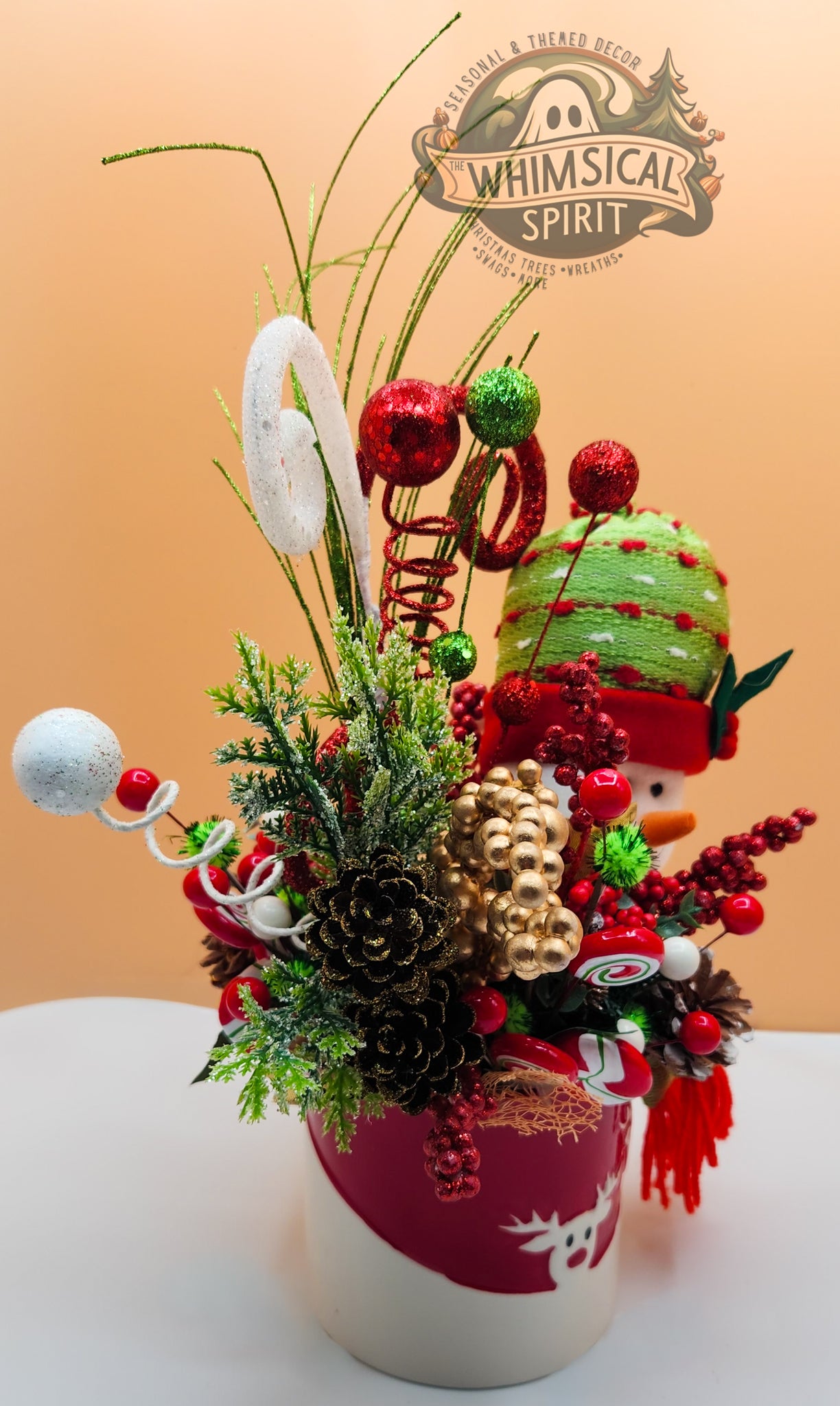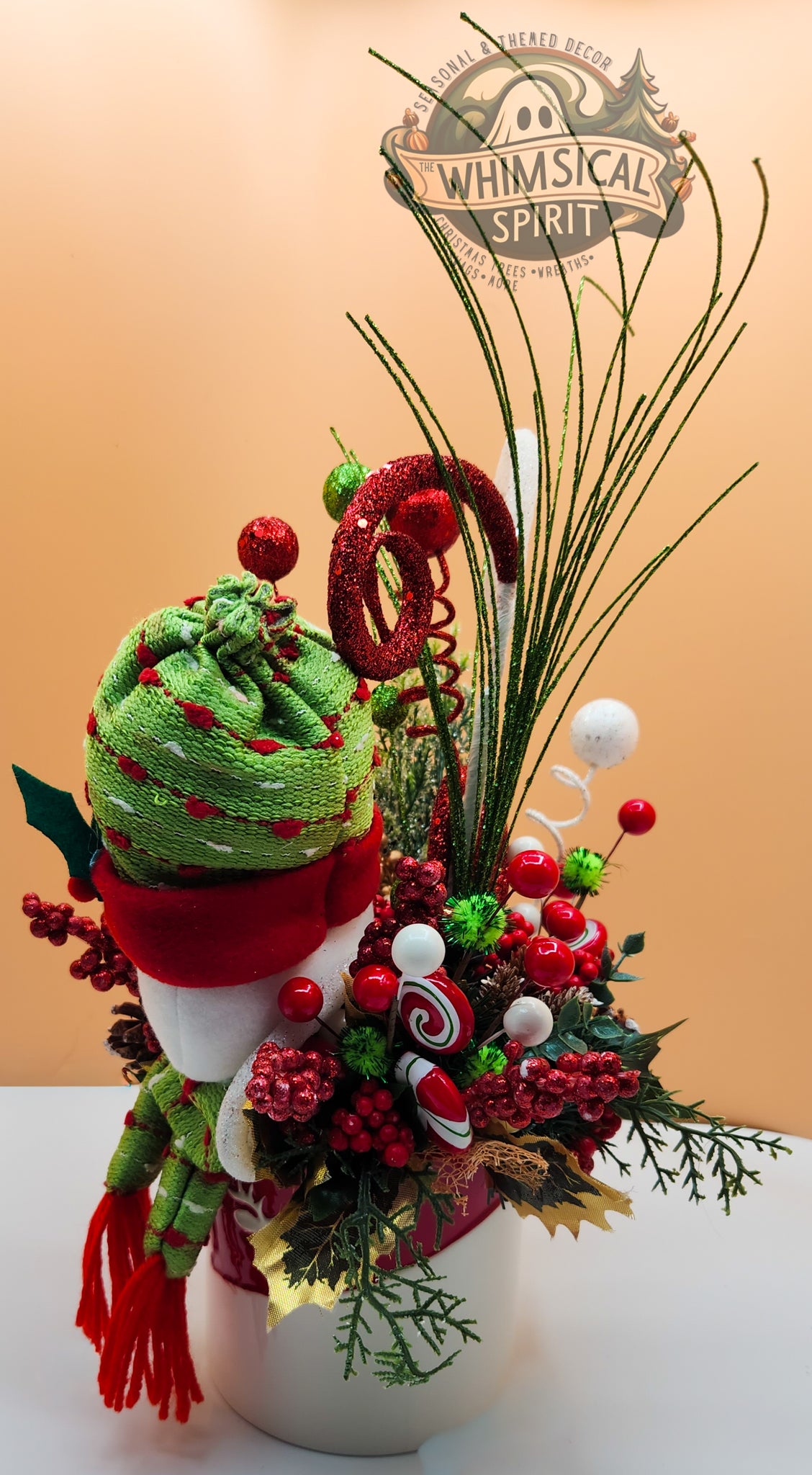 Celebrate the magic of winter’s wonder with Snowday Sparkle - a cheerful centerpiece bursting with playful charm and frosted delight. This jolly design features a smiling snowman bundled in his cozy green hat and scarf, surrounded by shimmering pine, bright berries, candy accents, and glittered curls that dance with whimsy.