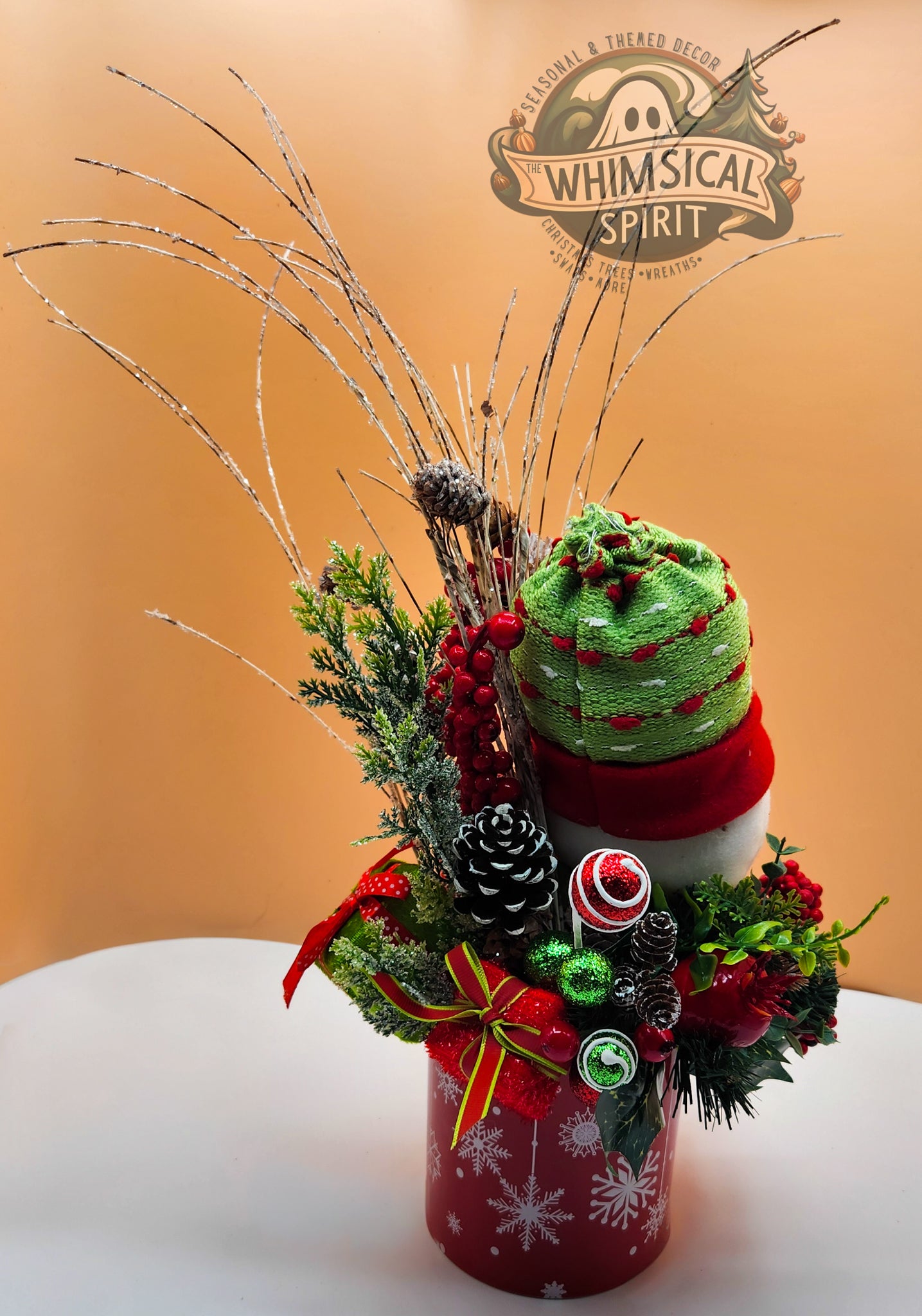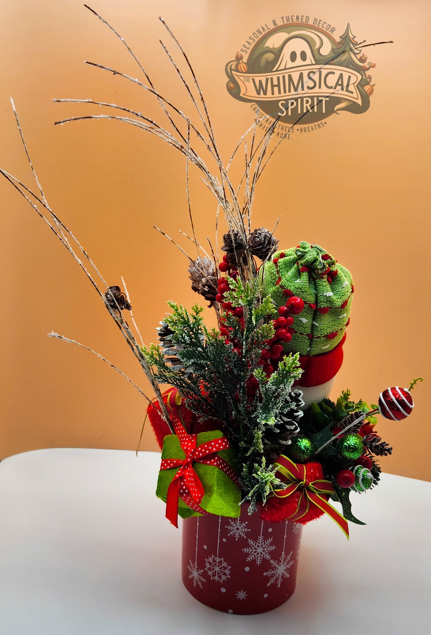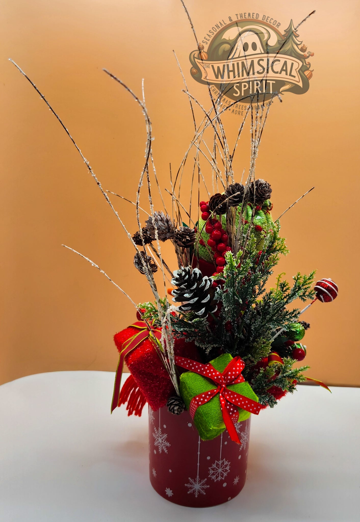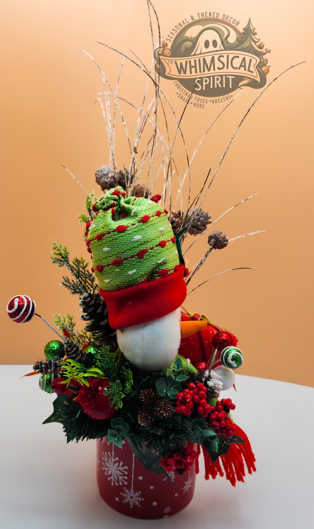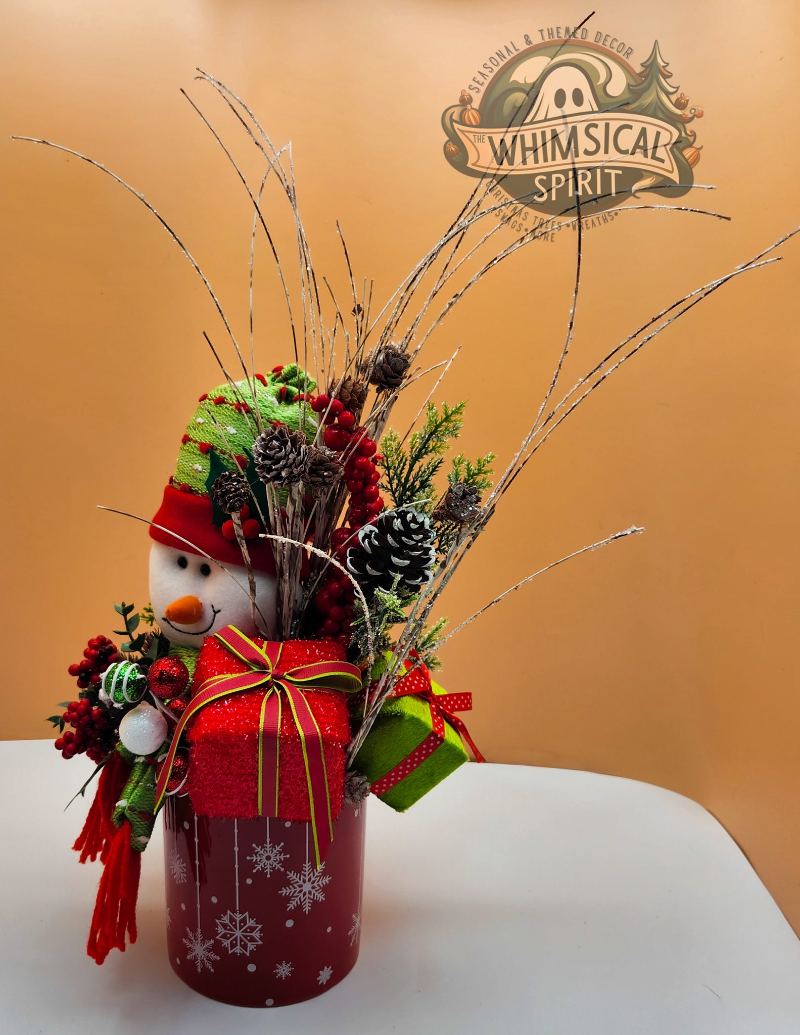 Bring the joy of a snow-kissed Christmas morning into your home with Snowy Merriment. This playful centerpiece features a smiling snowman bundled in his cozy hat and scarf, surrounded by frosted greenery, bright red berries, glittering pinecones, and a sparkling gift wrapped in festive cheer.