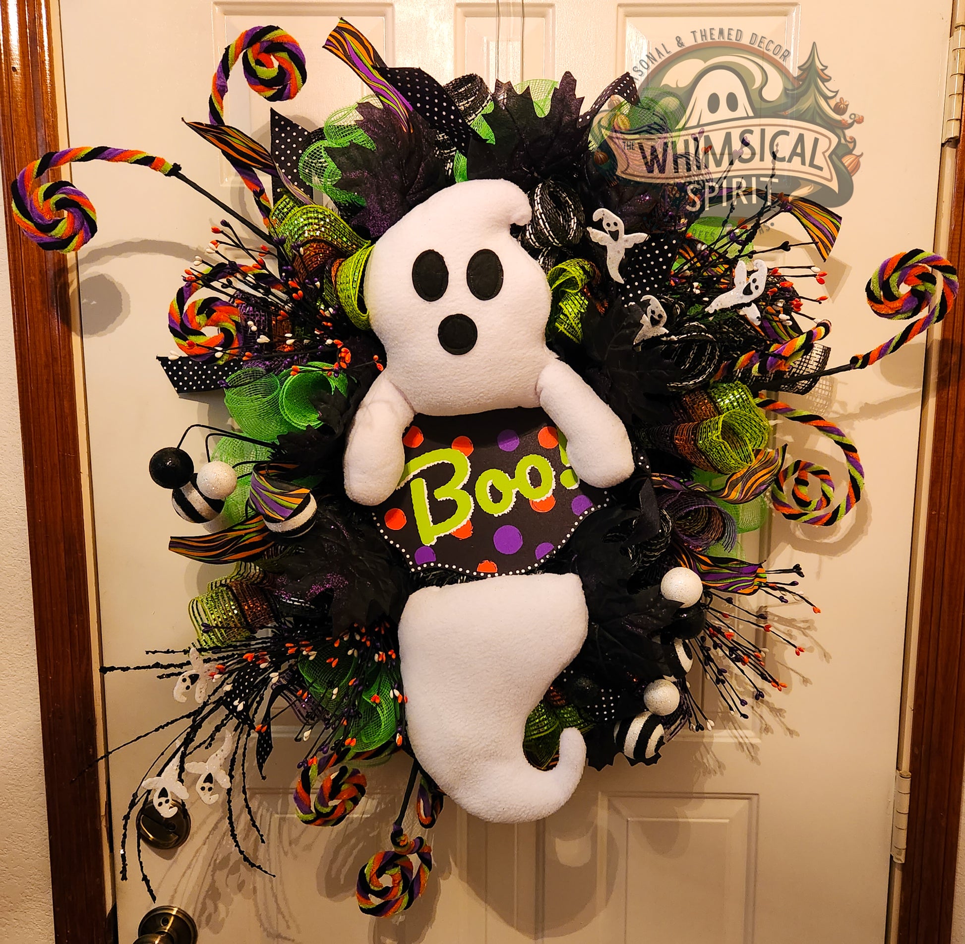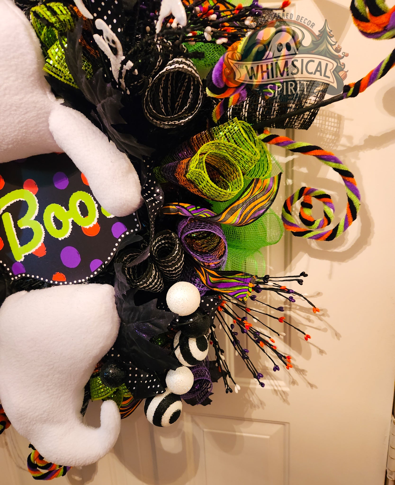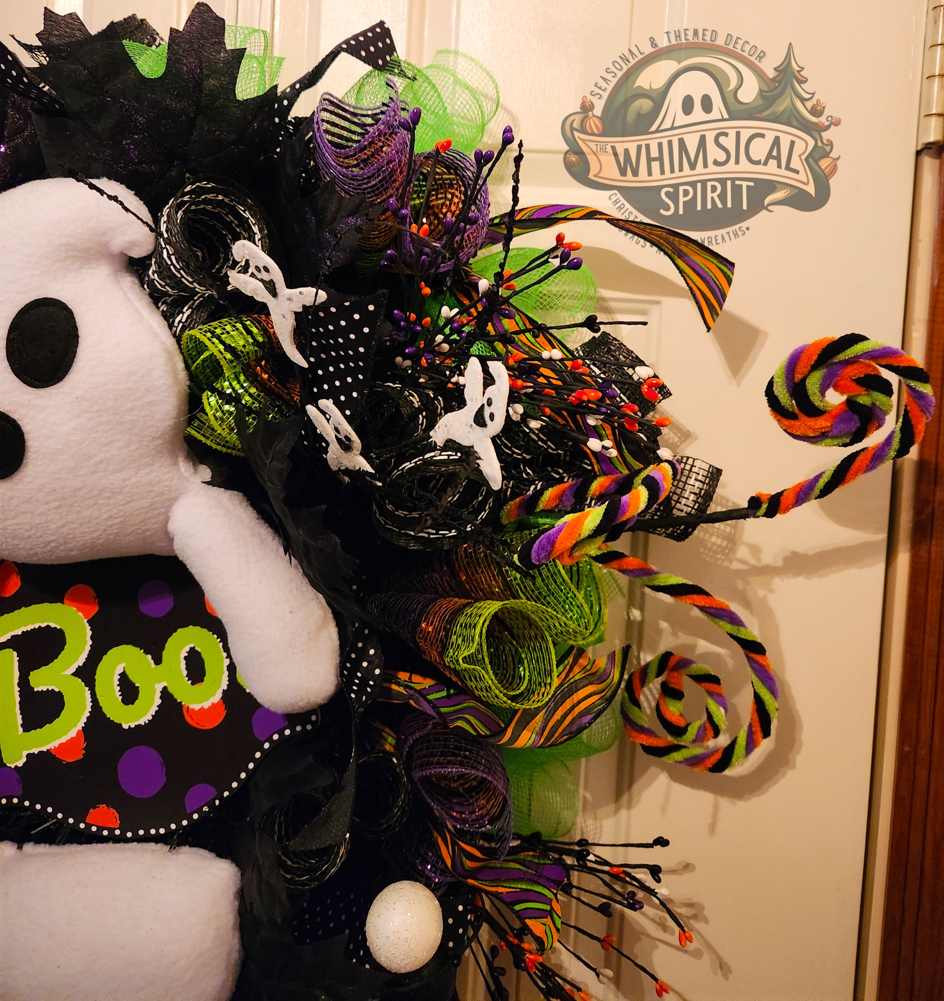 Bring a playful touch of Halloween fun to your door with Sugar Spook. This whimsical wreath features a friendly ghost at its center, surrounded by a burst of candy-colored swirls, vibrant ribbons, and festive details that scream “trick-or-treat!” The mix of bold black, neon green, and pops of purple and orange give it a lively, eye-catching charm—perfect for welcoming guests, little ghouls, and goblins alike. Sweet yet spooky, this one-of-a-kind piece is sure to be the treat of your Halloween décor.