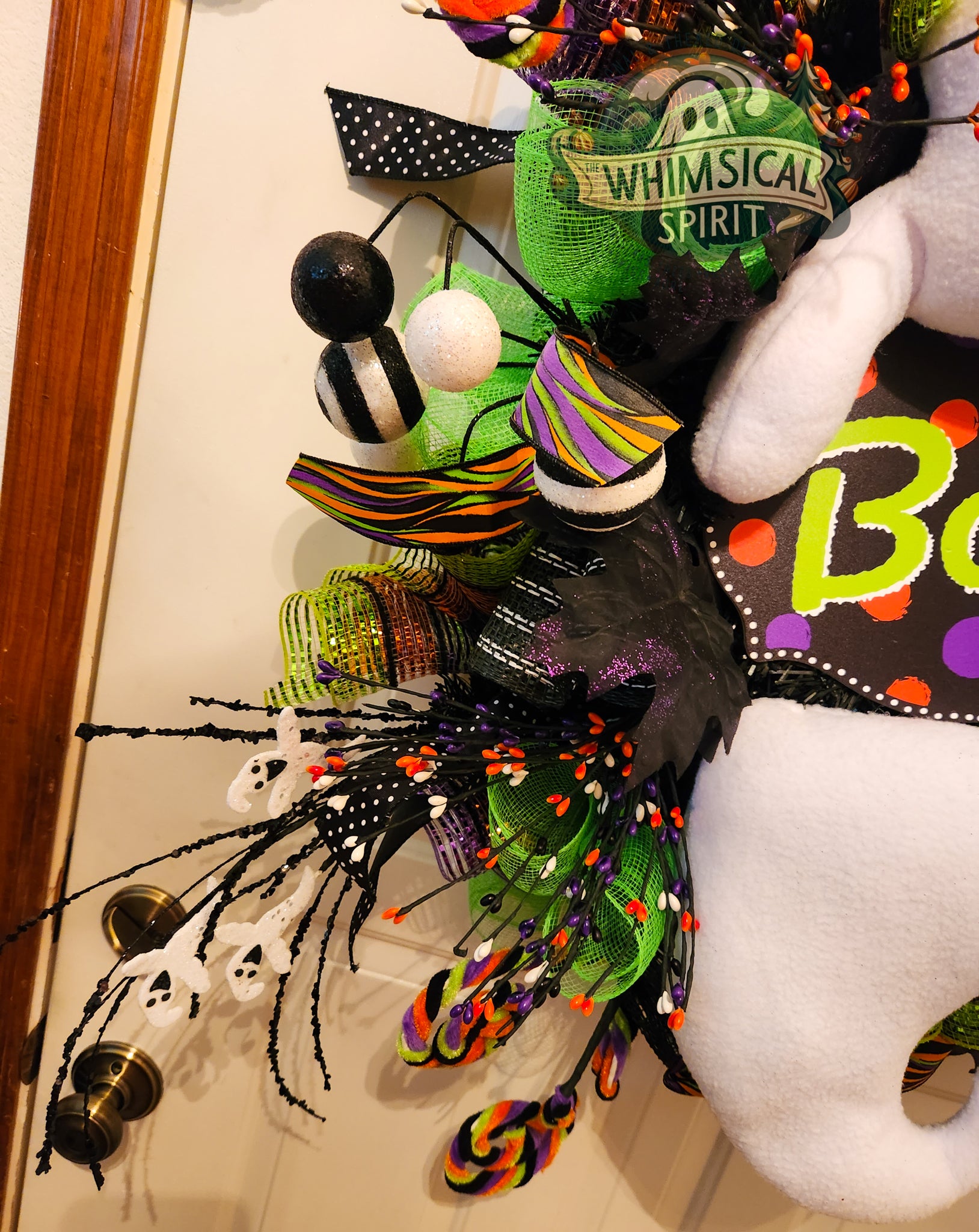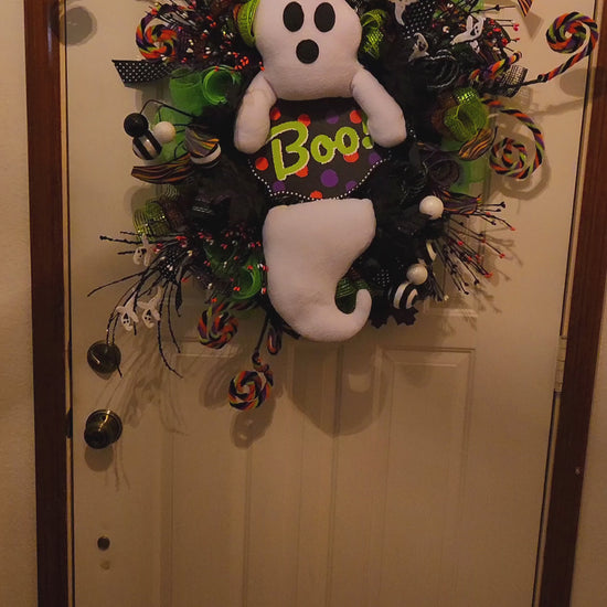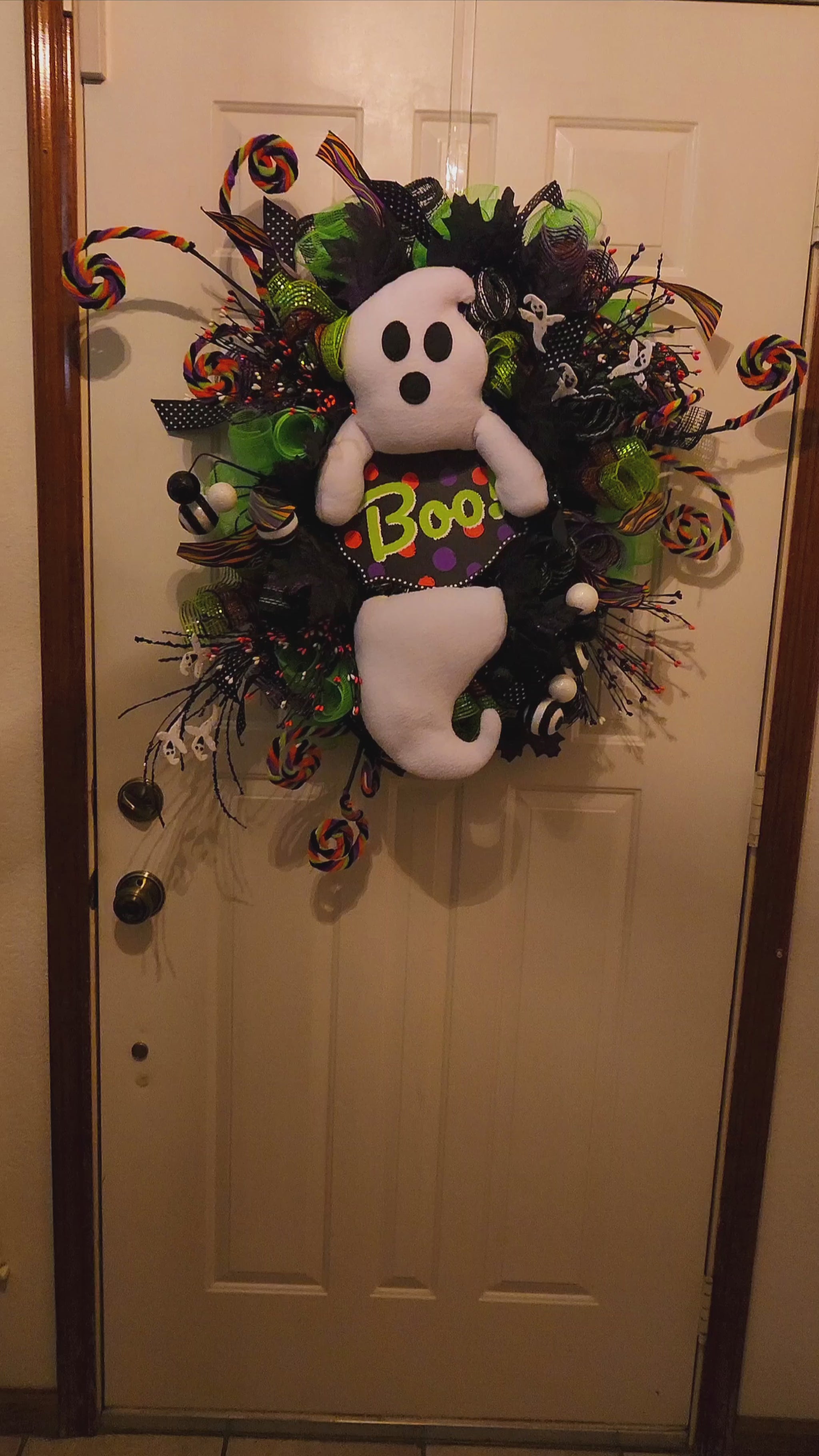 Bring a playful touch of Halloween fun to your door with Sugar Spook. This whimsical wreath features a friendly ghost at its center, surrounded by a burst of candy-colored swirls, vibrant ribbons, and festive details that scream “trick-or-treat!” The mix of bold black, neon green, and pops of purple and orange give it a lively, eye-catching charm—perfect for welcoming guests, little ghouls, and goblins alike. Sweet yet spooky, this one-of-a-kind piece is sure to be the treat of your Halloween décor.