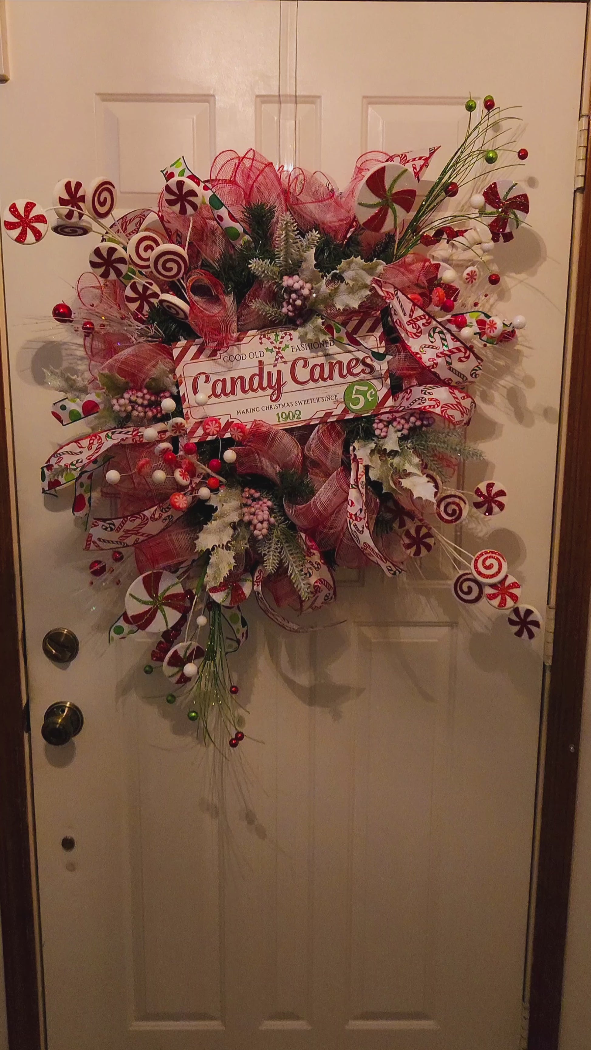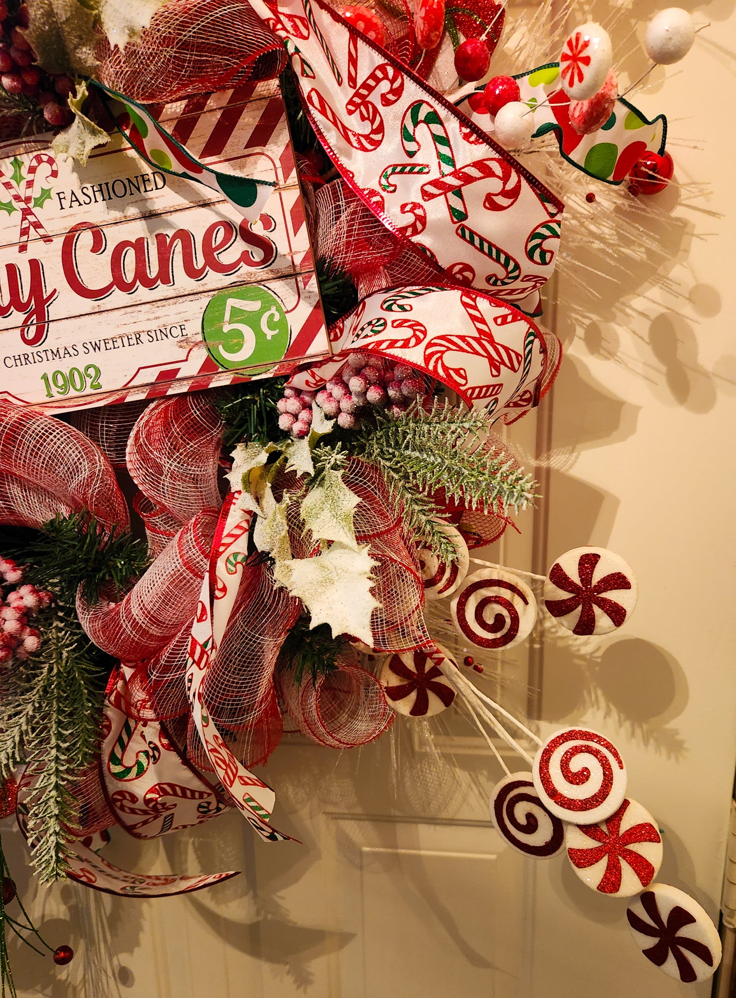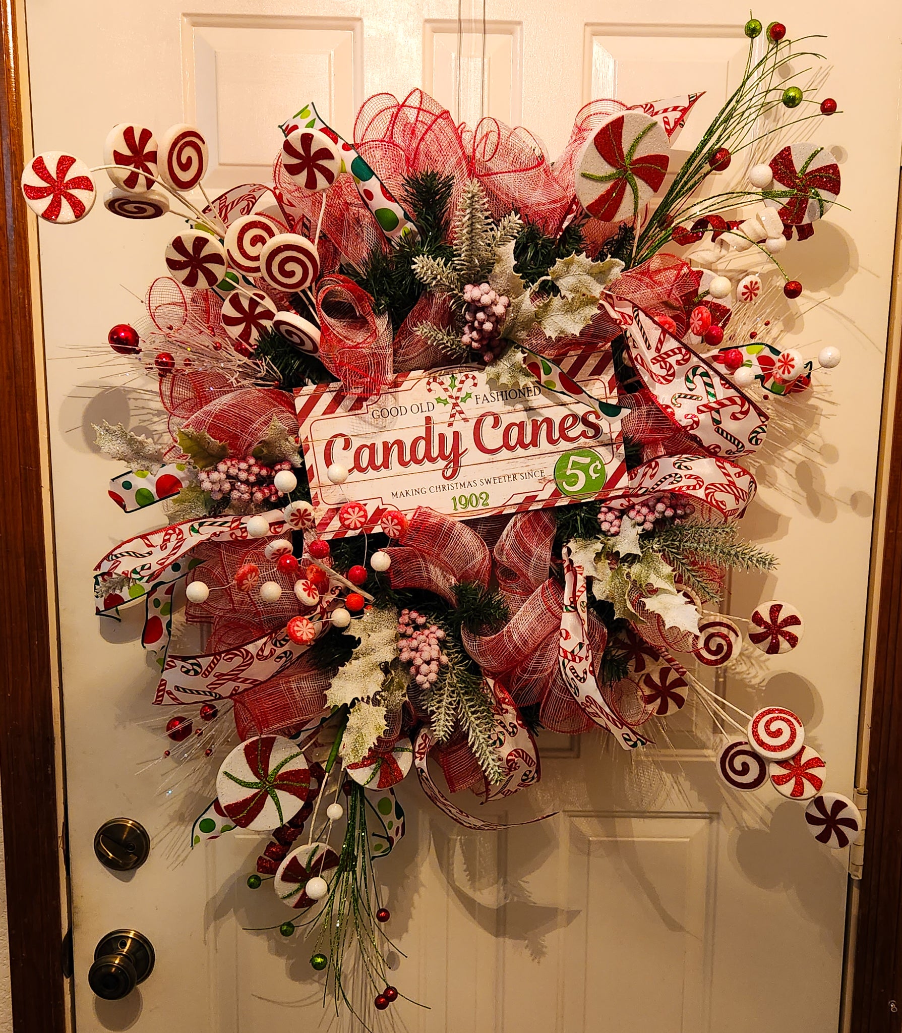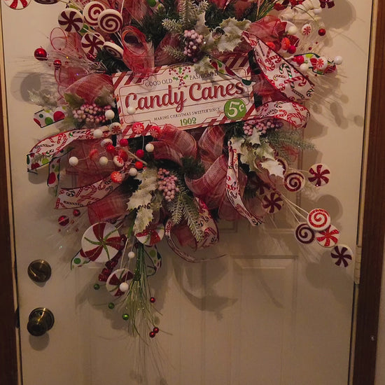 Step back in time to a holiday straight out of a storybook with Sweet Shoppe Christmas! Inspired by vintage candy counters and peppermint dreams, this wreath overflows with sugary cheer. Swirled peppermint candies, red and white ribbons, frosted greenery, and a classic “Candy Canes 5¢” sign come together to create a festive scene that feels like it belongs in Santa’s own sweet shop.