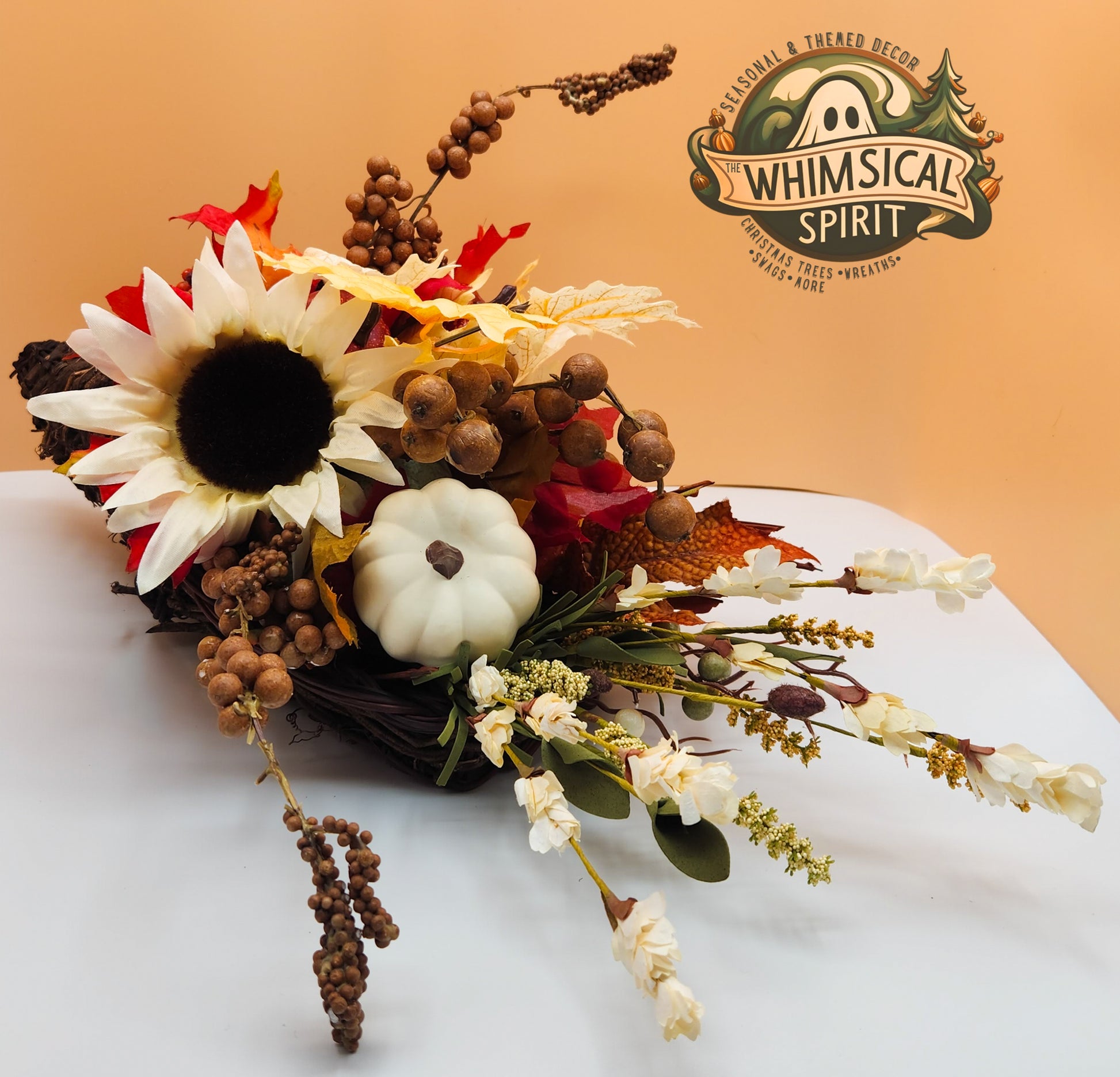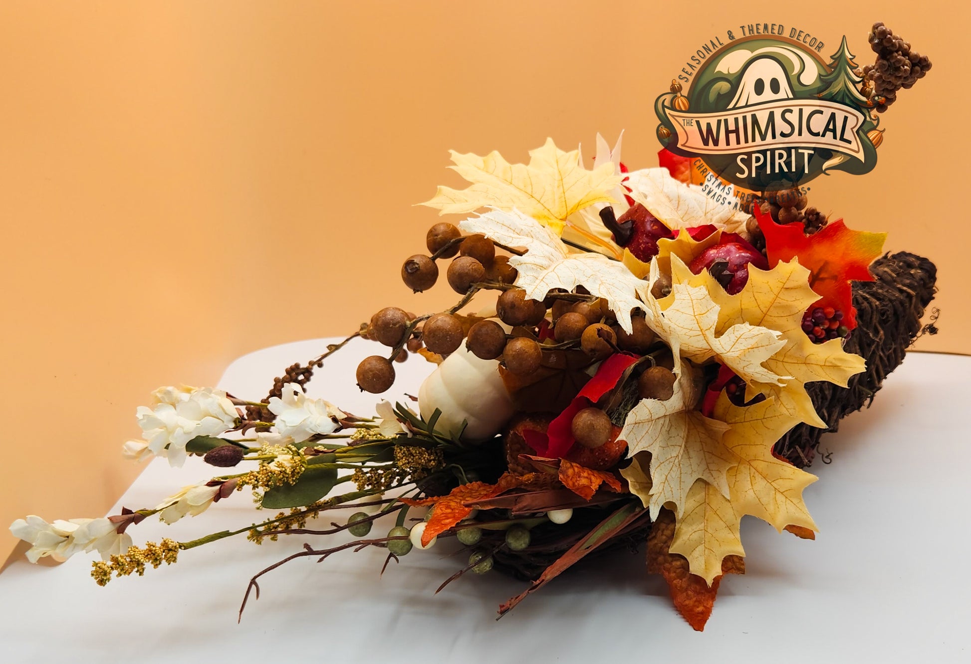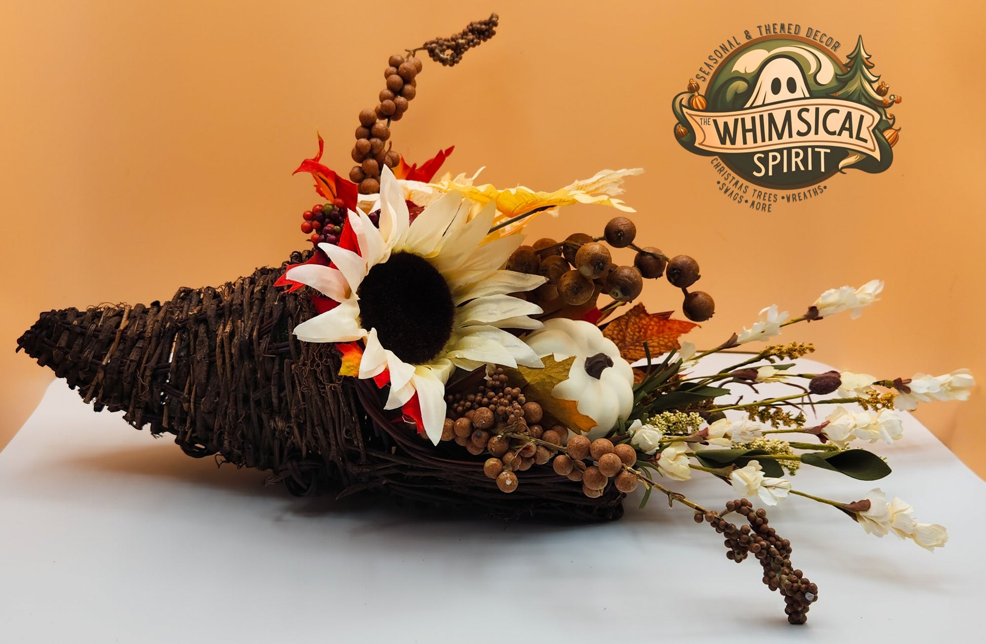 Celebrate the beauty of the season with Timeless Harvest. This elegant cornucopia centerpiece overflows with classic autumn charm—featuring creamy white pumpkins, sunflowers, berries, and fall foliage in rich seasonal tones. Designed to bring warmth and sophistication to your table, mantle, or entryway, it’s the perfect piece for Thanksgiving gatherings or adding a graceful touch of harvest abundance to your home décor.