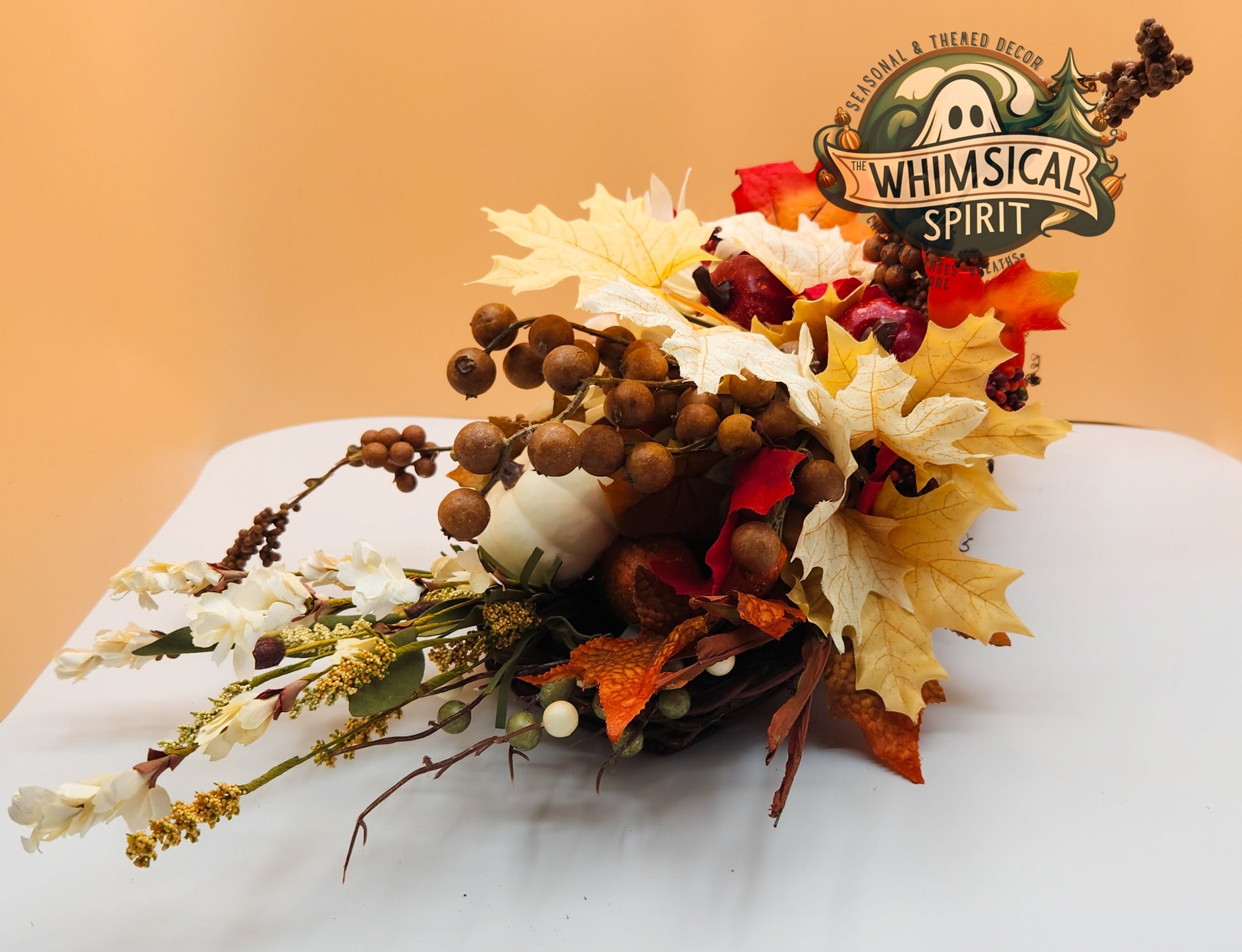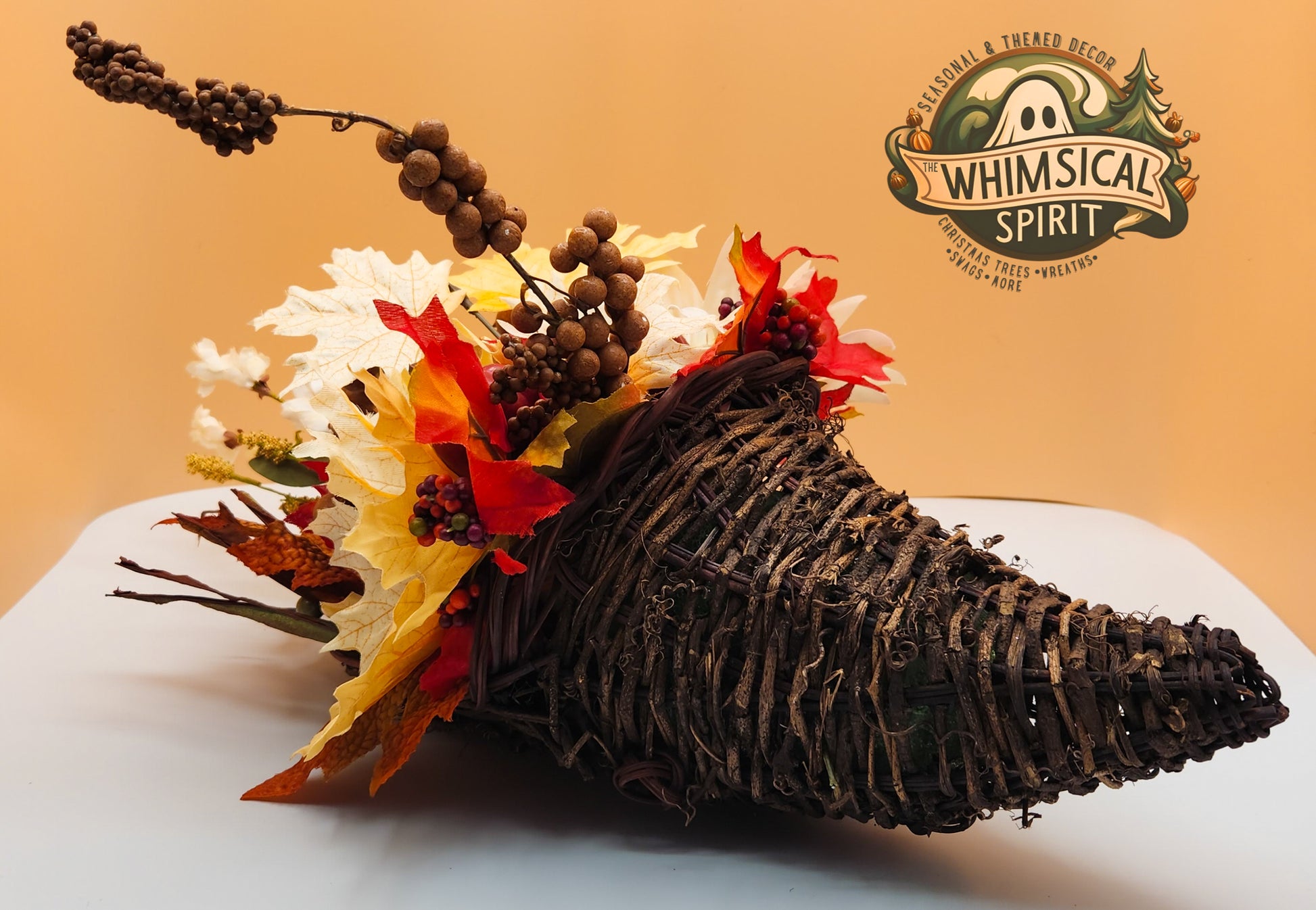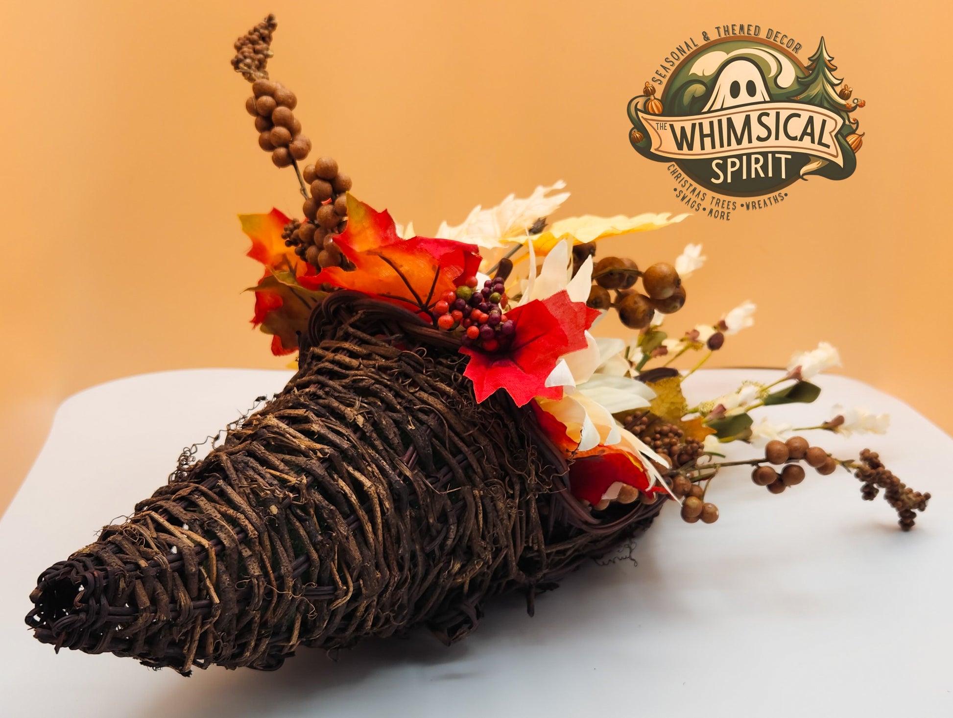 Celebrate the beauty of the season with Timeless Harvest. This elegant cornucopia centerpiece overflows with classic autumn charm—featuring creamy white pumpkins, sunflowers, berries, and fall foliage in rich seasonal tones. Designed to bring warmth and sophistication to your table, mantle, or entryway, it’s the perfect piece for Thanksgiving gatherings or adding a graceful touch of harvest abundance to your home décor.
