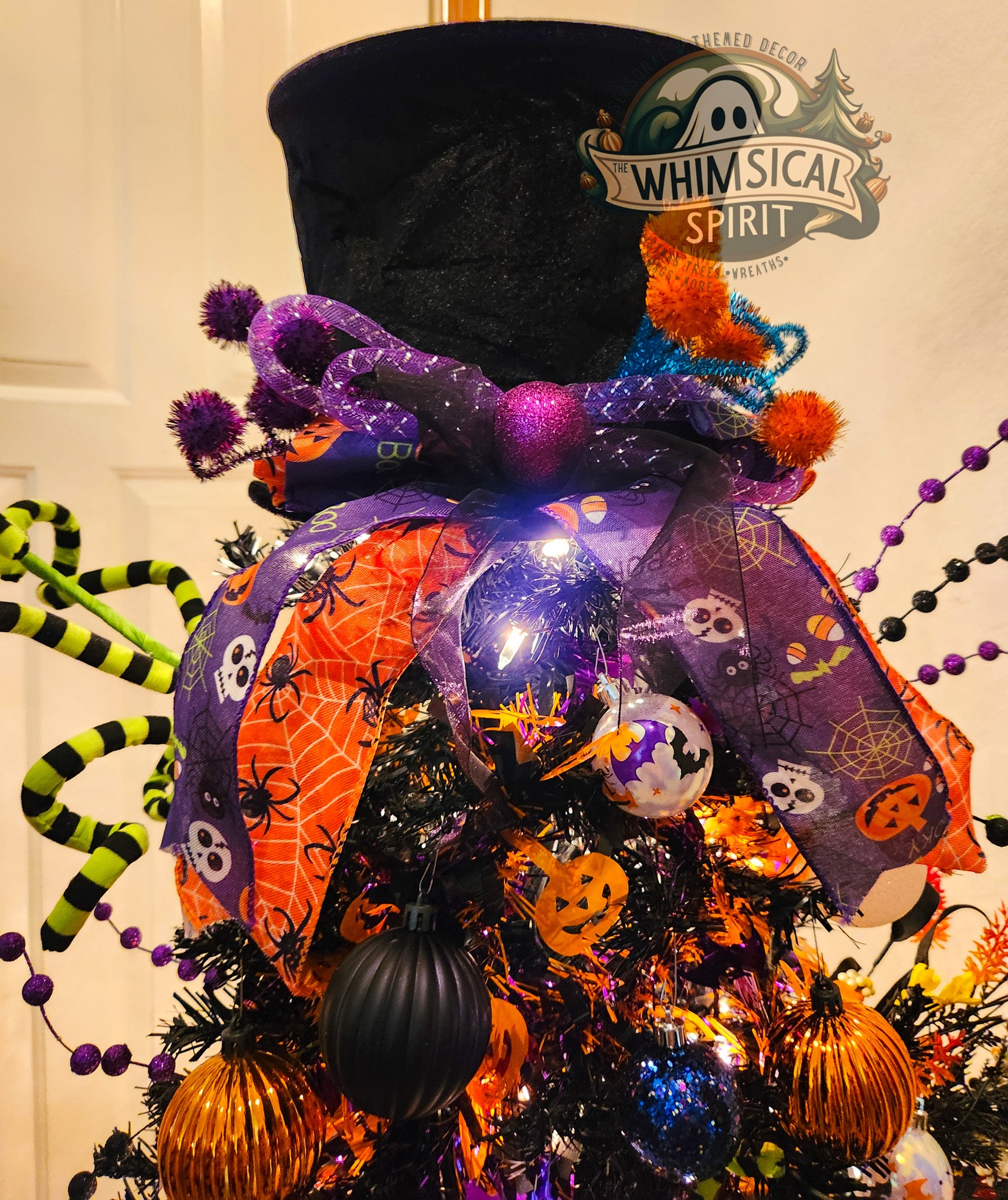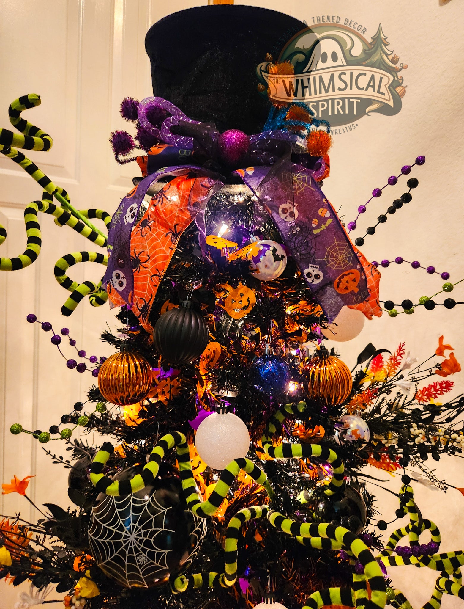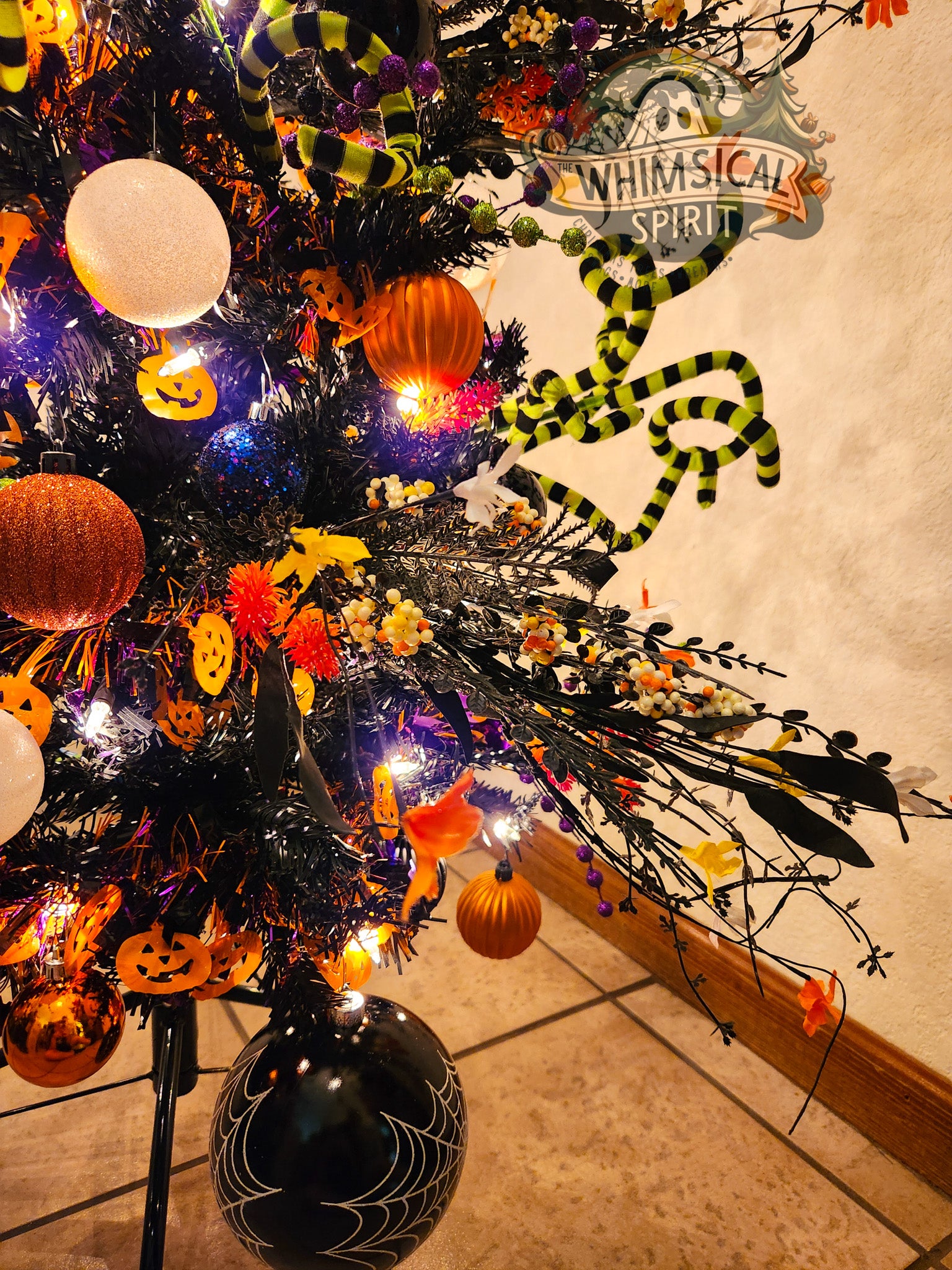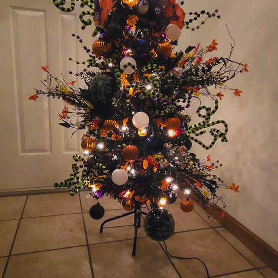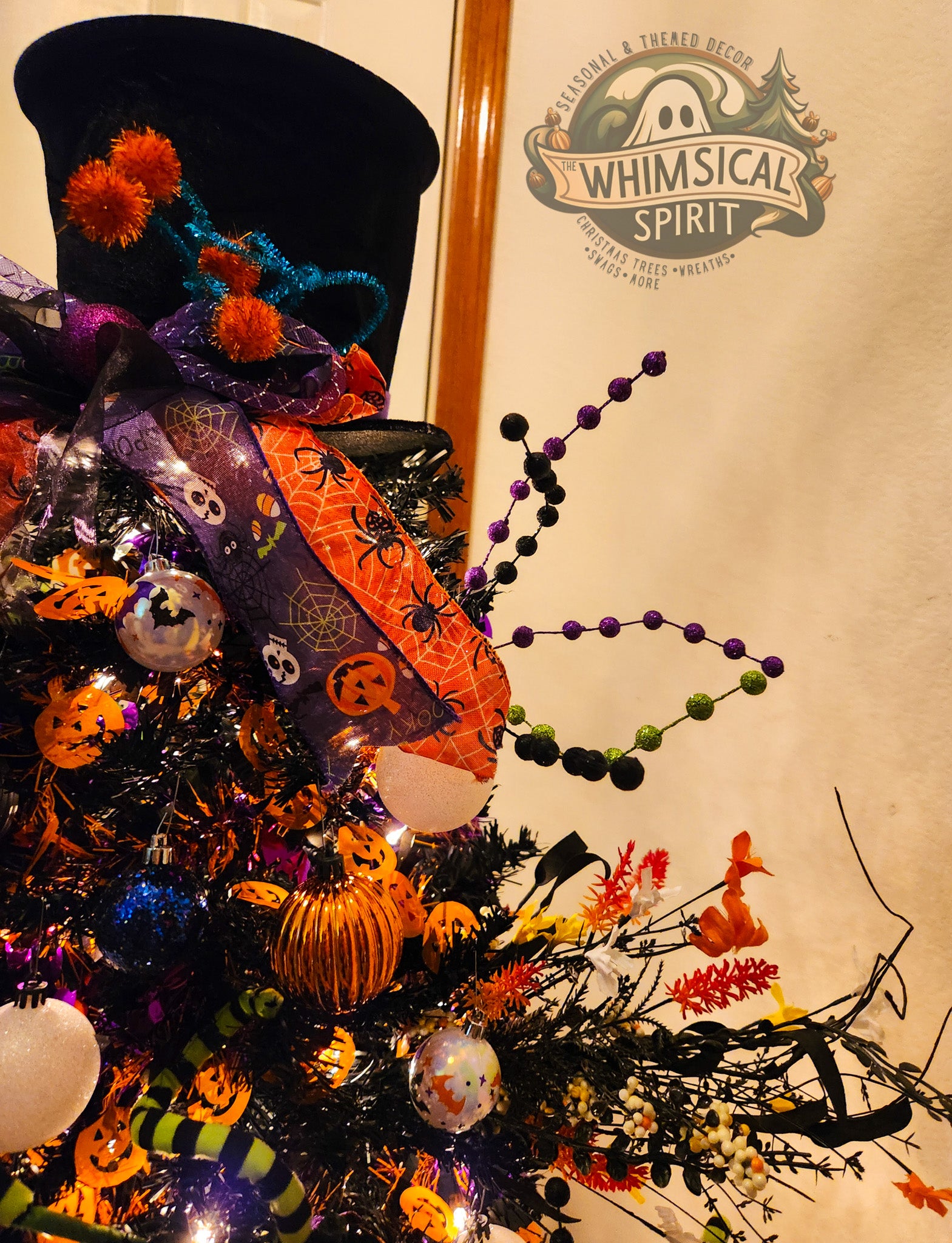 Standing at 4.5 feet tall, this mischievous black evergreen tree is where Halloween’s playful spirit meets the timeless glow of the holidays. Illuminated with clear lights, every branch dances with a glimmer that highlights its vibrant accents of orange, green, and purple. From its enchanting topper to its swirling details, the Twilight Trickster captures both the thrill of the spooky season and the joy of festive décor.