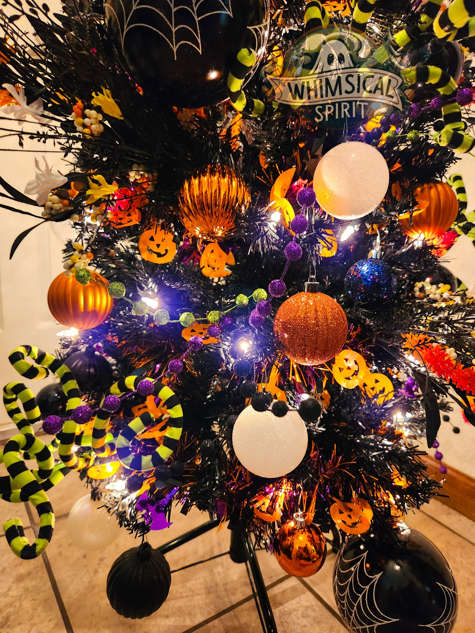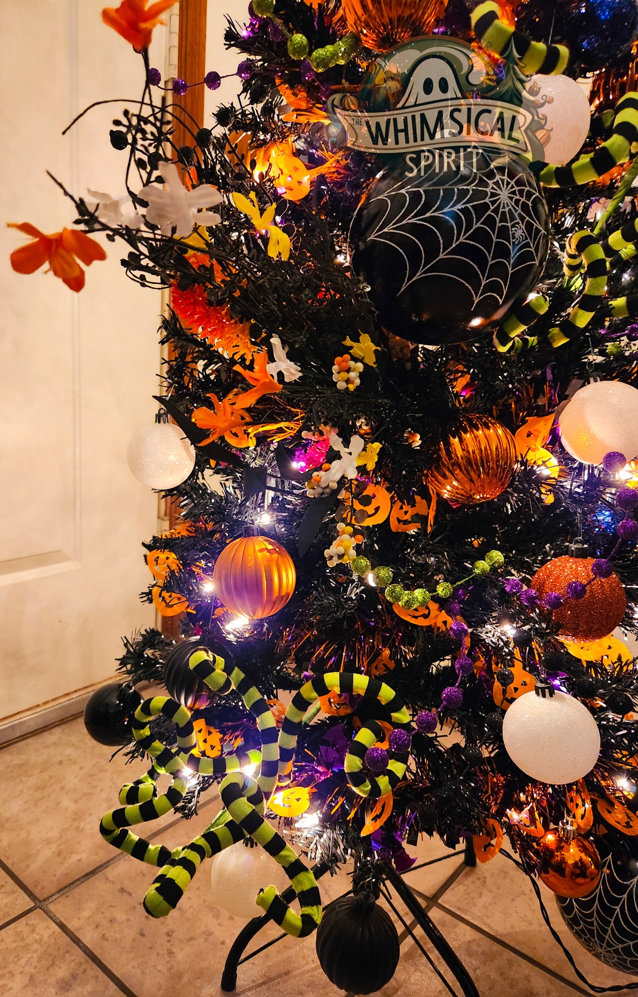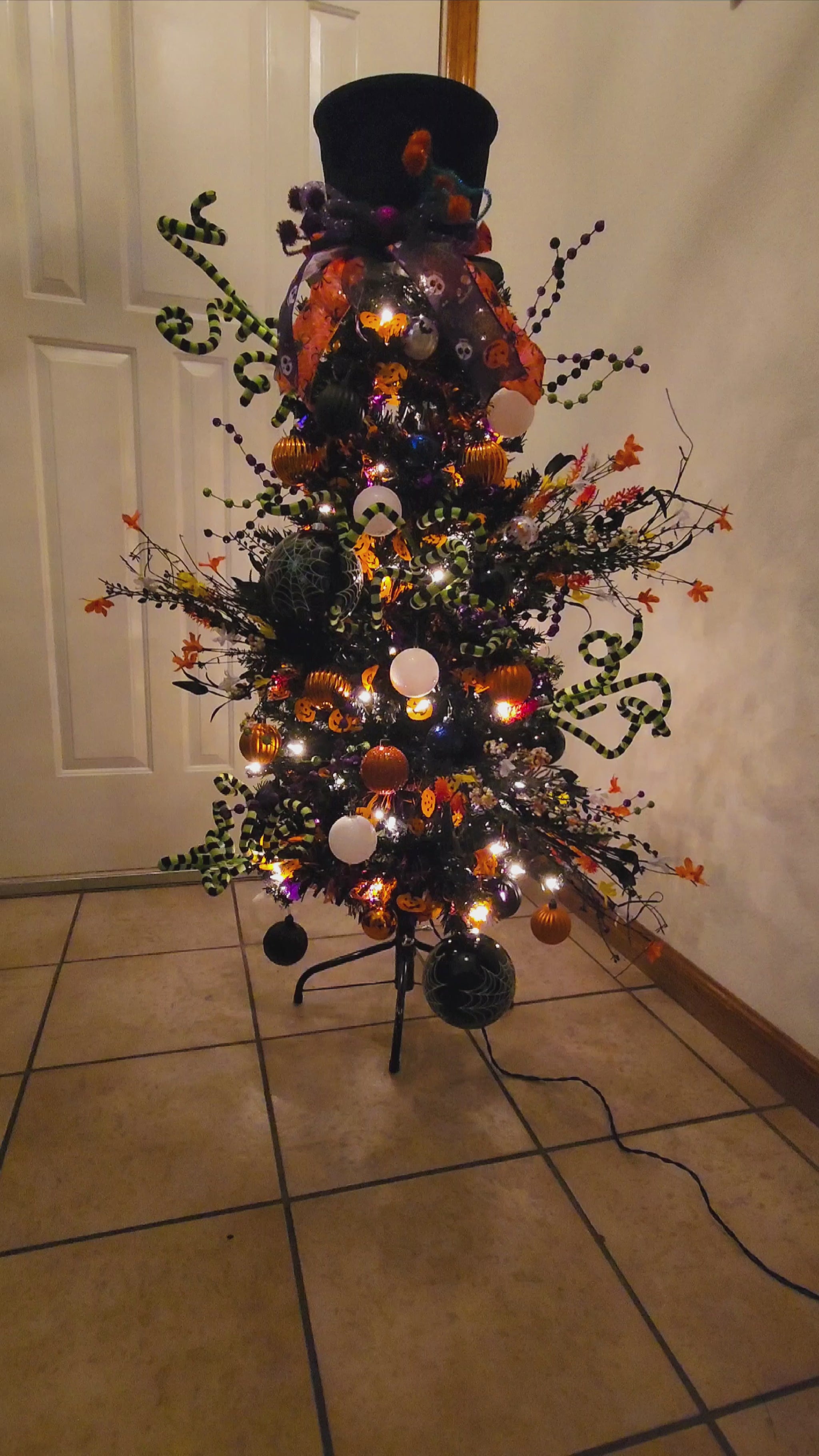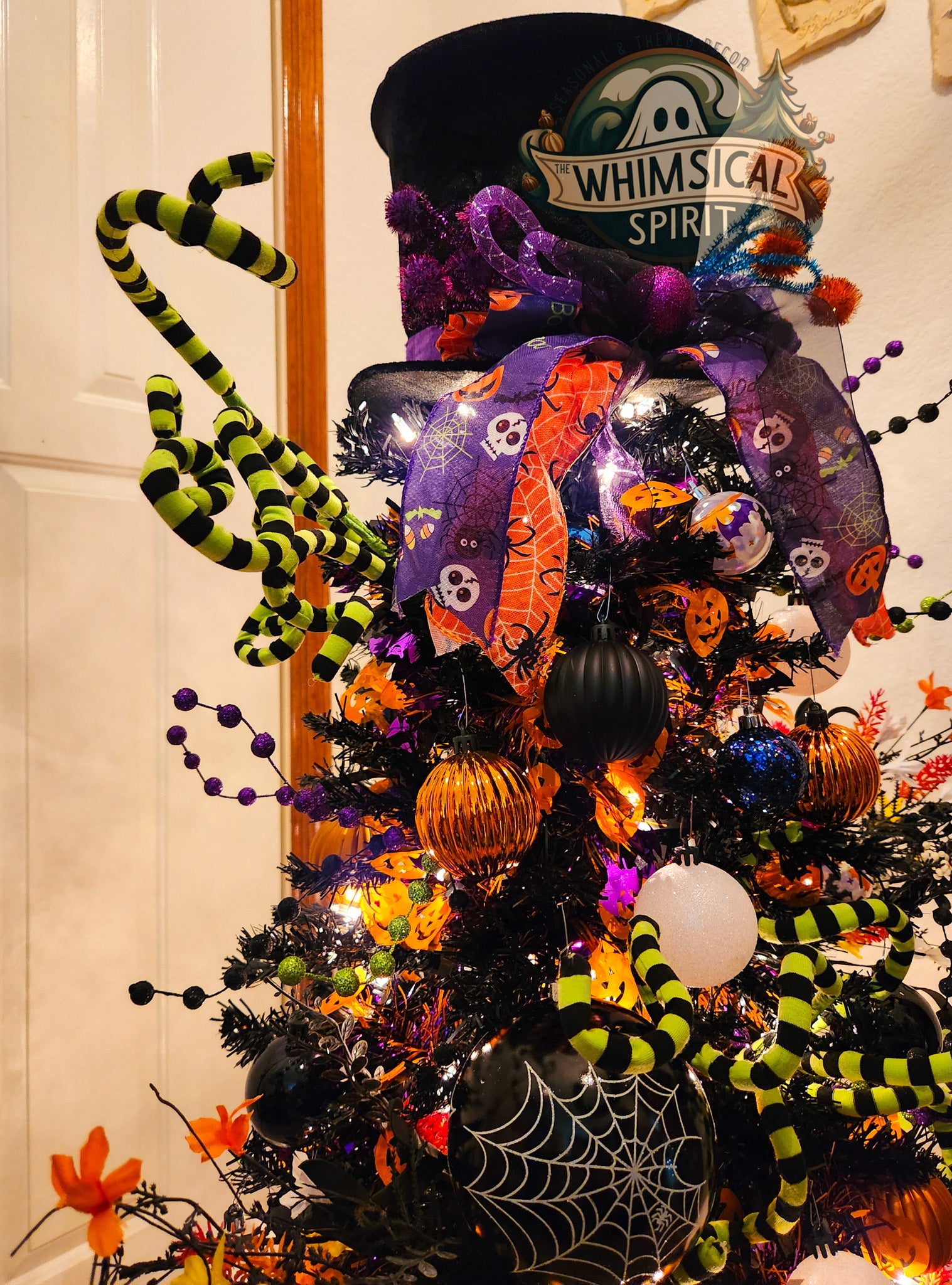 Standing at 4.5 feet tall, this mischievous black evergreen tree is where Halloween’s playful spirit meets the timeless glow of the holidays. Illuminated with clear lights, every branch dances with a glimmer that highlights its vibrant accents of orange, green, and purple. From its enchanting topper to its swirling details, the Twilight Trickster captures both the thrill of the spooky season and the joy of festive décor.