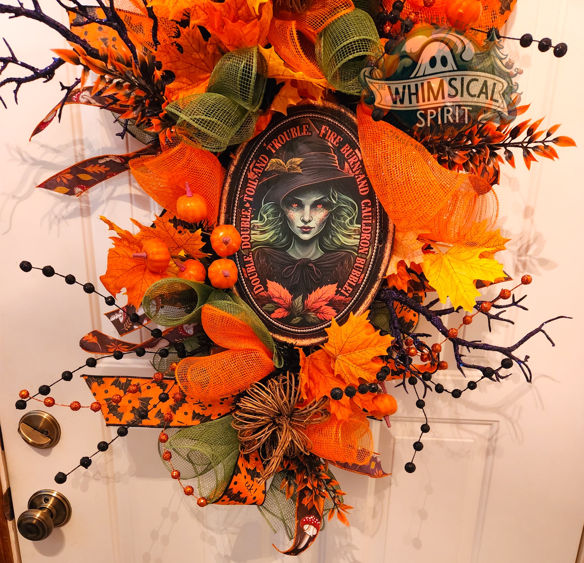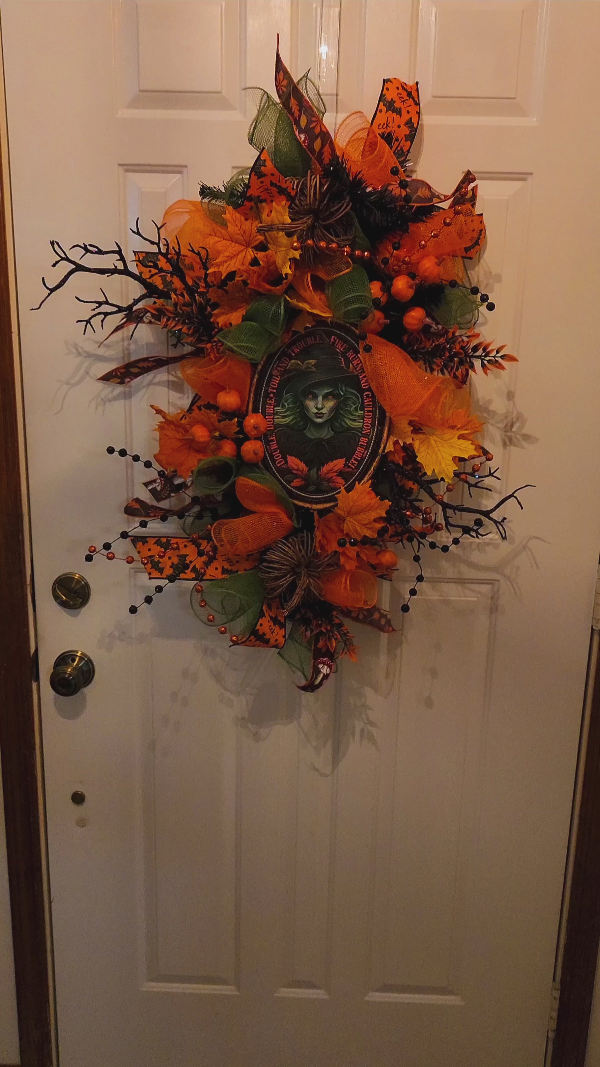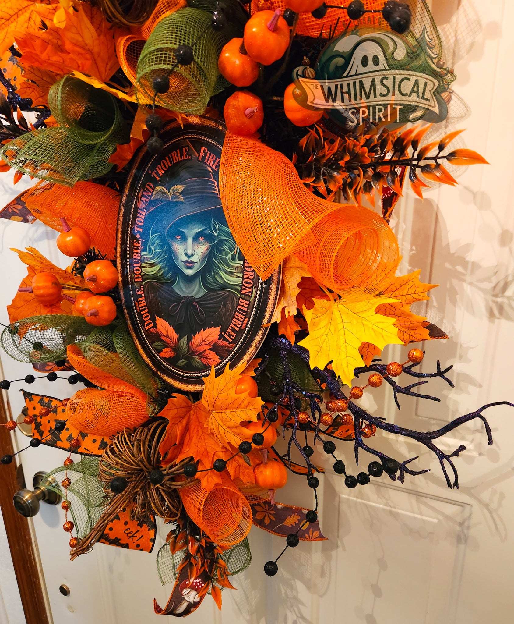 When the autumn winds begin to stir and Halloween draws near, the whispers of witches are said to drift through the night. This one-of-a-kind swag captures that very feeling — a spellbinding mix of fiery oranges, mysterious blacks, and rich autumn tones that bring both warmth and wonder to your doorway. At its heart rests a watchful witch, ready to weave her magic while leaves, branches, and playful curls seem to dance around her. Wicked Whispers is more than just decoration — it’s a story of enchantment, a welcoming charm for trick-or-treaters, and a reminder that Halloween is the season where magic truly comes alive.