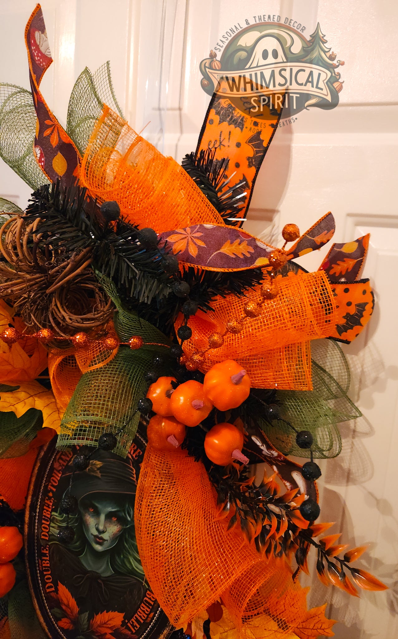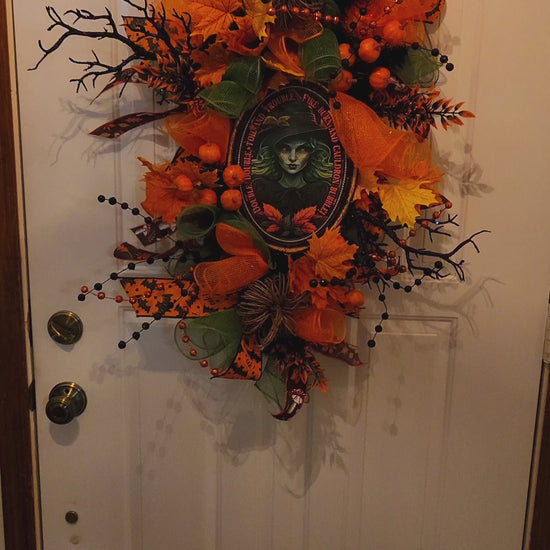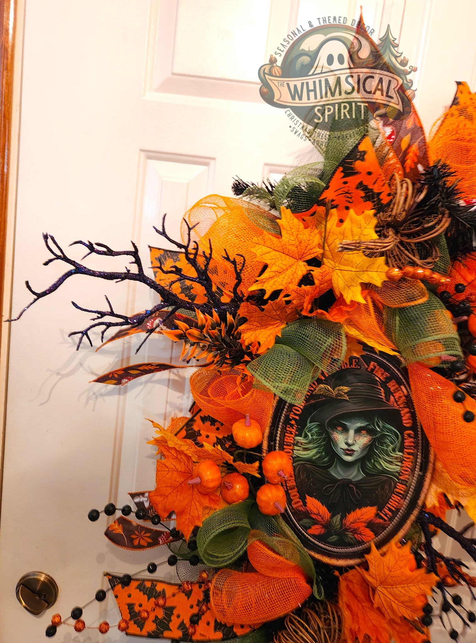 When the autumn winds begin to stir and Halloween draws near, the whispers of witches are said to drift through the night. This one-of-a-kind swag captures that very feeling — a spellbinding mix of fiery oranges, mysterious blacks, and rich autumn tones that bring both warmth and wonder to your doorway. At its heart rests a watchful witch, ready to weave her magic while leaves, branches, and playful curls seem to dance around her. Wicked Whispers is more than just decoration — it’s a story of enchantment, a welcoming charm for trick-or-treaters, and a reminder that Halloween is the season where magic truly comes alive.