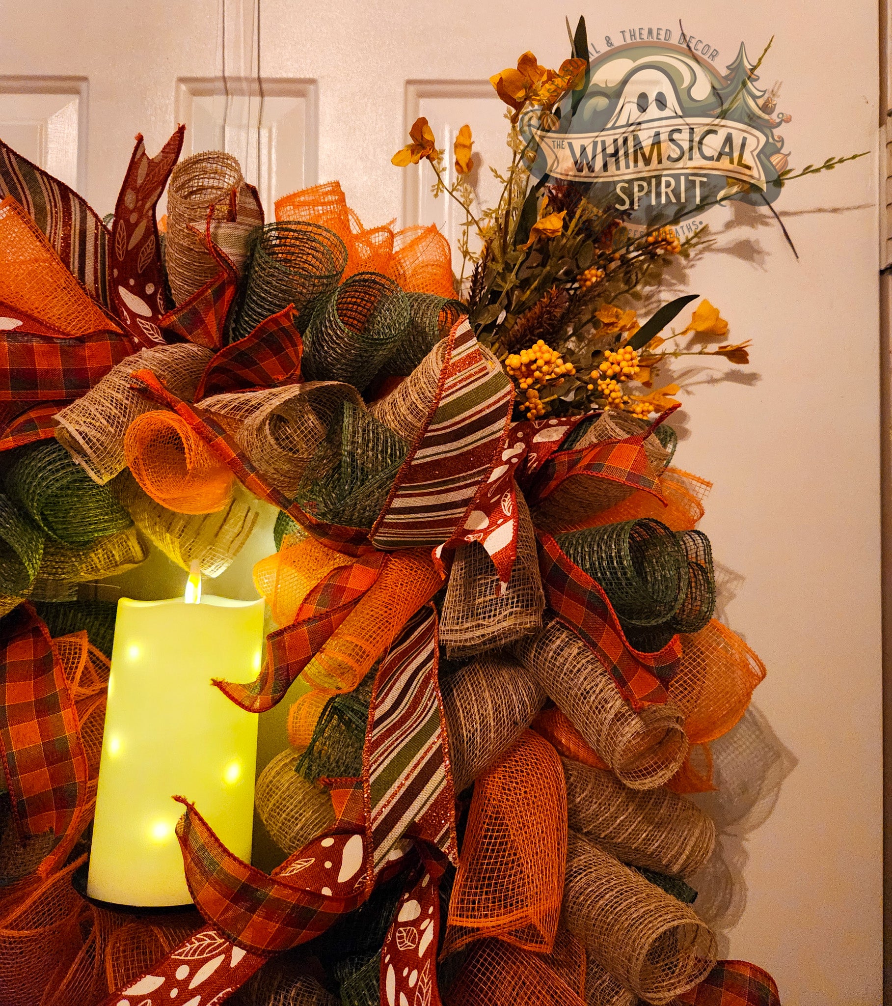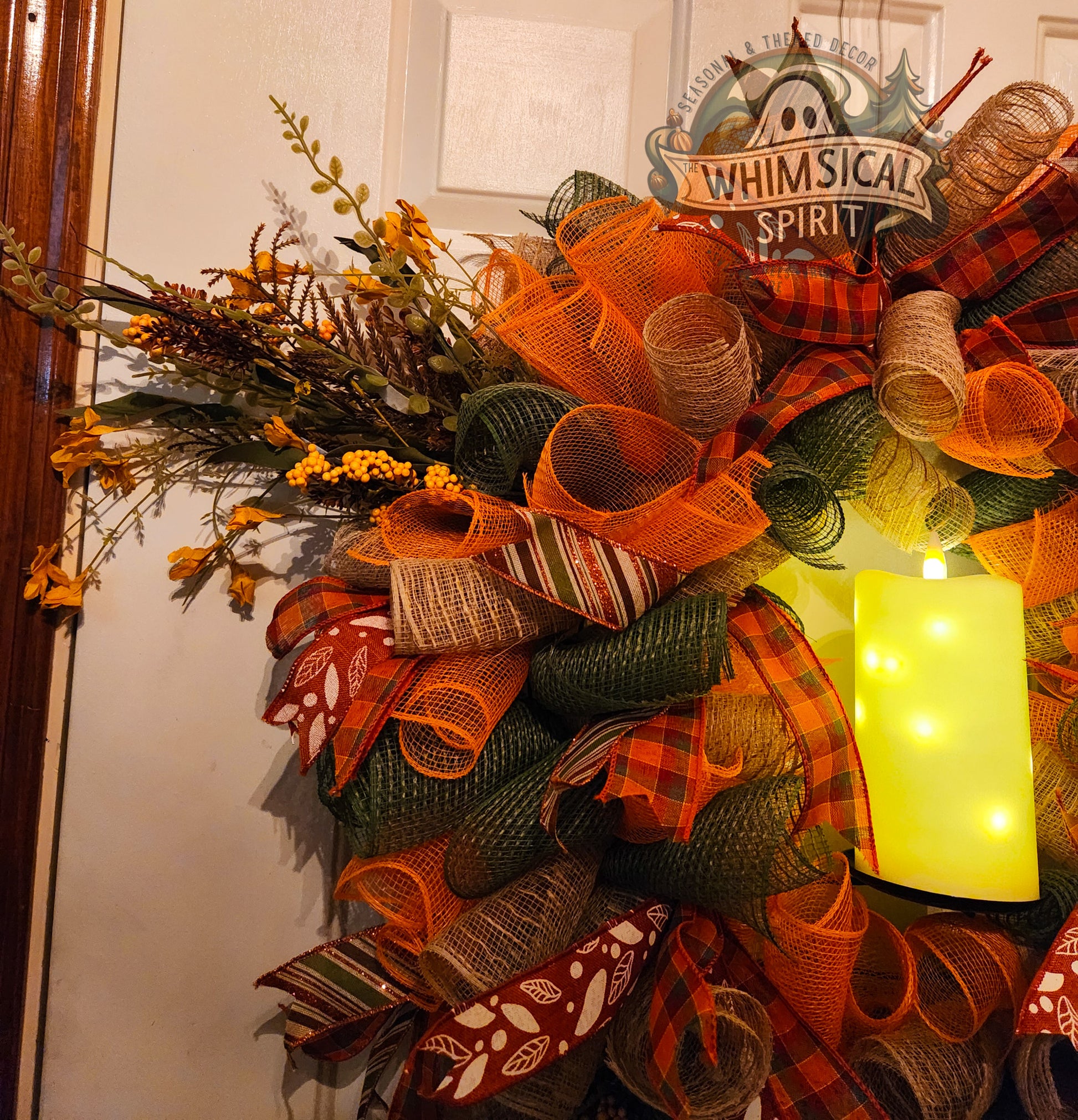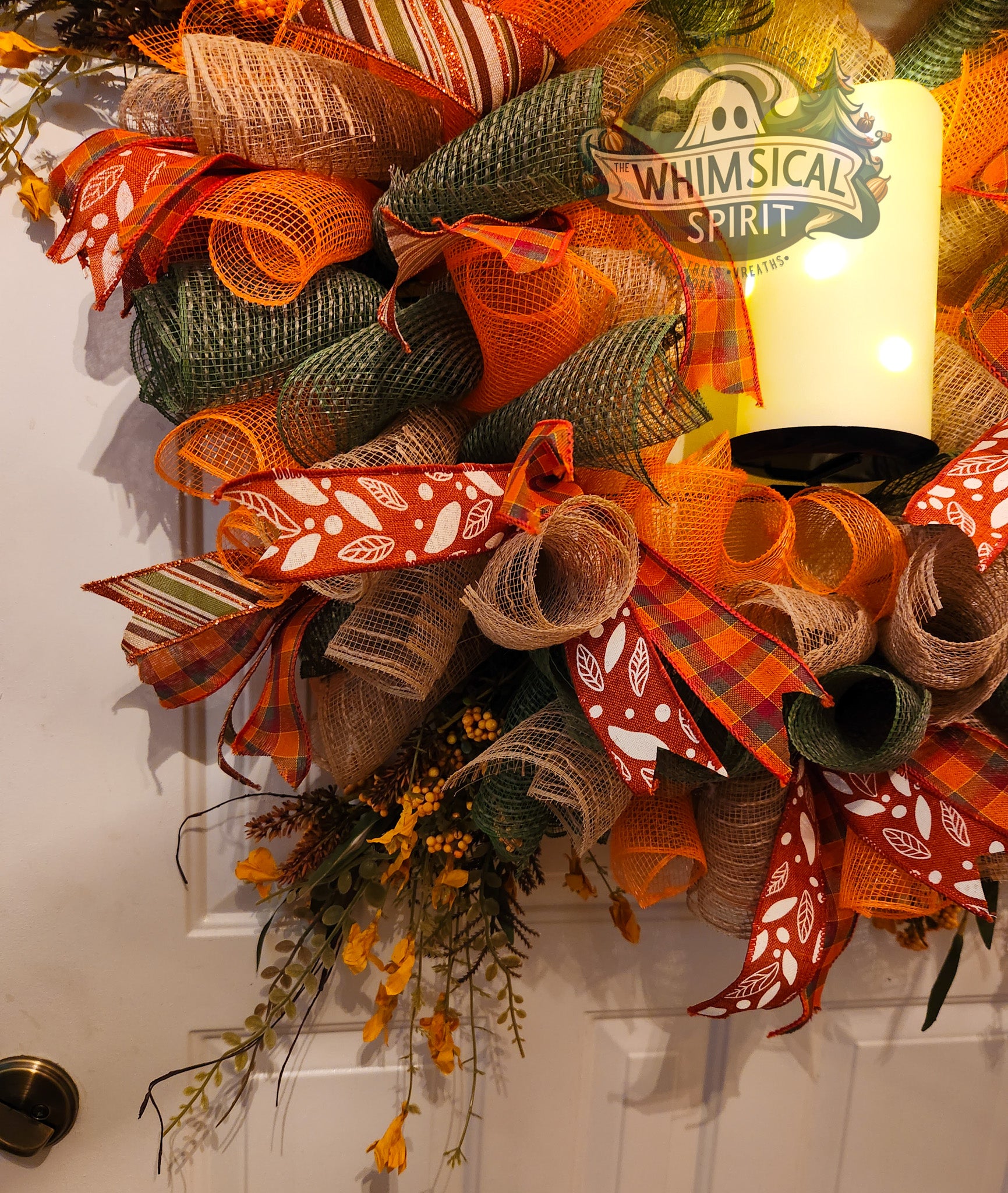 Delicate and timeless, this wreath captures the quiet beauty of the fall season. Rich layers of burlap, mesh, and plaid ribbon in warm earthy tones swirl together with soft golden accents, while sprigs of foliage add a natural, graceful finish. The design feels both elegant and inviting, making it the perfect piece to welcome guests throughout the season. Willow Whispers is a one-of-a-kind wreath that brings a sense of warmth and serenity to any home.