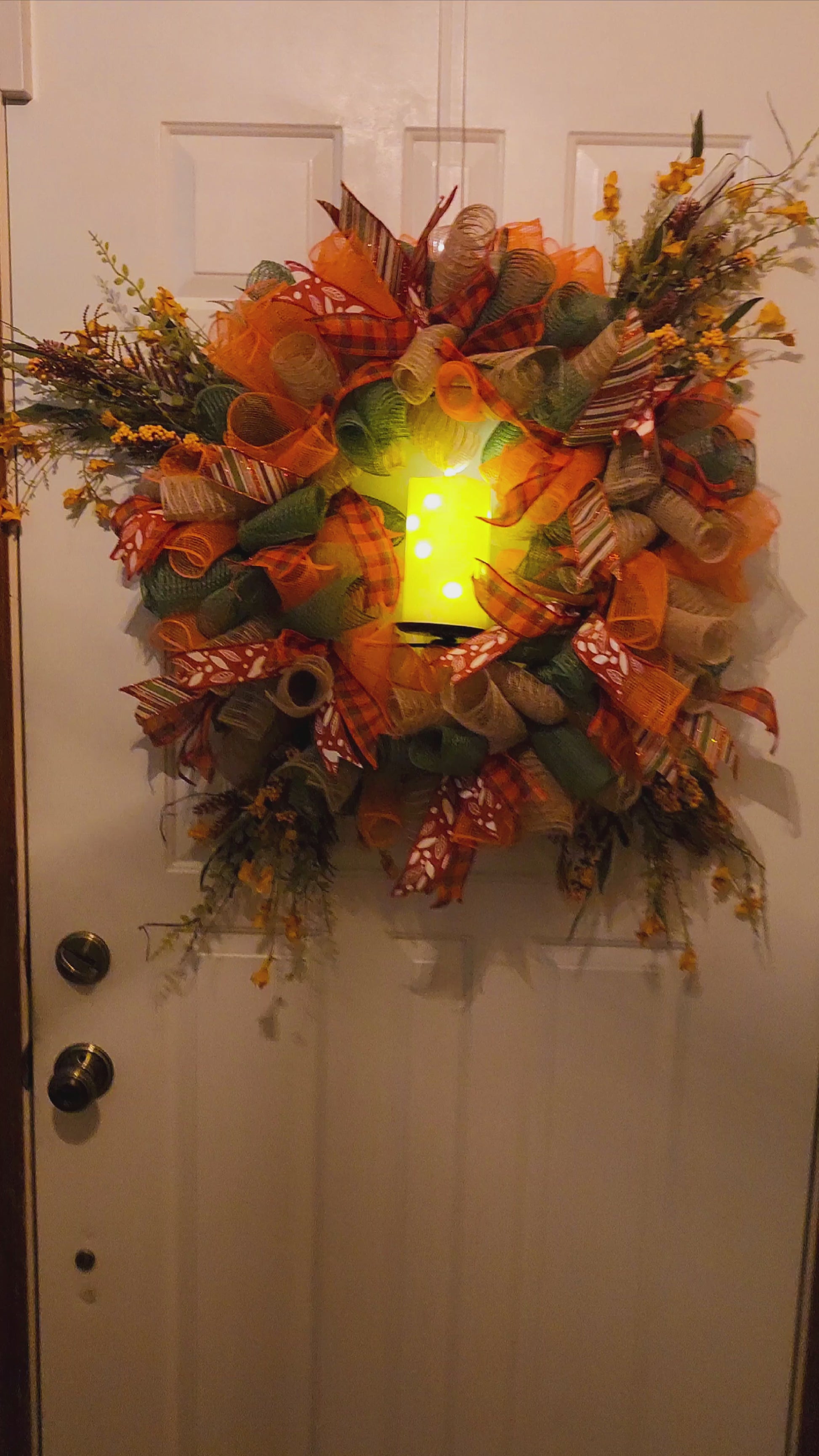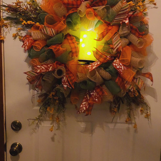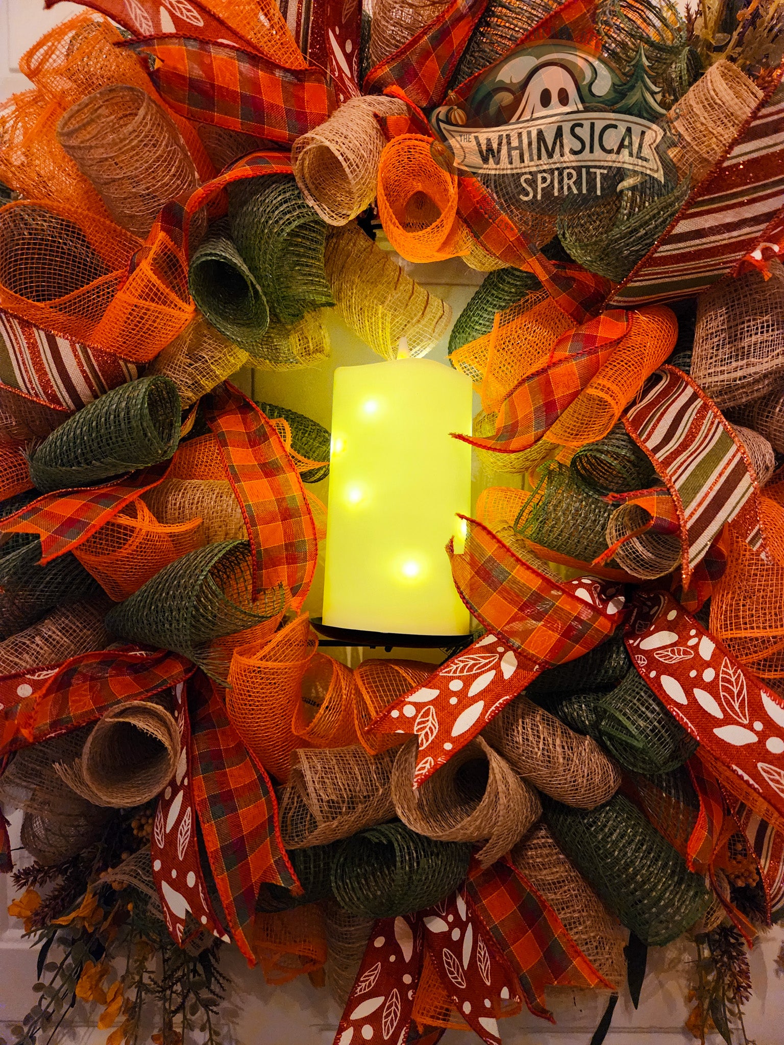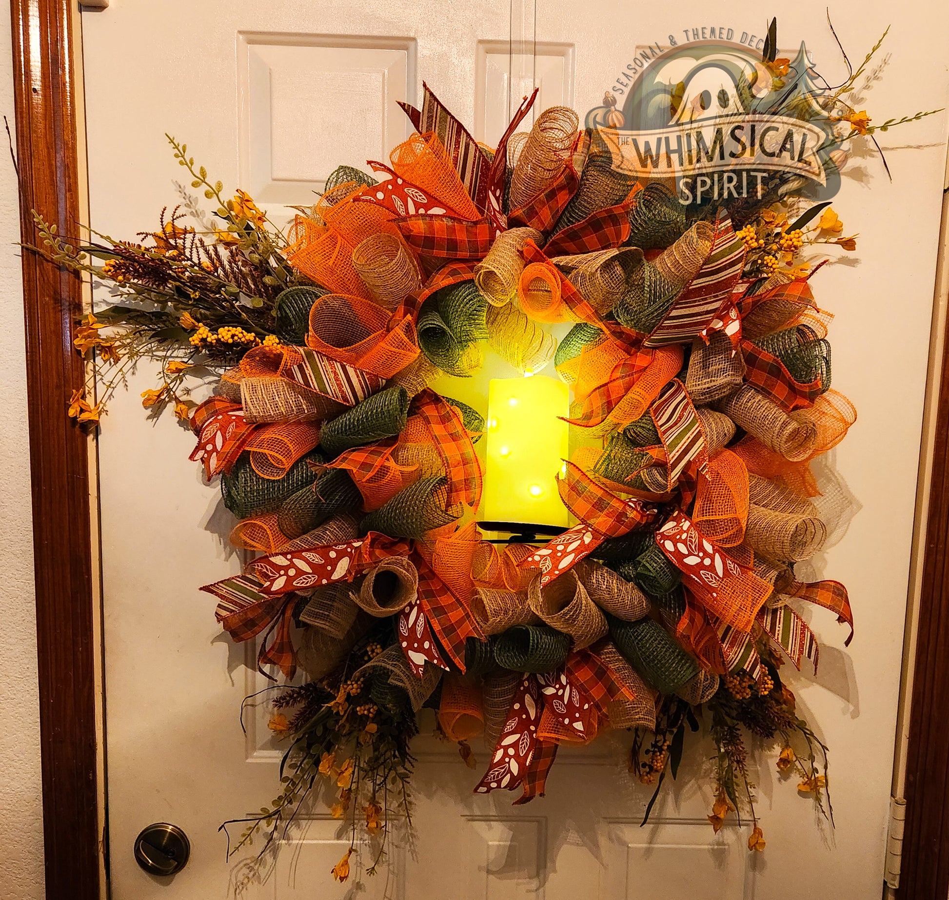 Delicate and timeless, this wreath captures the quiet beauty of the fall season. Rich layers of burlap, mesh, and plaid ribbon in warm earthy tones swirl together with soft golden accents, while sprigs of foliage add a natural, graceful finish. The design feels both elegant and inviting, making it the perfect piece to welcome guests throughout the season. Willow Whispers is a one-of-a-kind wreath that brings a sense of warmth and serenity to any home.