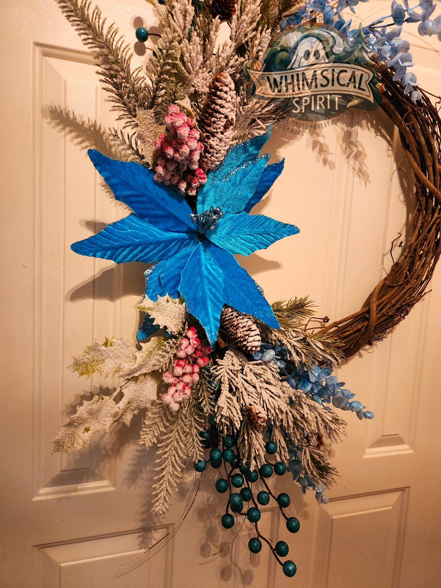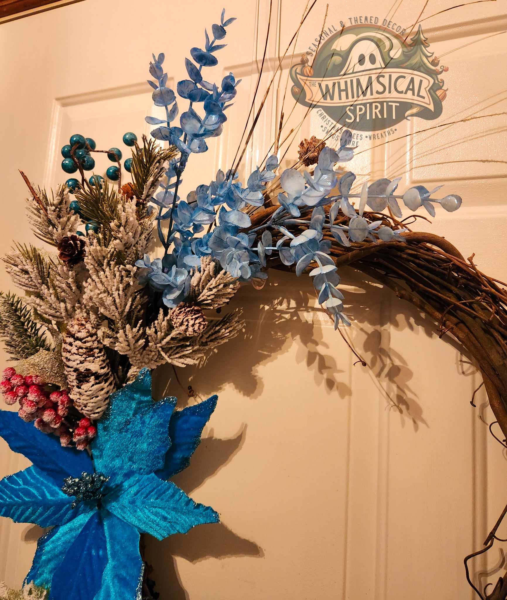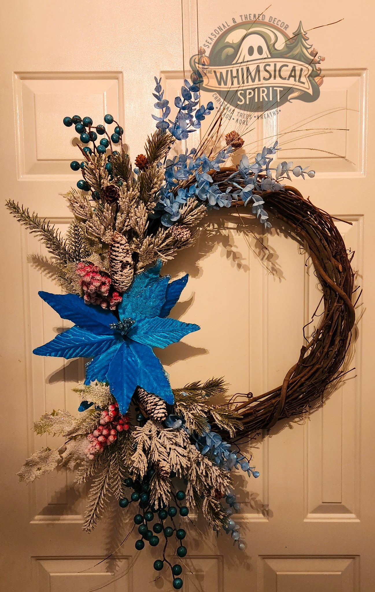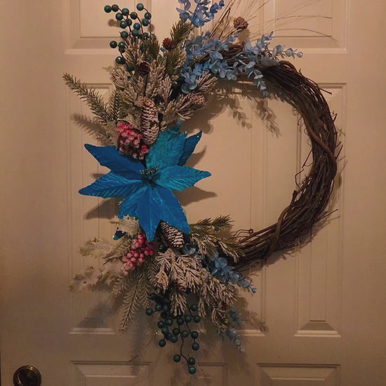 Like a quiet snowfall under moonlight, Winter’s Whisper captures the serene beauty of the season in a swirl of frosted pine, icy blue blooms, and delicate berries. A single shimmering poinsettia serves as the heart of the design - radiant yet tranquil - while dusted evergreens and grapevine branches evoke the hush of a winter forest.