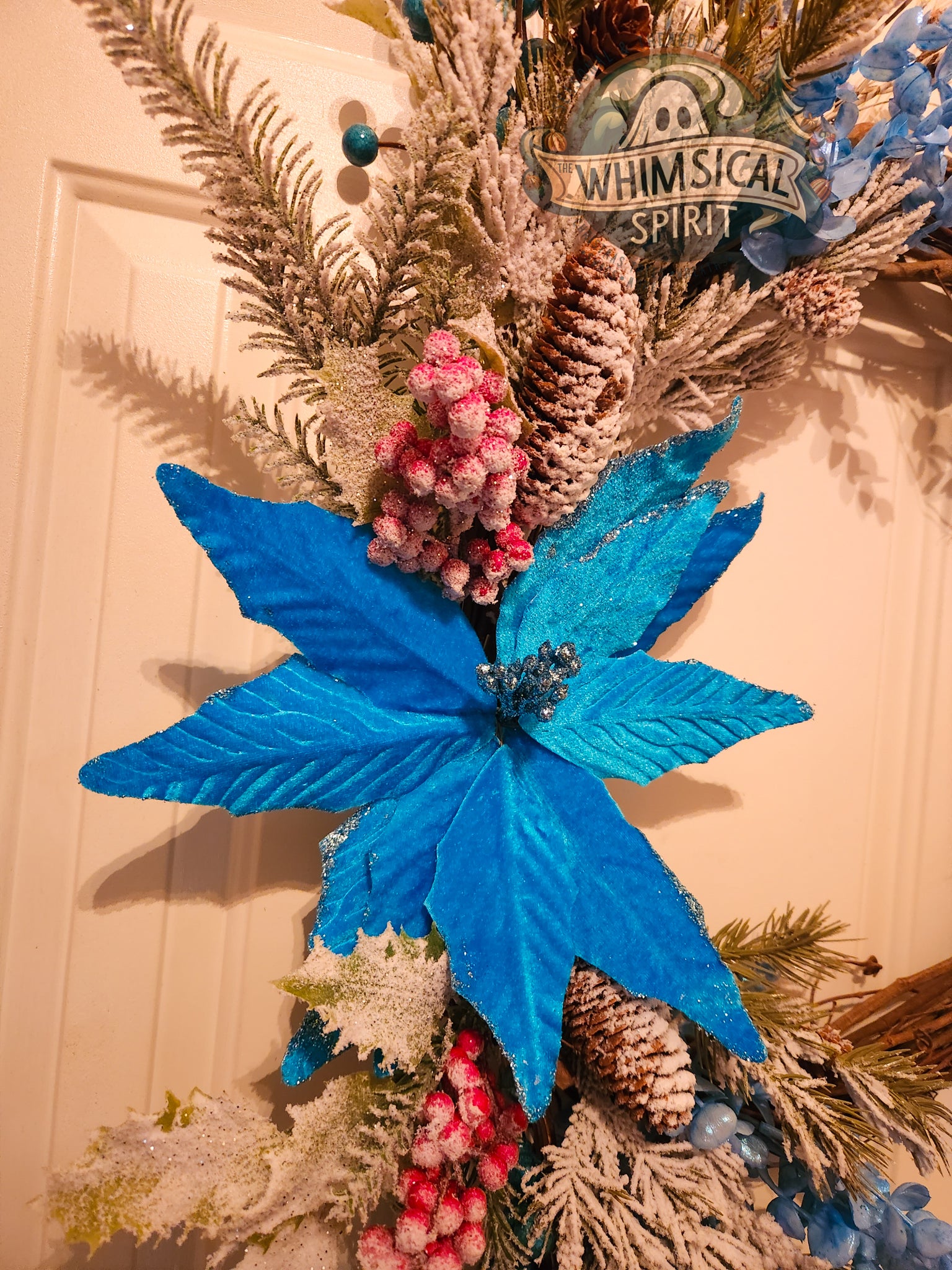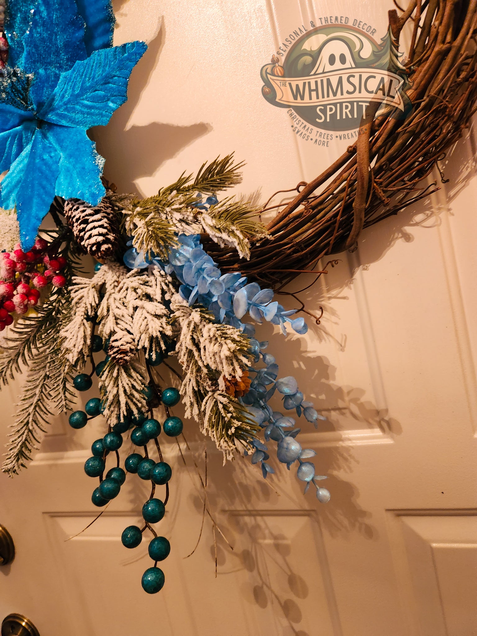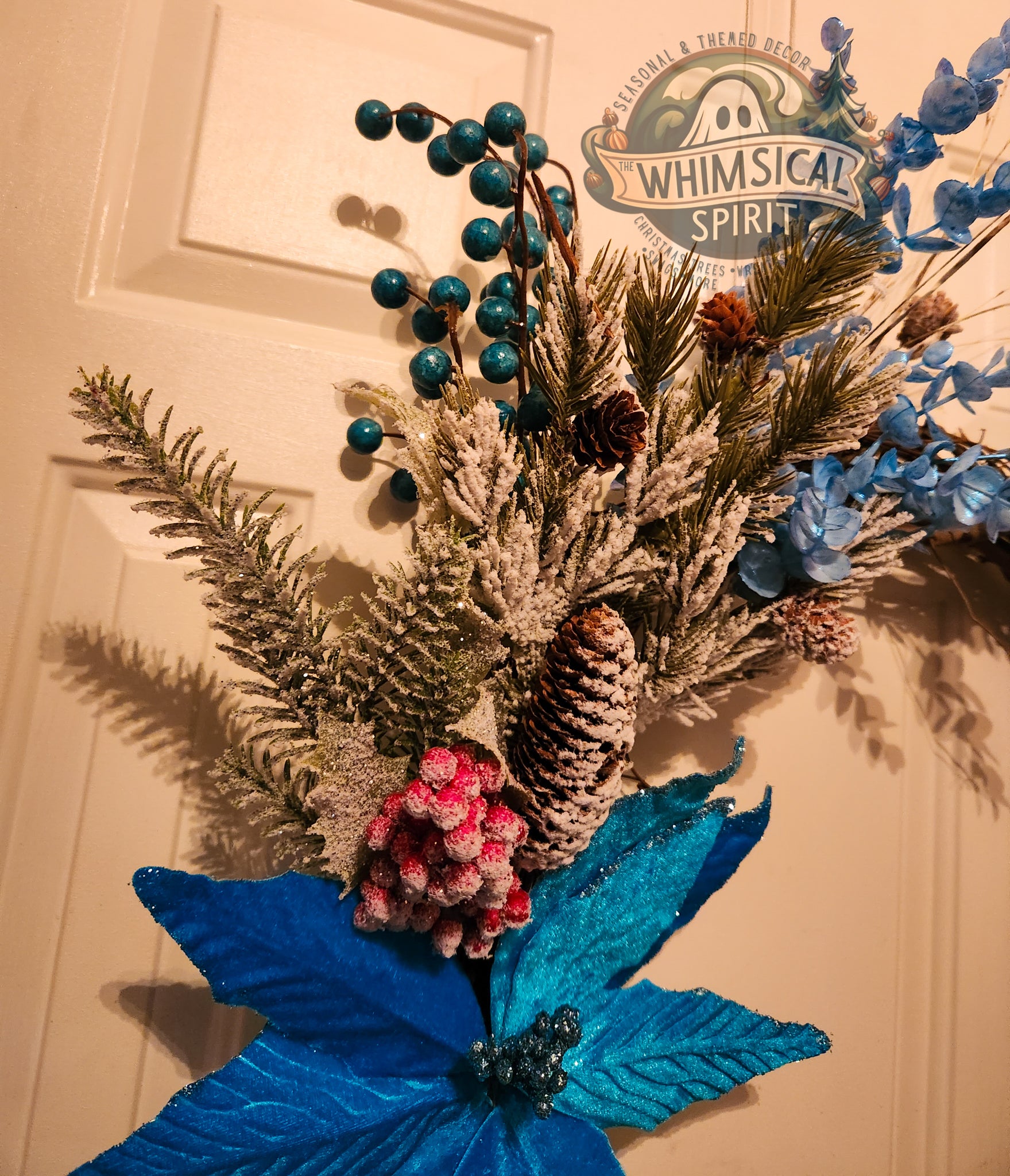 Like a quiet snowfall under moonlight, Winter’s Whisper captures the serene beauty of the season in a swirl of frosted pine, icy blue blooms, and delicate berries. A single shimmering poinsettia serves as the heart of the design - radiant yet tranquil - while dusted evergreens and grapevine branches evoke the hush of a winter forest.